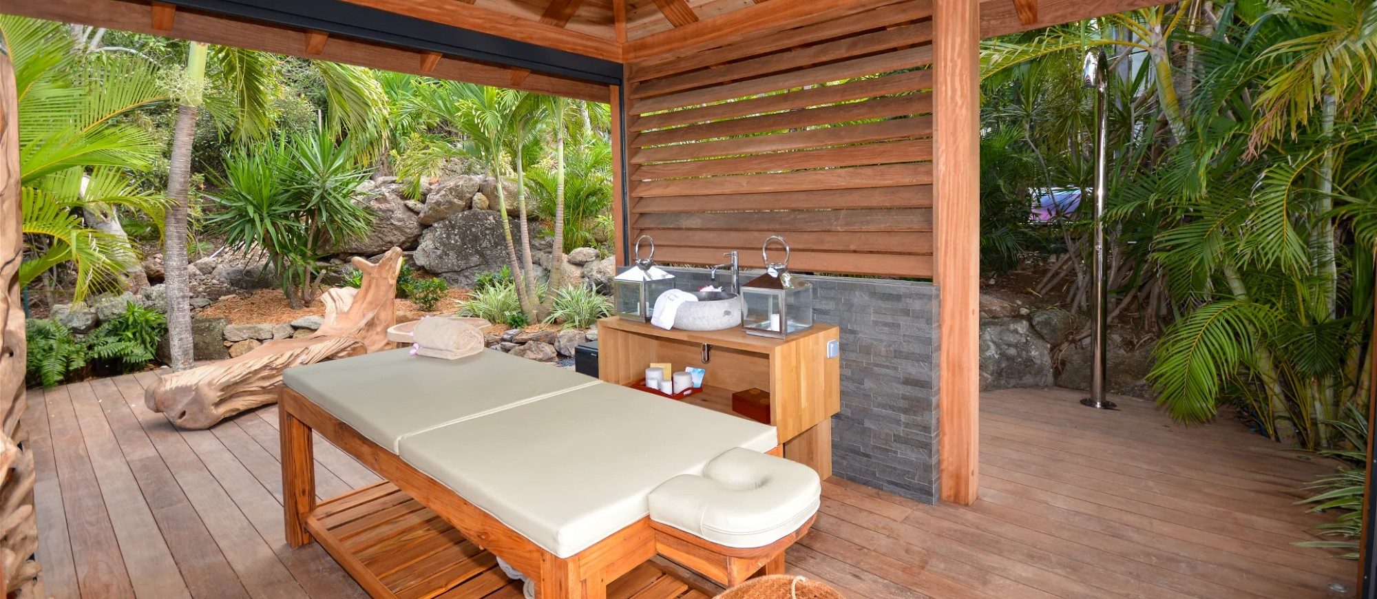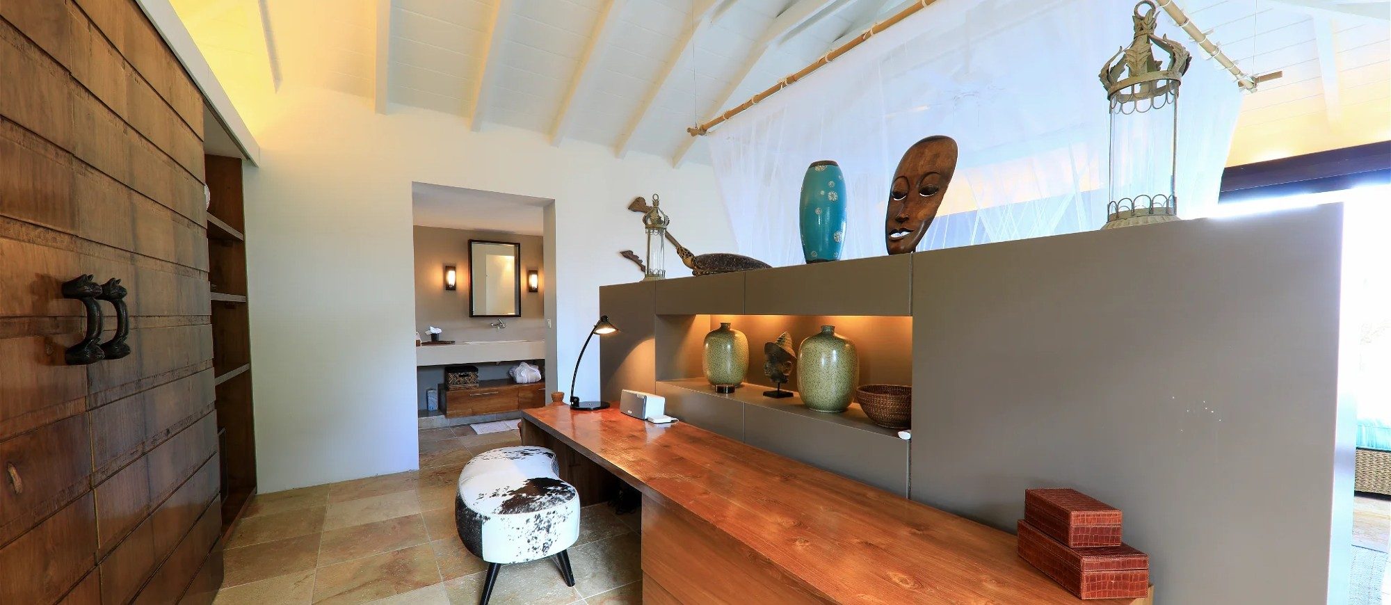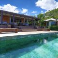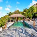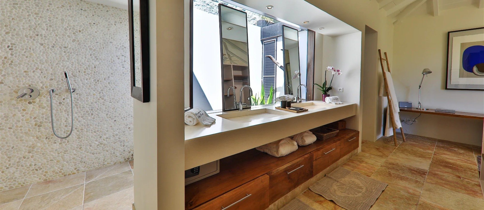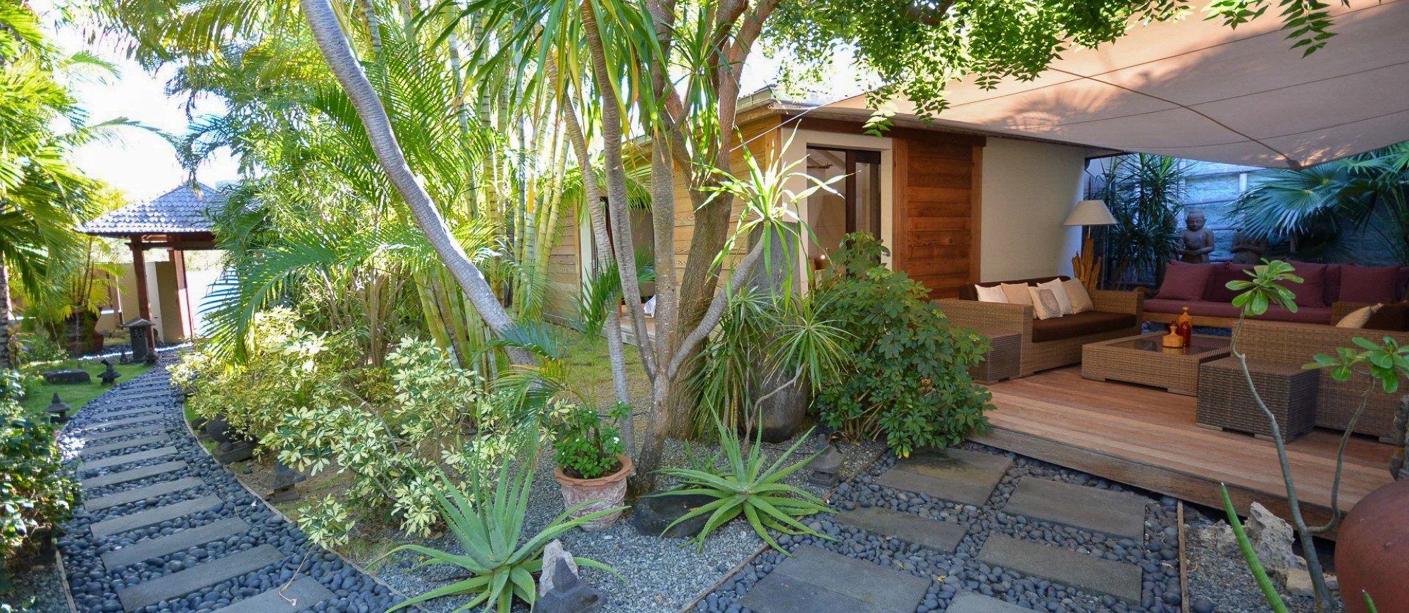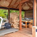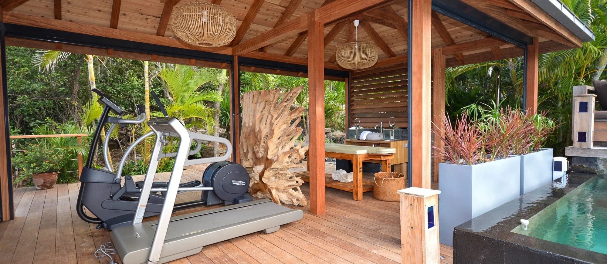 The property is composed of five large air-conditioned bedrooms furnished in Balinese style. Two of them are located in the main building, and have a king size bed, en-suite bathrooms and direct access to the swimming pool and to the garden. Two other bedrooms are located in a separate bungalow, with king size beds and private bathrooms. The fifth bedroom is located at the back of the villa with a garden view and an en-suite bathroom. It is composed of two twin beds and two single beds on the mezzanine. Finally, under an ‘ajoupa’ close to the swimming pool, there is a fitness room equipped with a massage table, elliptical trainer and treadmill.