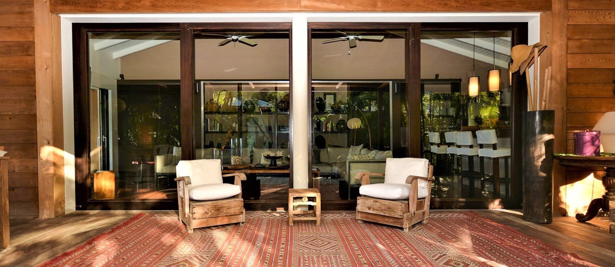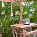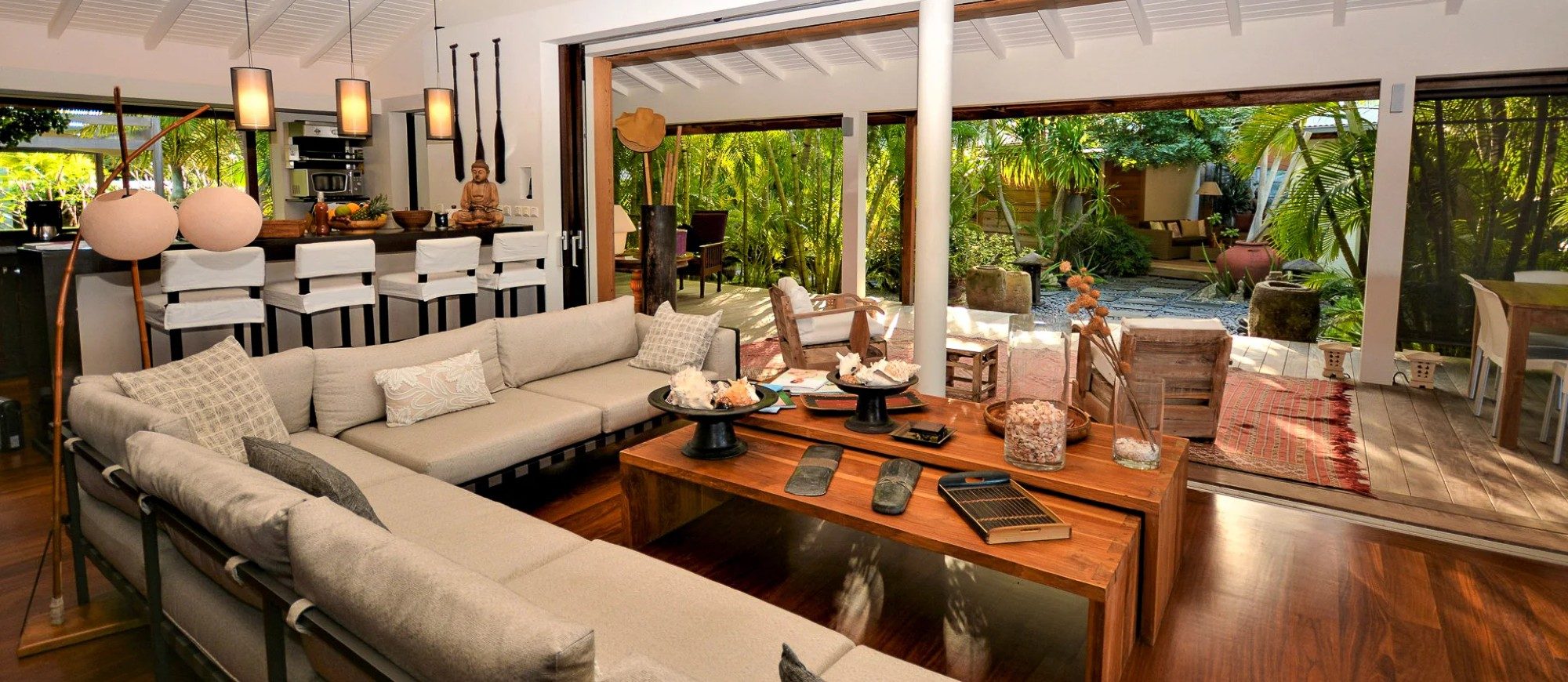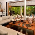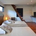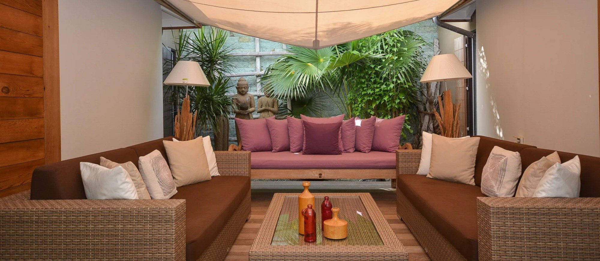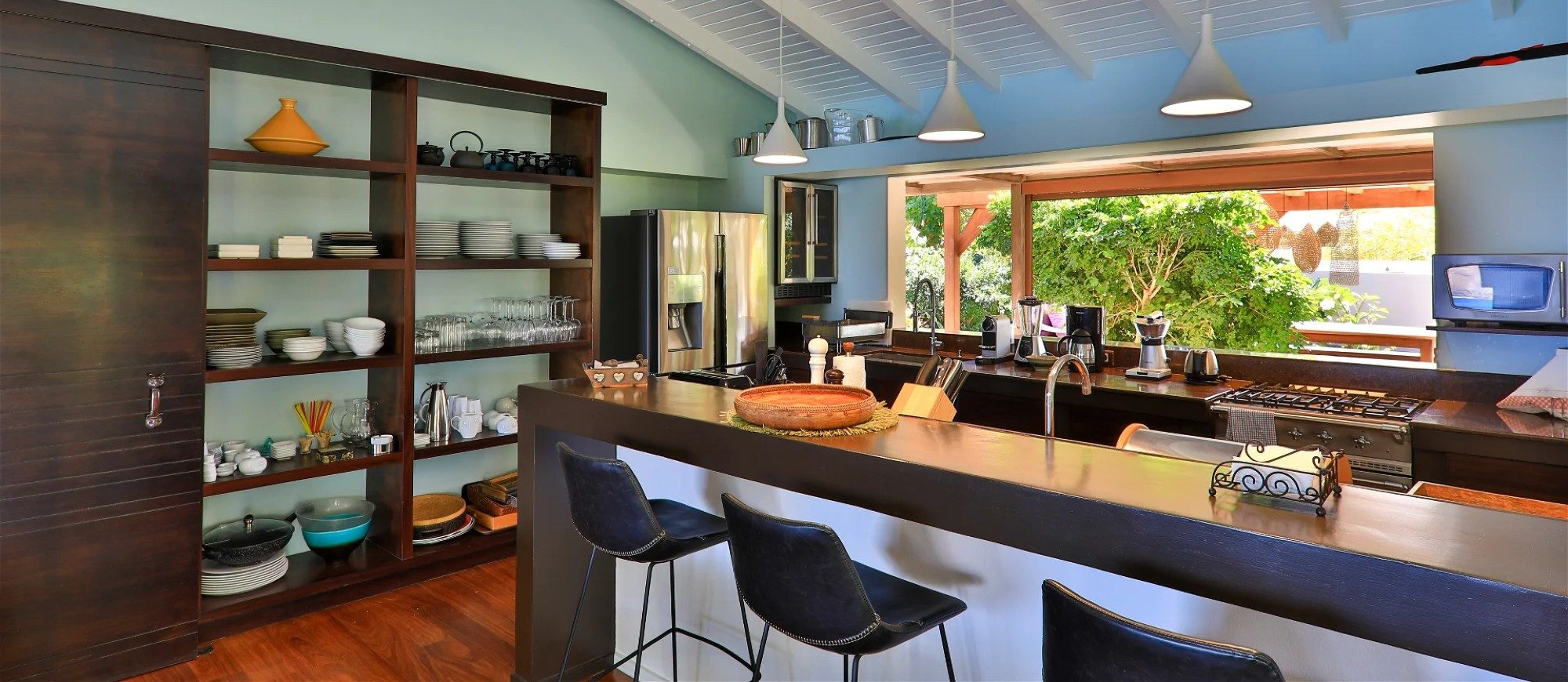 The property is composed of five large air-conditioned bedrooms furnished in Balinese style. Two of them are located in the main building, and have a king size bed, en-suite bathrooms and direct access to the swimming pool and to the garden. Two other bedrooms are located in a separate bungalow, with king size beds and private bathrooms. The fifth bedroom is located at the back of the villa with a garden view and an en-suite bathroom. It is composed of two twin beds and two single beds on the mezzanine. Finally, under an ‘ajoupa’ close to the swimming pool, there is a fitness room equipped with a massage table, elliptical trainer and treadmill.