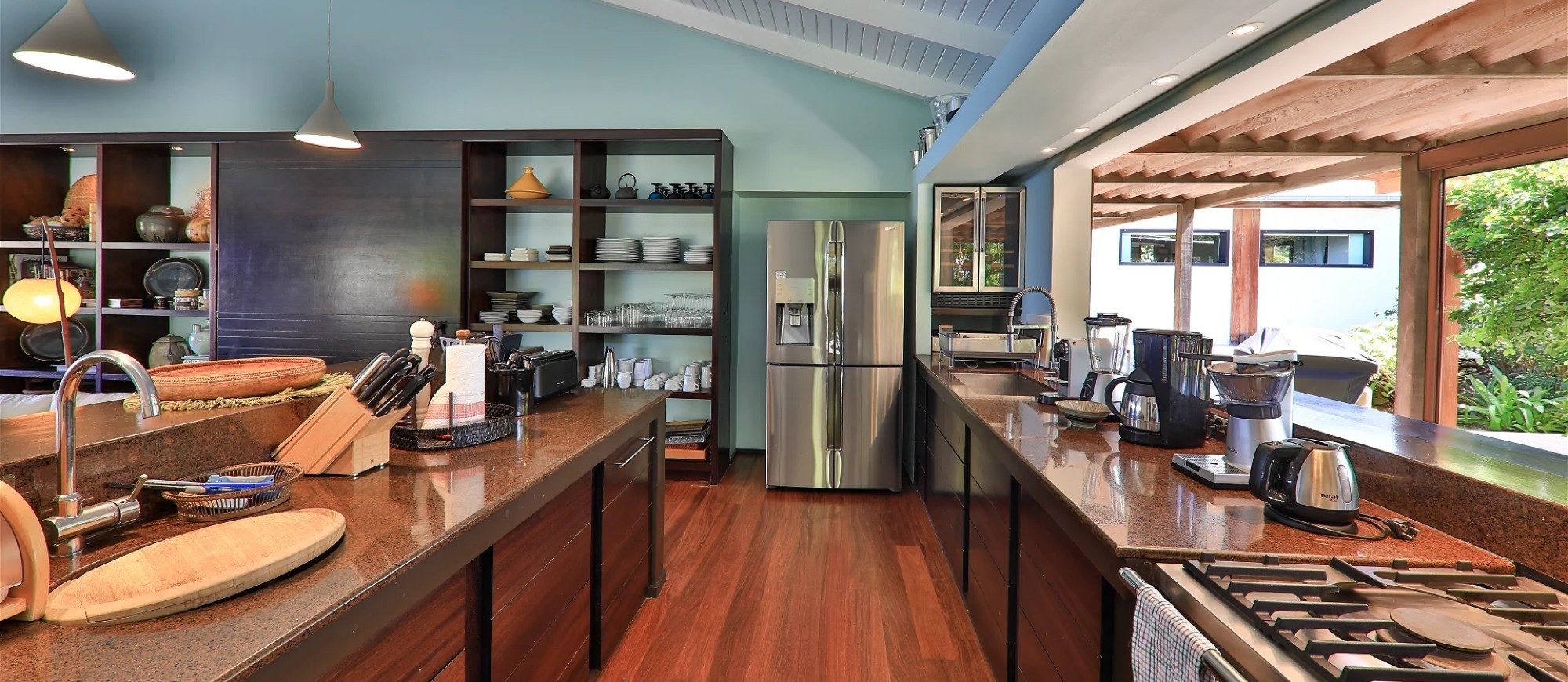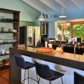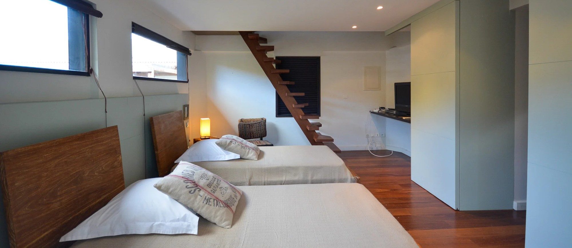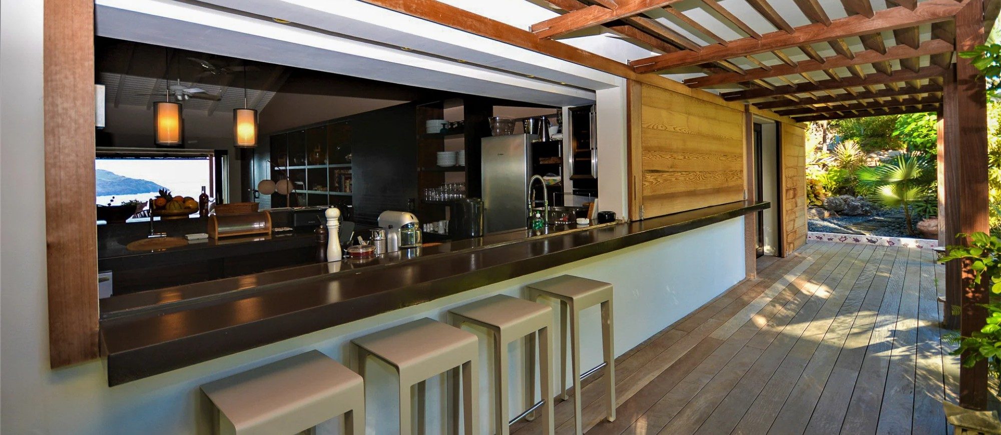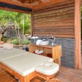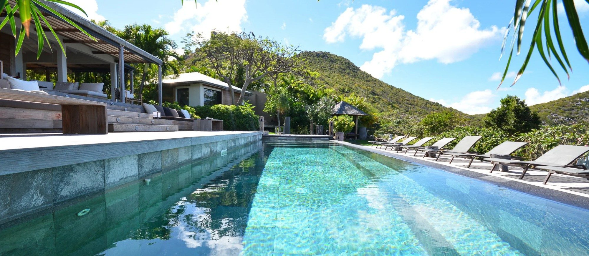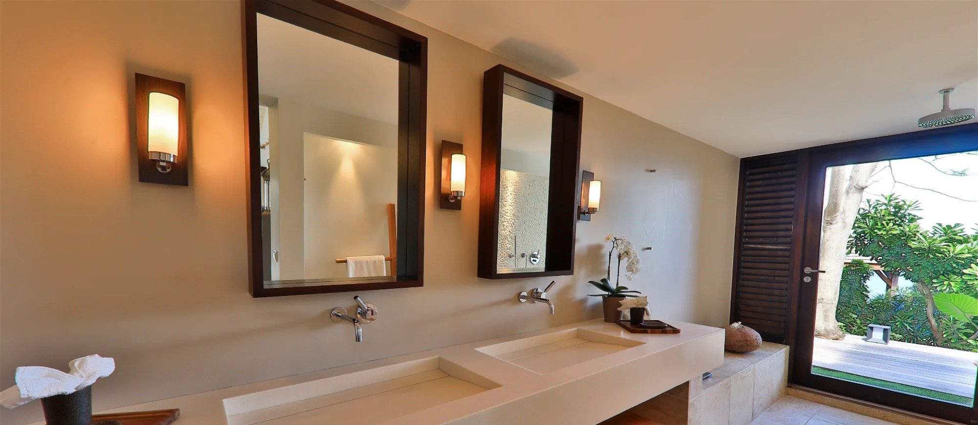 The property is composed of five large air-conditioned bedrooms furnished in Balinese style. Two of them are located in the main building, and have a king size bed, en-suite bathrooms and direct access to the swimming pool and to the garden. Two other bedrooms are located in a separate bungalow, with king size beds and private bathrooms. The fifth bedroom is located at the back of the villa with a garden view and an en-suite bathroom. It is composed of two twin beds and two single beds on the mezzanine. Finally, under an ‘ajoupa’ close to the swimming pool, there is a fitness room equipped with a massage table, elliptical trainer and treadmill.