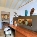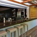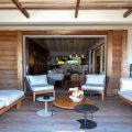 It is composed of a large living room furnished with a comfortable L-shaped sofa around a wooden table, with carpets and cushions enhancing the warm tones of the furniture. Under a mansard ceiling, the dining area located under the covered terrace is composed of a large table, chairs and soft benches. There is a well-equipped kitchen with wine cellar, ice machine and breakfast bar.