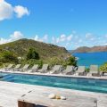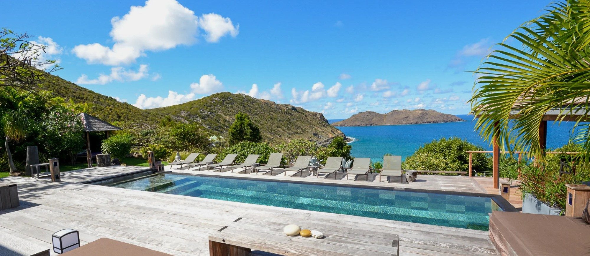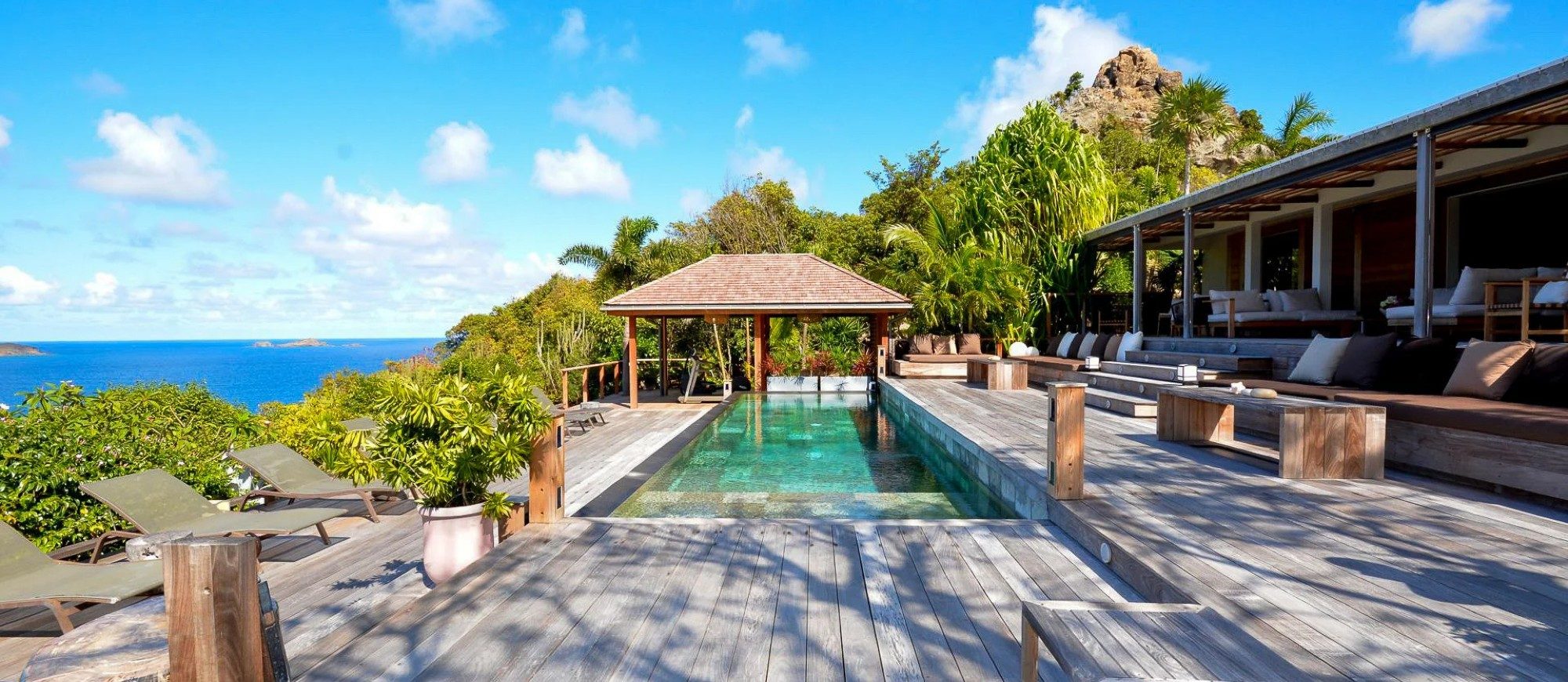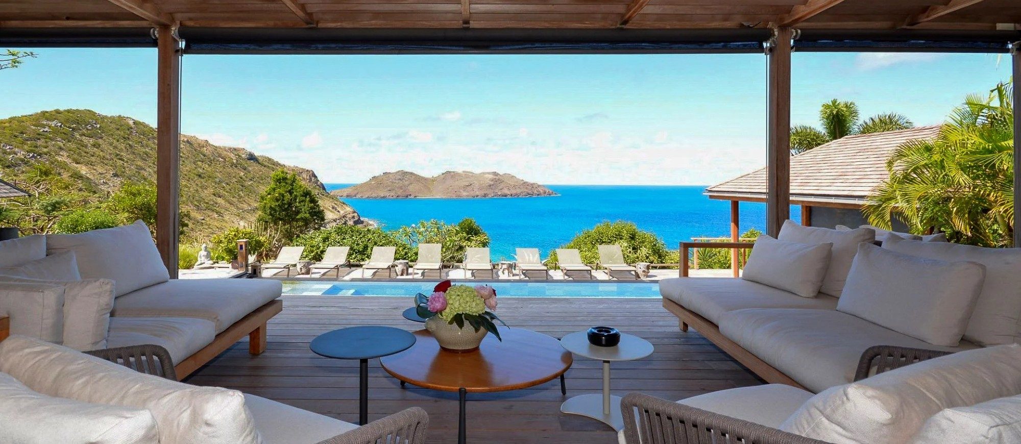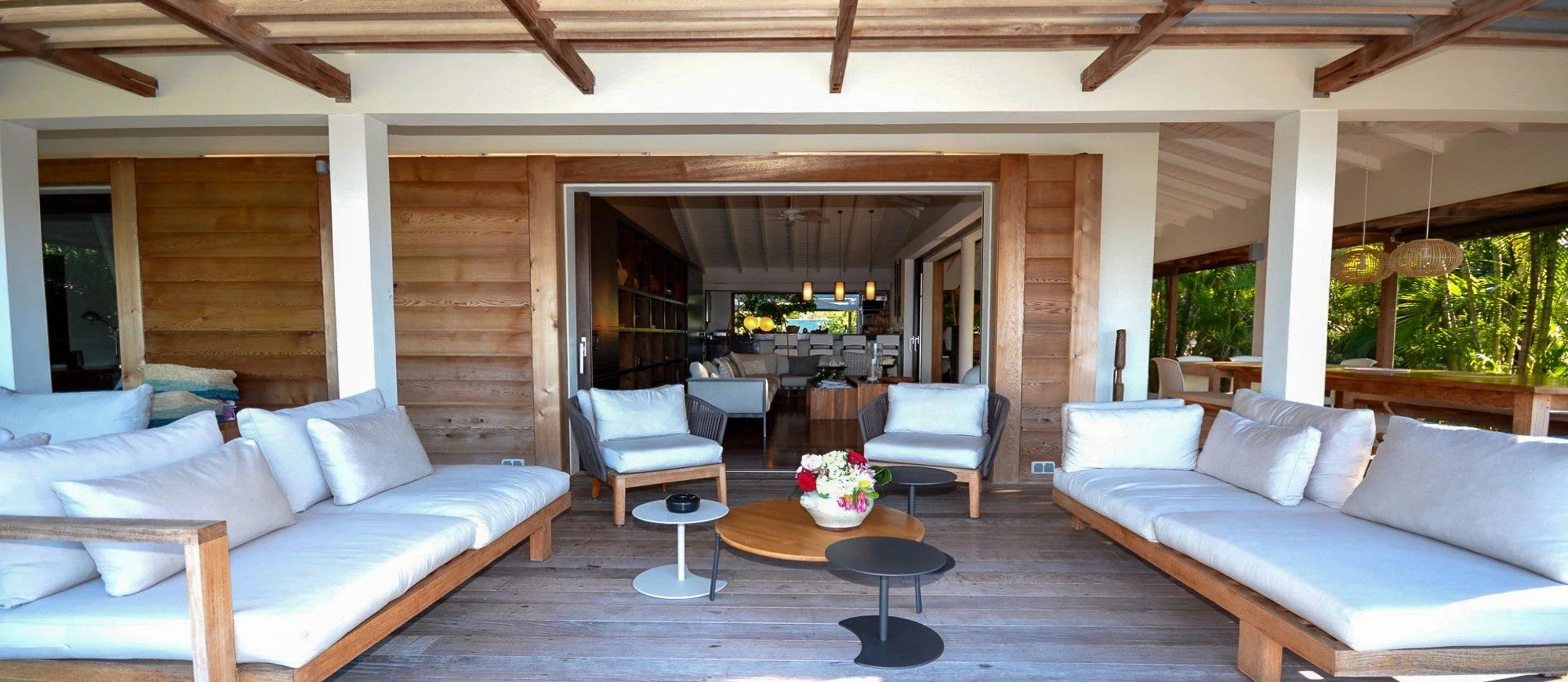 The outdoor living room under the covered terrace opens onto the large heated swimming pool surrounded by a wooden deck with many loungers, and great sea views.