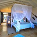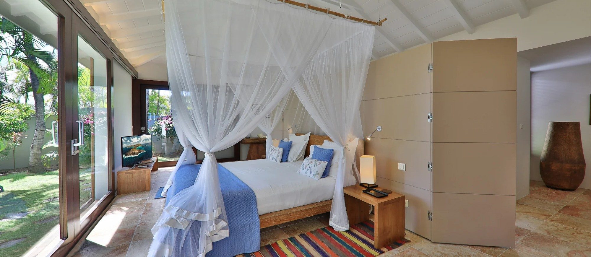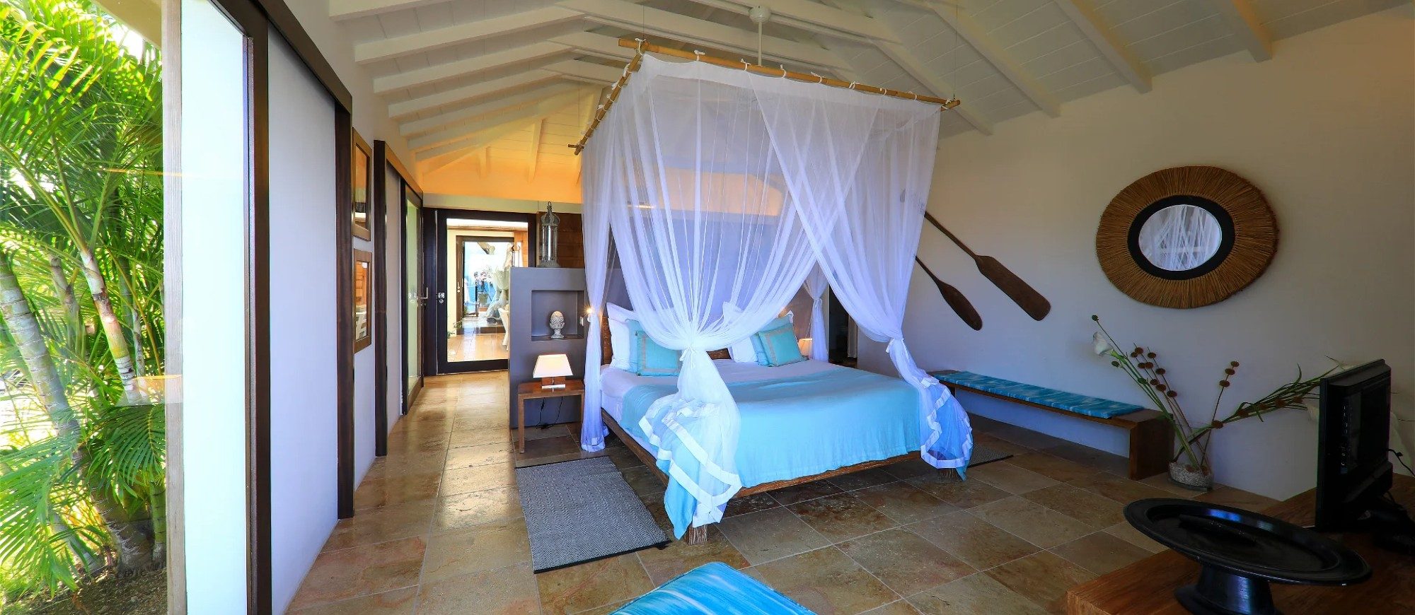 In the main house. King size bed, air conditioning, ceiling fan, mosquito nets, small refrigerator, safe, HD-TV, Dish Network, DVD player, Dock iPod, WIFI, large dressing room, mini bar, ensuite bathroom with shower and two sinks, hair dryer, outdoor shower, separate toilet. Ocean view.