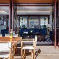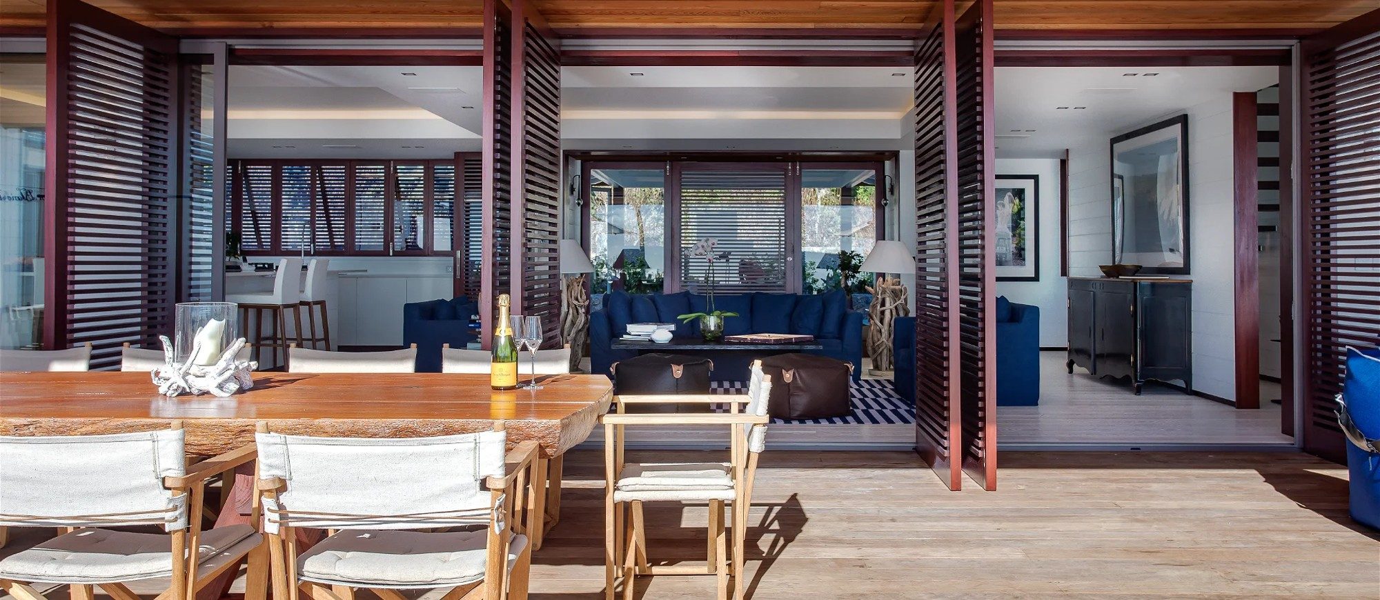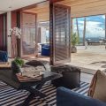 Located under the covered terrace, the exterior dining room has a solid wood table that can accommodate up to 16 guests, facing the outstanding ocean. Outside, the immense deck is arranged around a 20 metre heated infinity swimming pool with a jacuzzi.