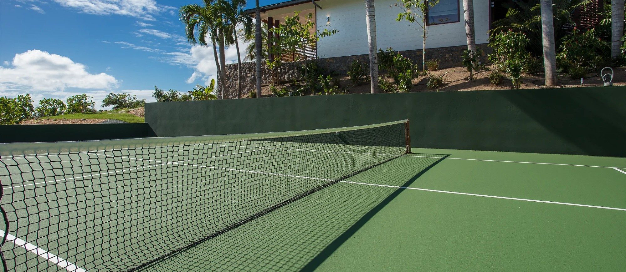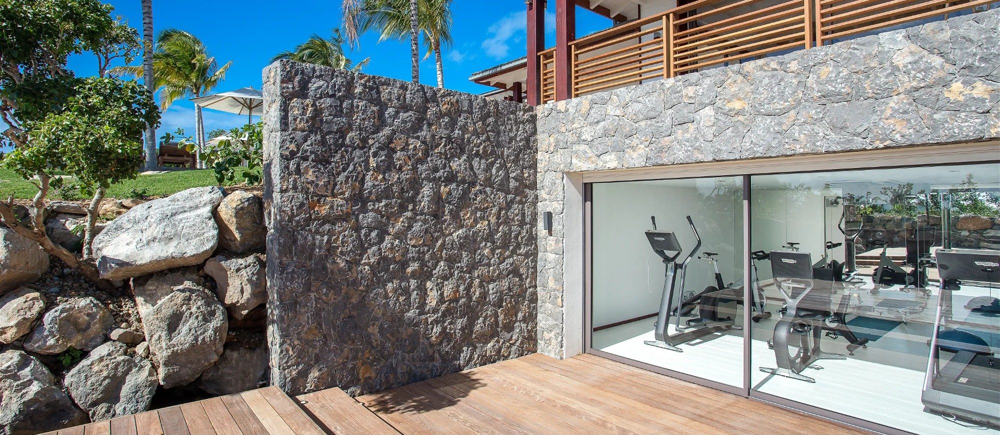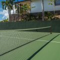 Private tennis court. Air-conditioned fitness room, located on a lower level of the garden : Treadmill, elliptical, exercise bike, reclining stationary cycle, free weights, yoga ball and mat, beach tennis rackets, HDTV, sound system, mini refrigerator.