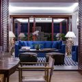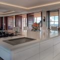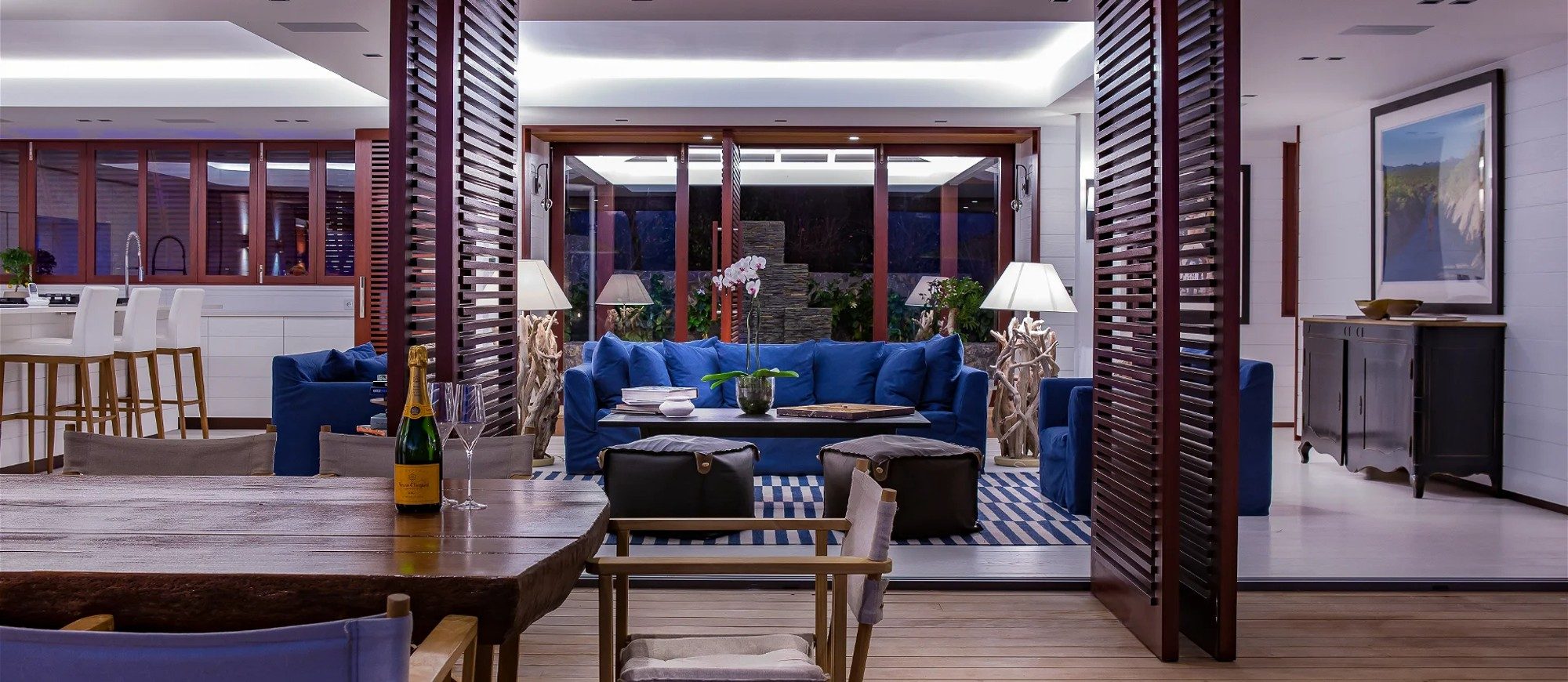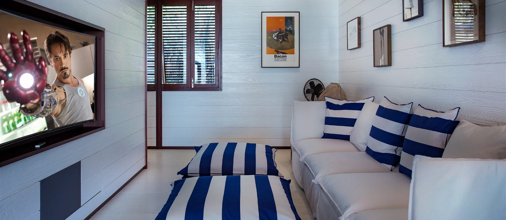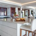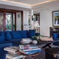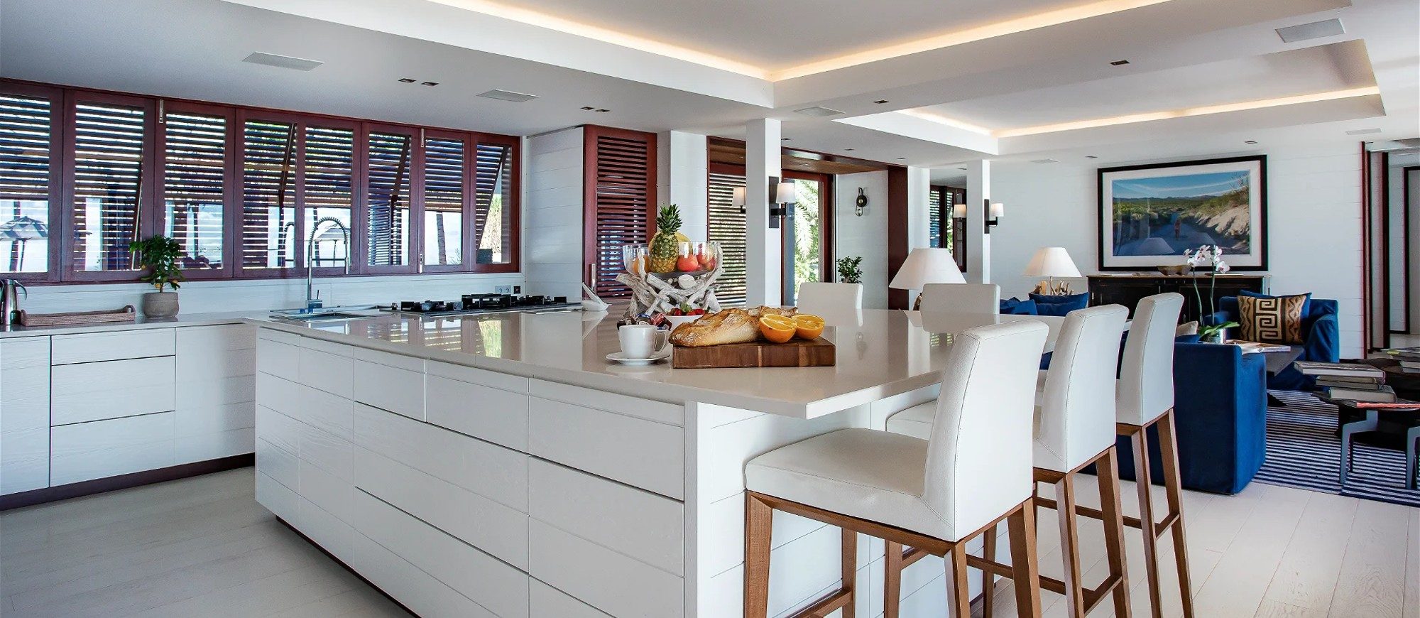 As the name of the villa suggests, the living room features blue hues on sofas and armchairs’ textiles, all mixed with white walls and elegant decoration. In this serene and warm atmosphere, you will enjoy backlit ceilings and modern lighting, while shutters filter the natural light. Nearby, there is a spacious and cosy room dedicated to cinema for movie nights. The large white kitchen is well equipped to call upon the services of a private chef, while a central island with bar chairs welcomes guests for breakfast.