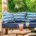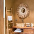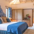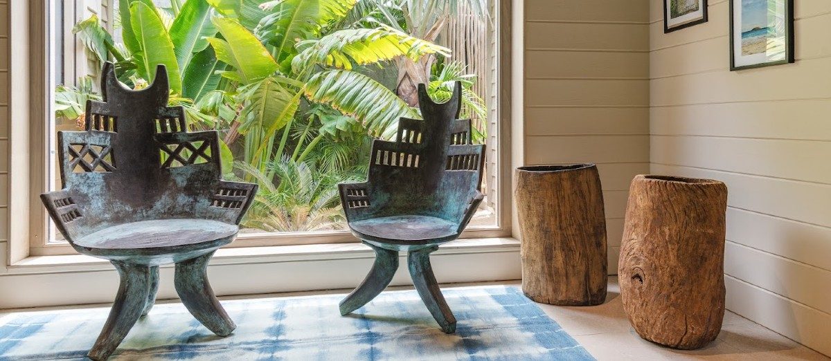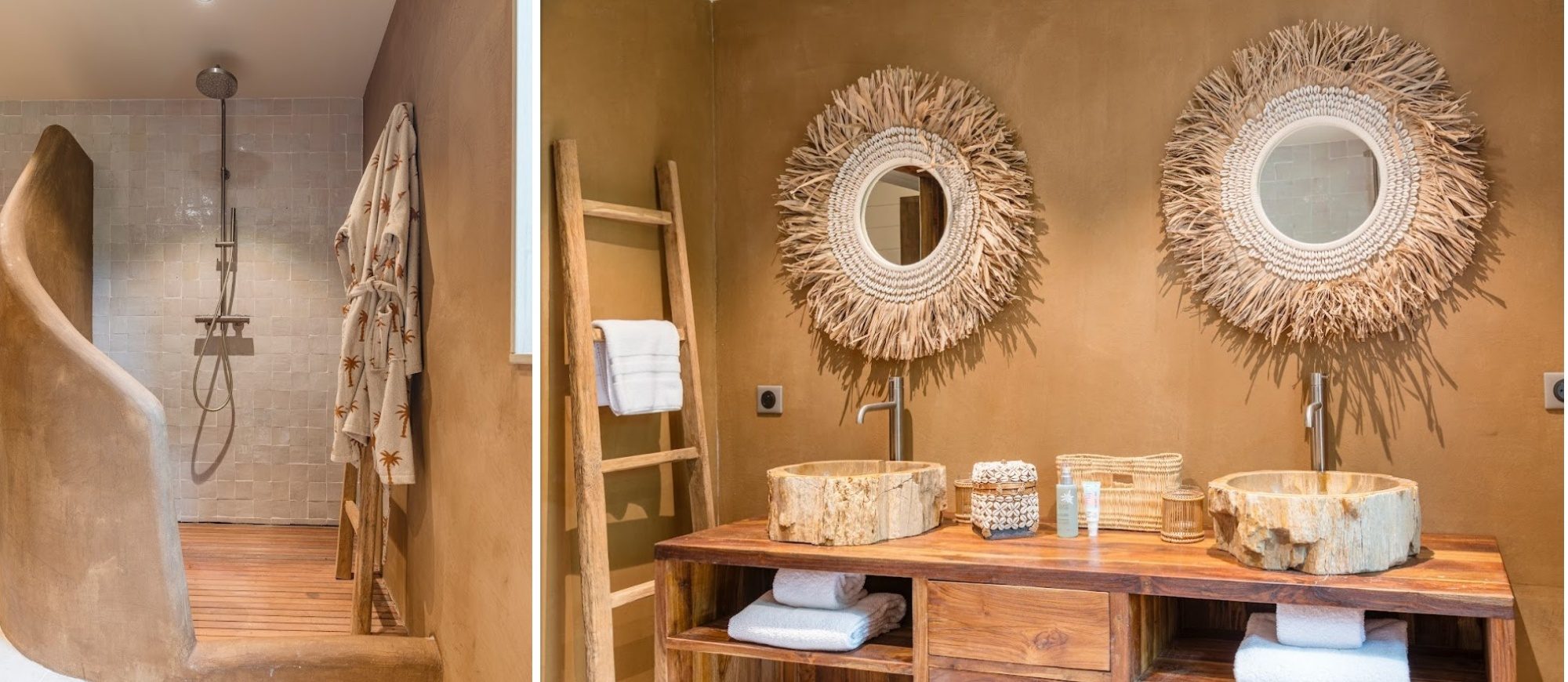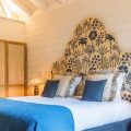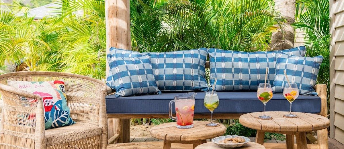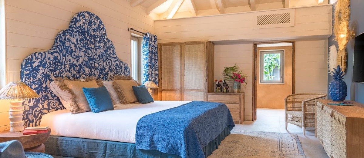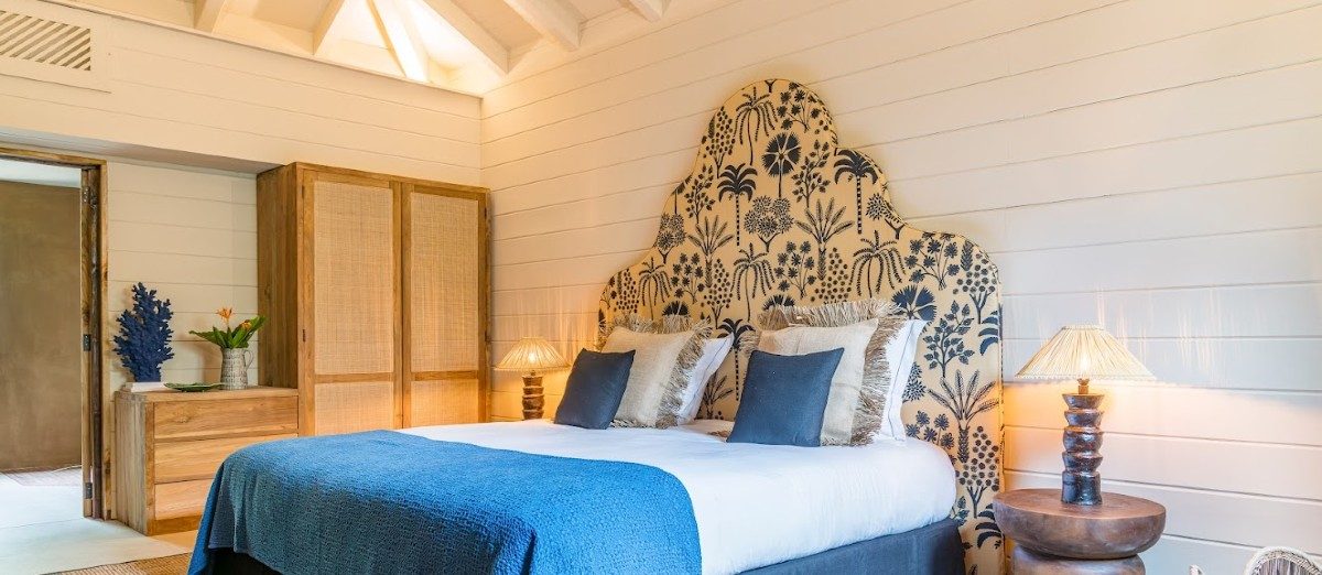 Every corner of this chic cottage is adorned with shades of blue, exotic animal prints against a tropical backdrop, woven furniture, and magnificent lamps in beautiful azure blue, creating a peaceful atmosphere that echoes the turquoise waters of the bay of Saint-Jean.