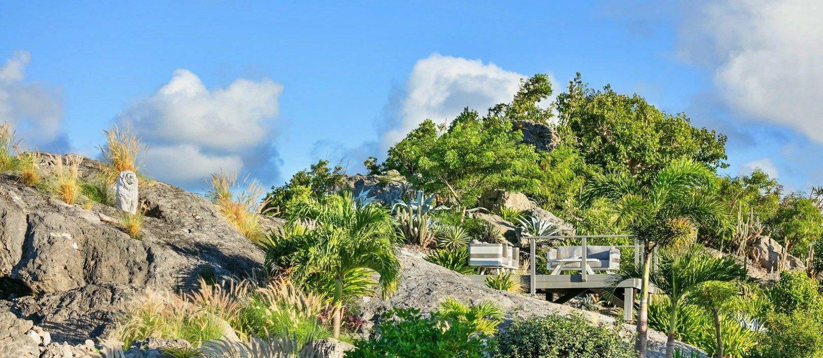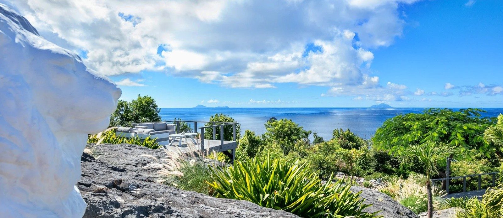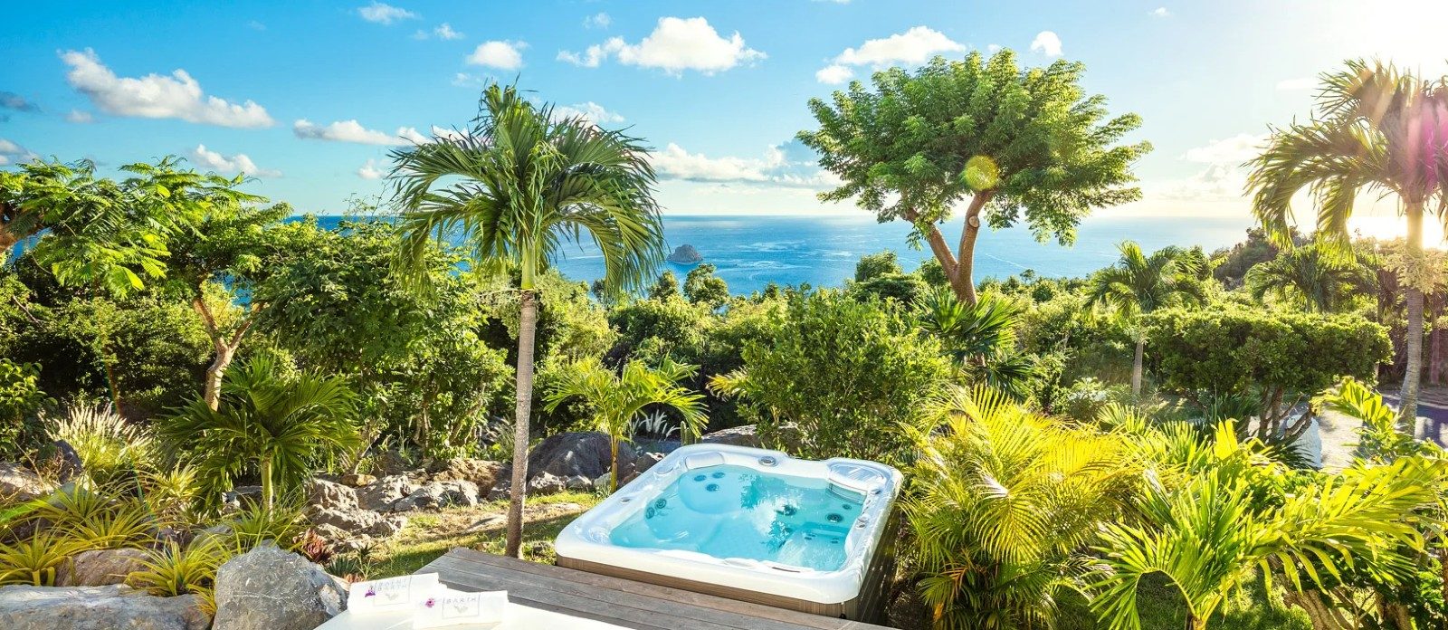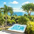 There is a large sunny terrace with a beautiful swimming pool and a jacuzzi, with a stunning view of the ocean, the bay of Petite Anse and the island of Bonhomme. There are wonderful sunrises and sunsets. The rocky garden is full of white flowers and cacti.