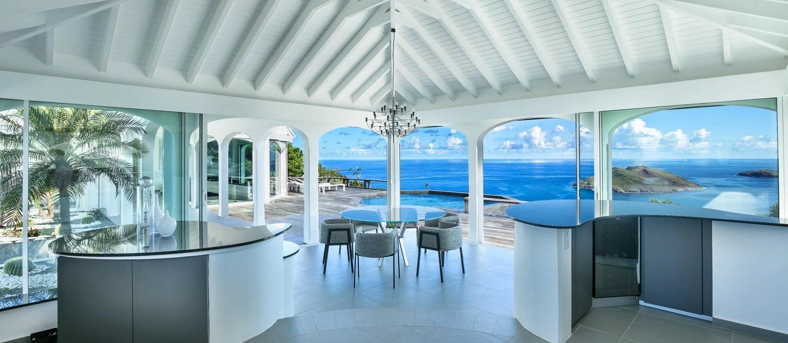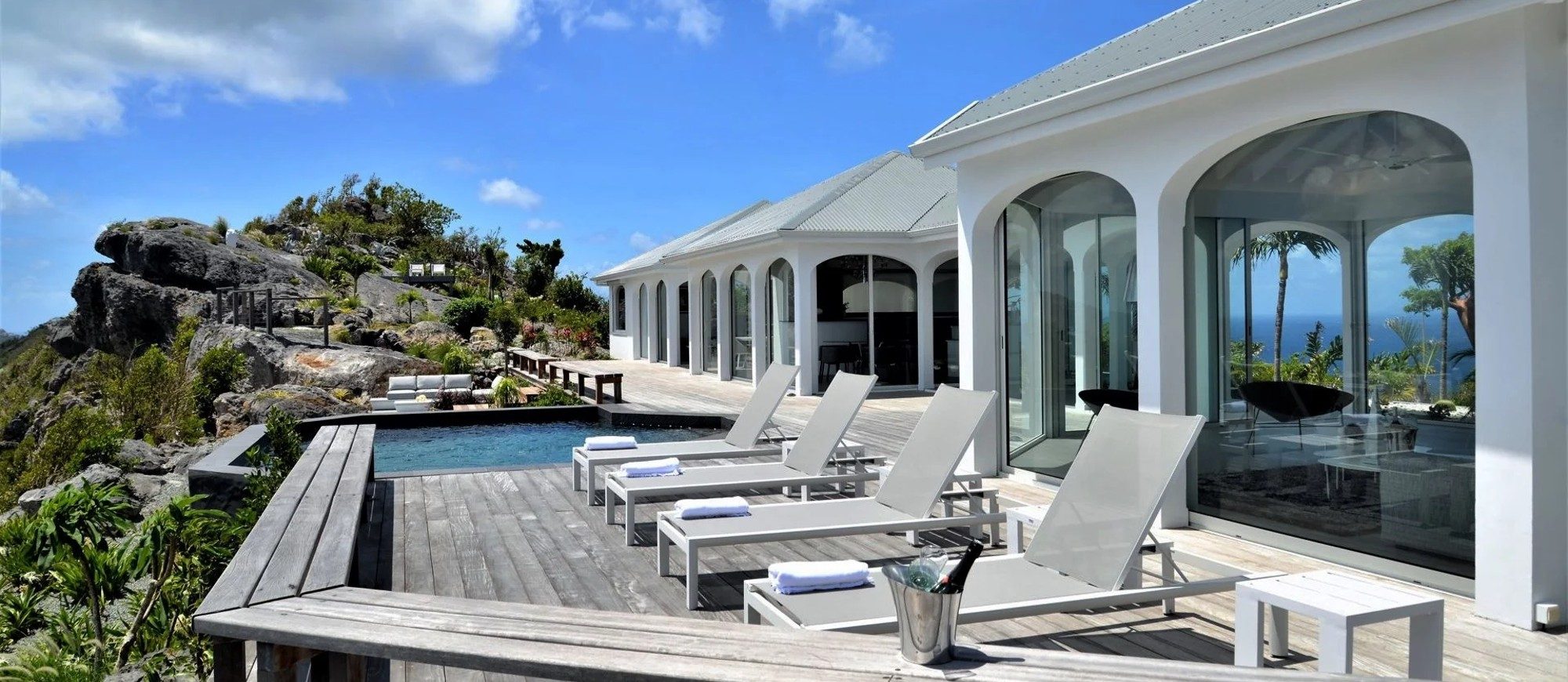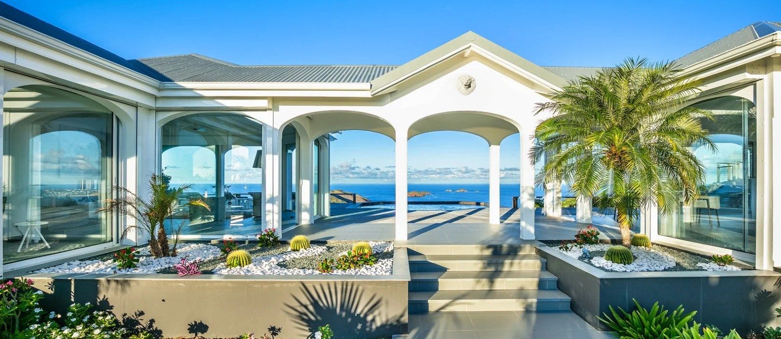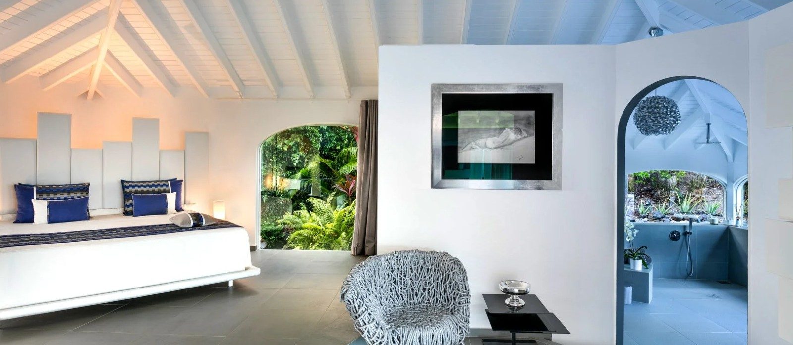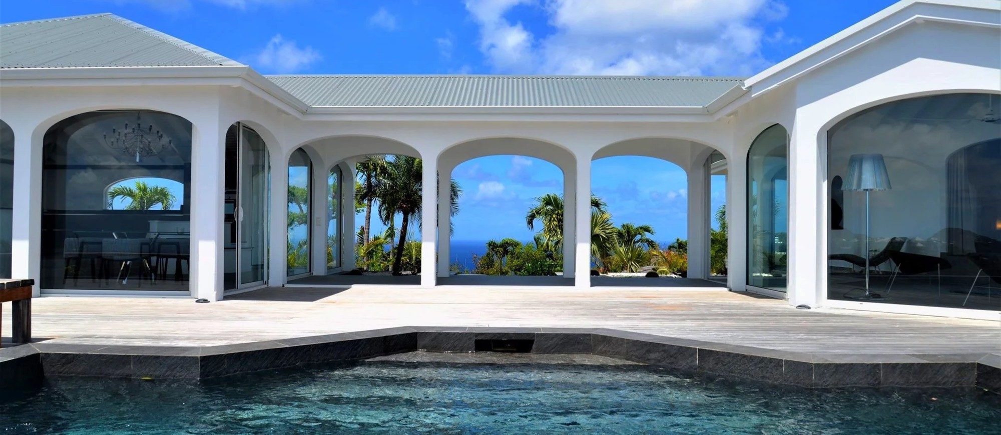 Located at the top of Colombier hill, this is an outstanding property with spectacular views over the ocean and the green landscapes of St-Barthelemy. A very romantic and peacefulvilla with ancient Greek striking white decor with columns and hand-painted frescoes. .