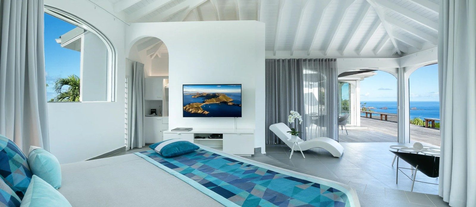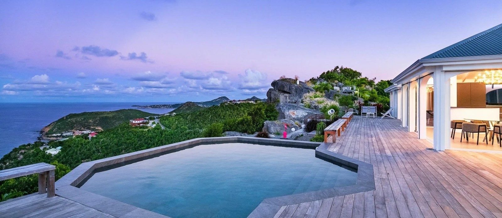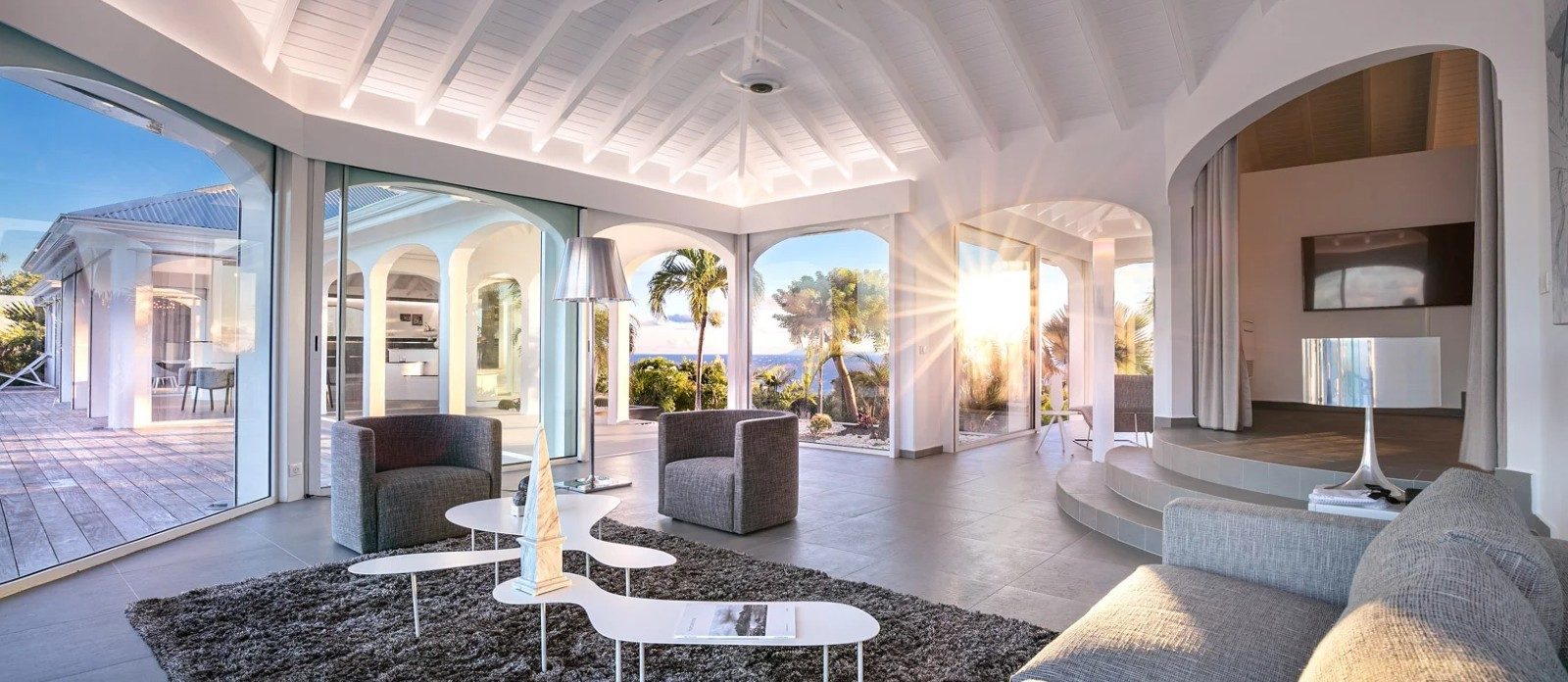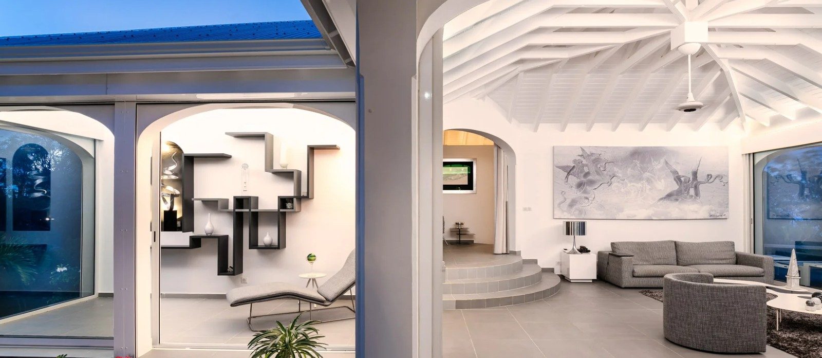 Located at the top of Colombier hill, this is an outstanding property with spectacular views over the ocean and the green landscapes of St-Barthelemy. A very romantic and peacefulvilla with ancient Greek striking white decor with columns and hand-painted frescoes. .