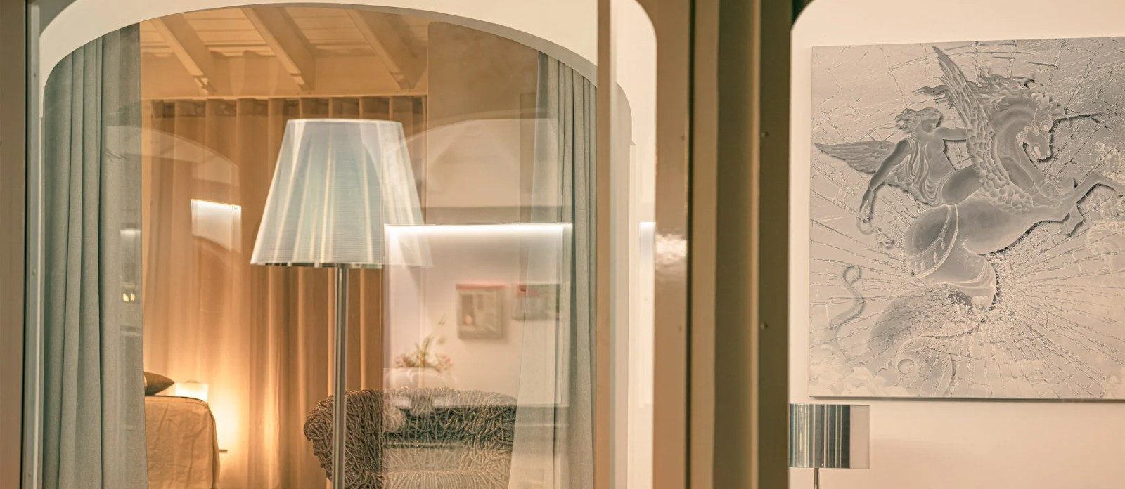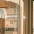 The living room is composed of a comfortable sofa and armchairs around a coffee table in sleek and contemporary style. The dining room welcomes guests around a beautiful glass table with comfortable chairs under a beautiful modern hanging light and a vaulted white ceiling. The kitchen is spacious and well-equipped.