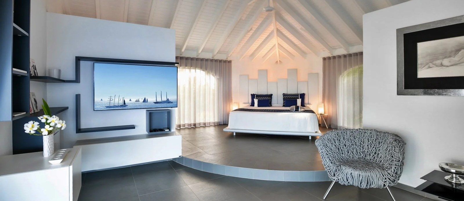 Located in a separate bungalow. King size bed, mosquito nets, air conditioning, ceiling fan, HD-TV, dish network, iPod Dock, DVD player, mini-bar, safe, dressing room, small living room. Adjoining bathroom, rain shower, two sinks, sauna, separate toilets, hair dryer, bathrobes, towels and beach towels. Ocean view.