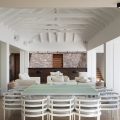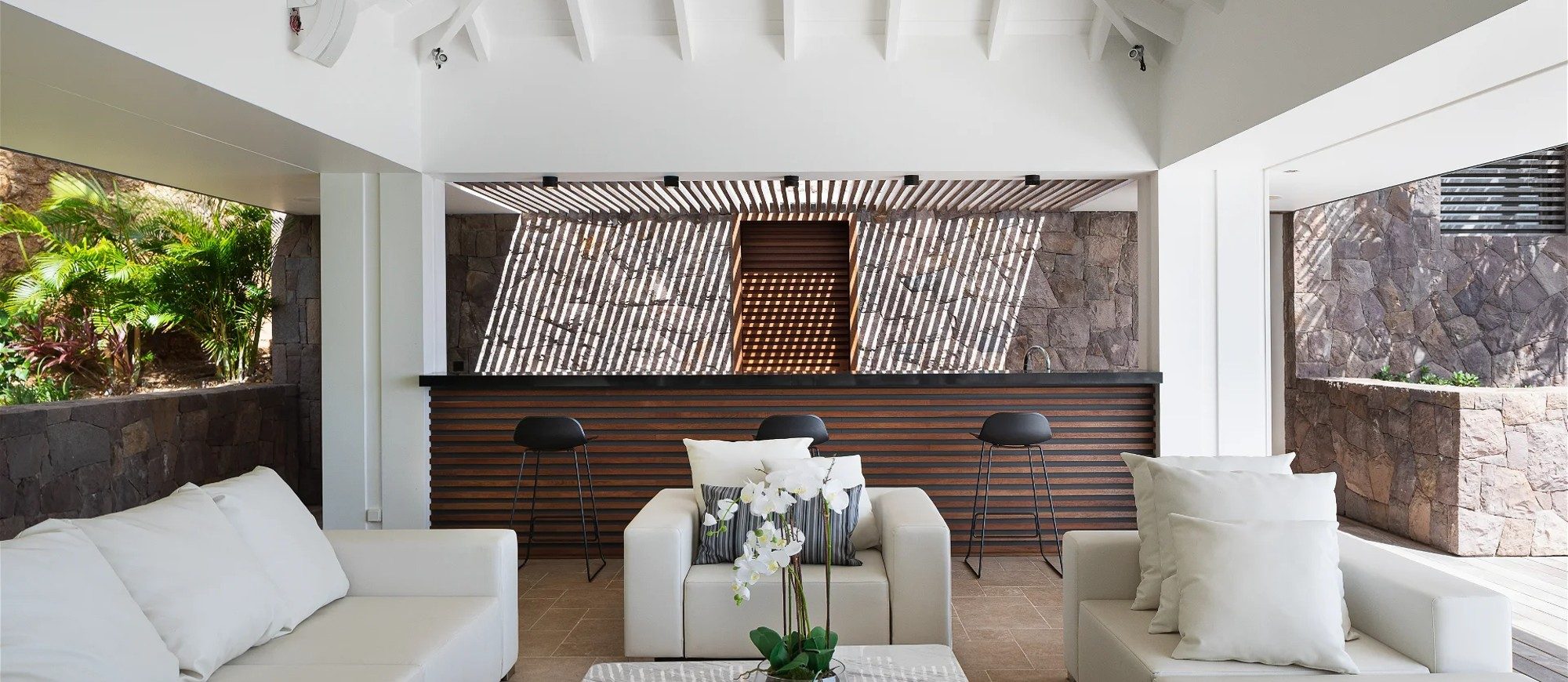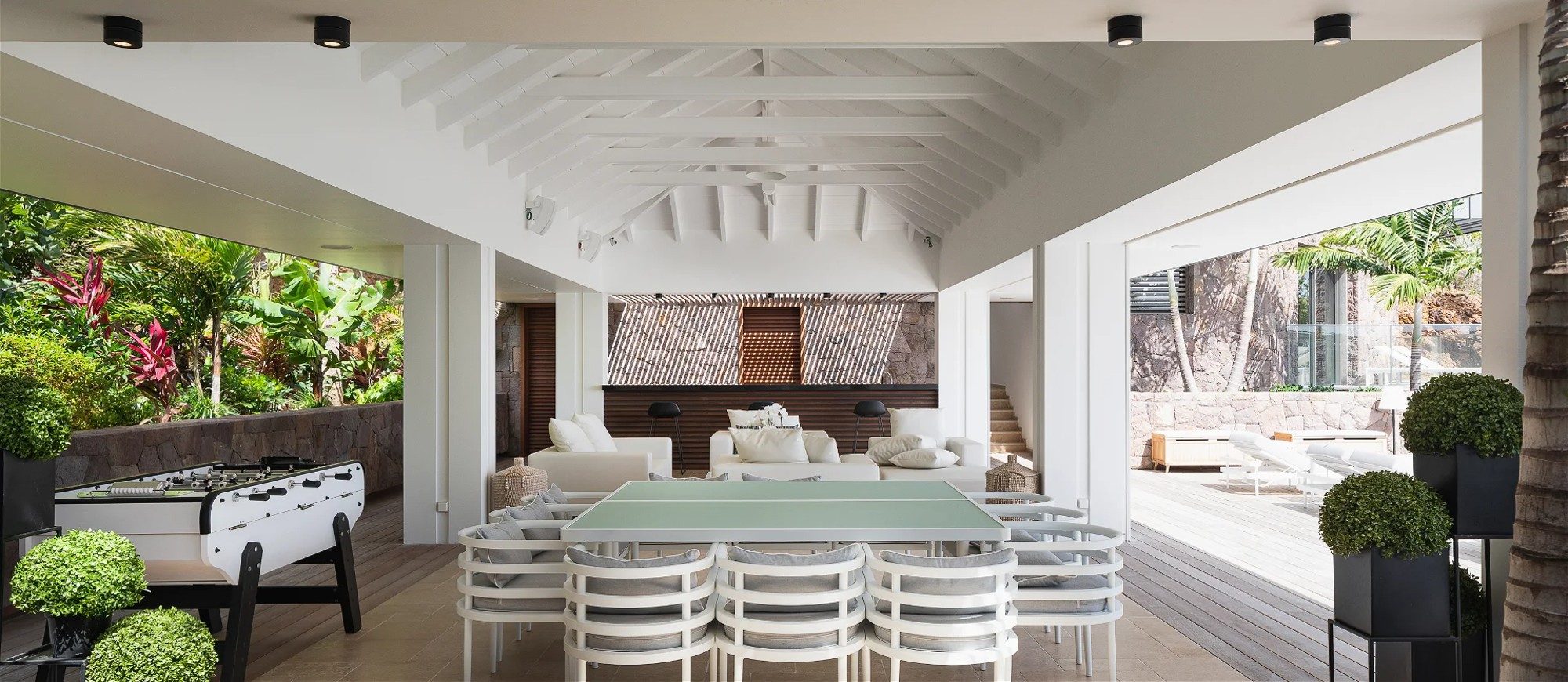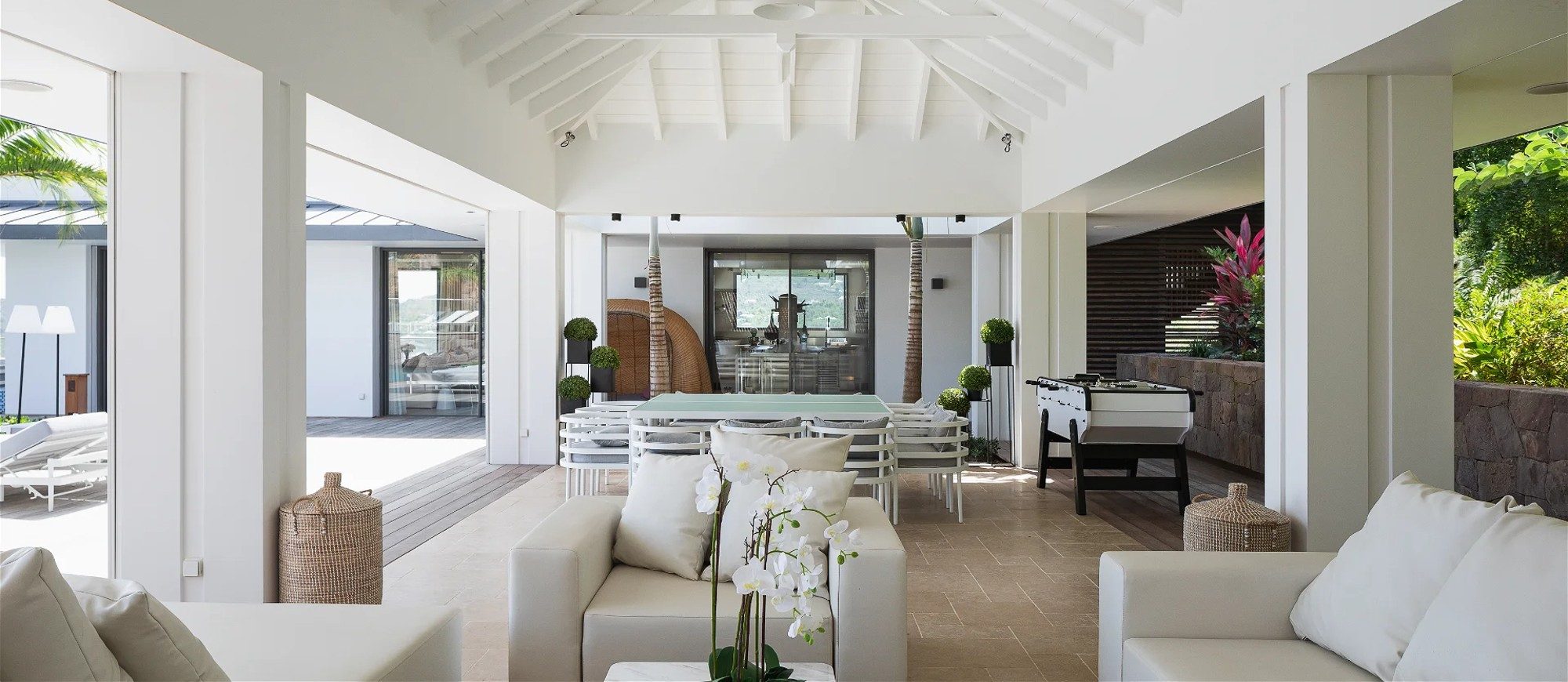 In a contemporary style and a decorated by the famous designer Jean-Michel Wilmotte, this house opens widely onto the ocean and offers upscale equipment in a very refined setting. The large living room furnished with sofas, armchairs and off-white-coloured benches in a chic atmosphere lets the gentle trade winds blow in. The dining room can accommodate up to twelve people around a large indoor dining table.