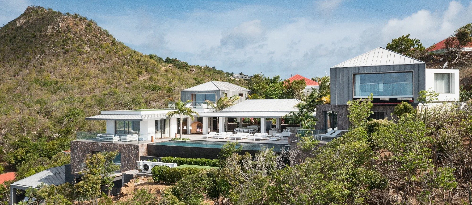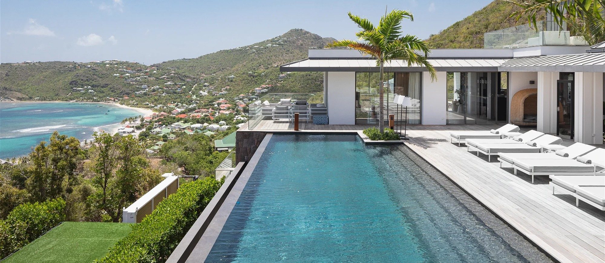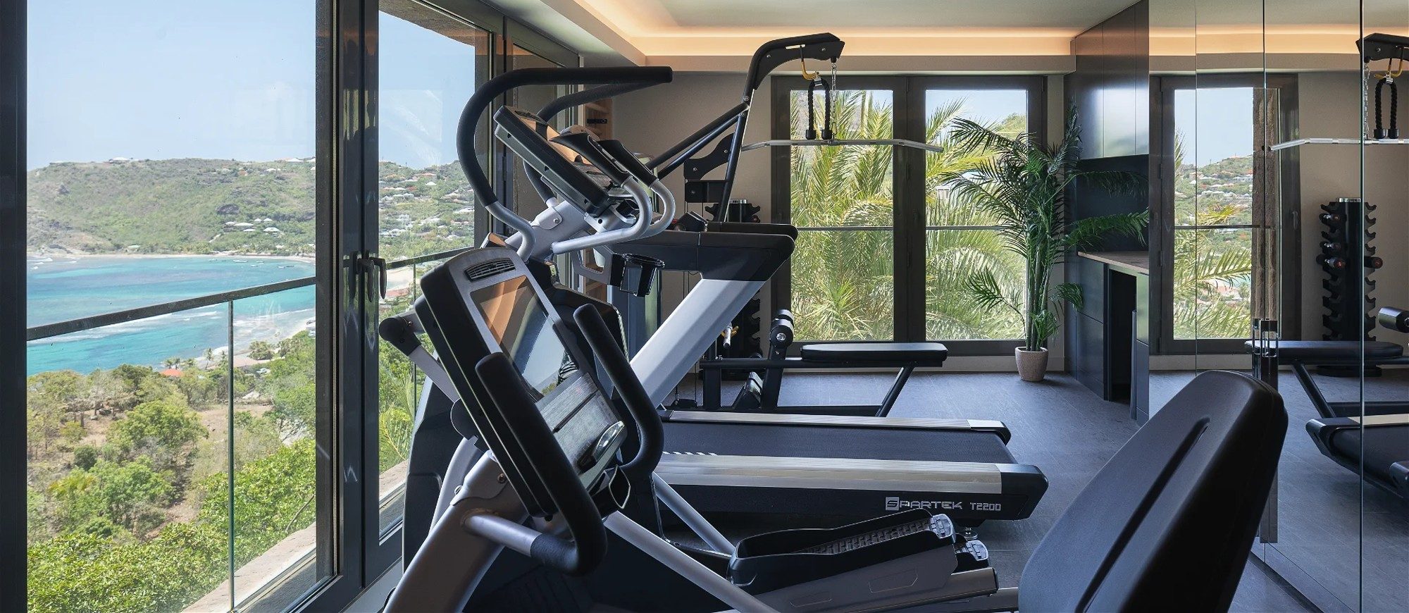 There are seven air-conditioned bedrooms with king or queen size beds and en-suite bathrooms. They are spread over three levels on several buildings, and open onto magnificent ocean views; the seventh room, ideal for staff or for a teenager, opens onto a beautiful view over the hills. A lift is also at your disposal to reach the other levels with greater ease and comfort. Sports lovers will appreciate the air-conditioned fitness room with upscale equipment.