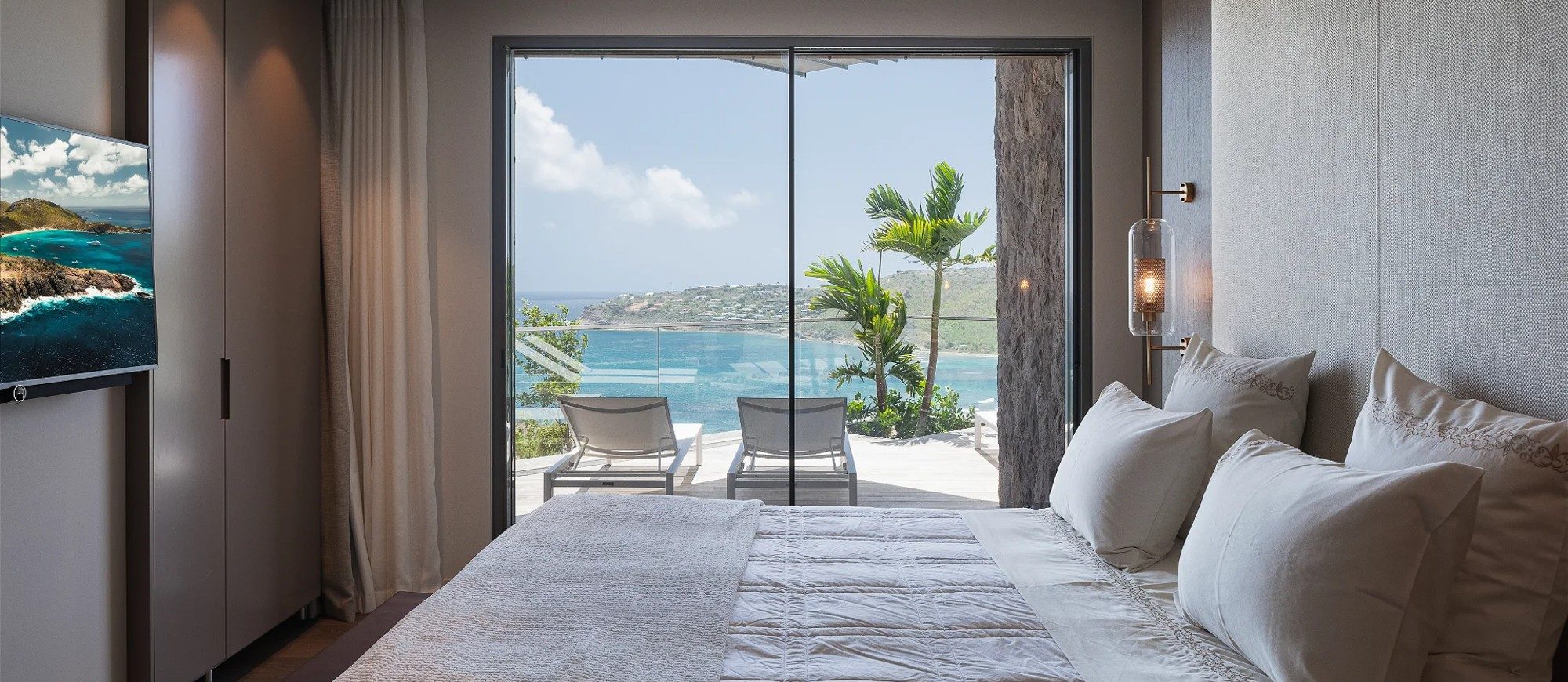 A king size bed, air conditioning, ceiling fan, HD-TV, Apple TV, safe, dressing room. Ensuite bathroom with indoor Italian shower. Private terrace and ocean view.