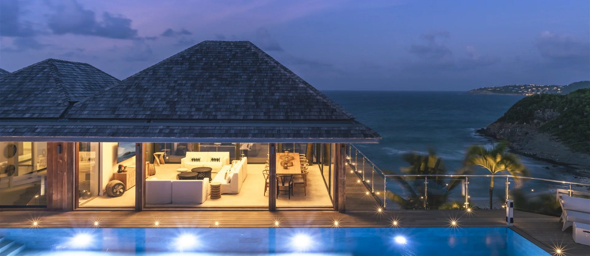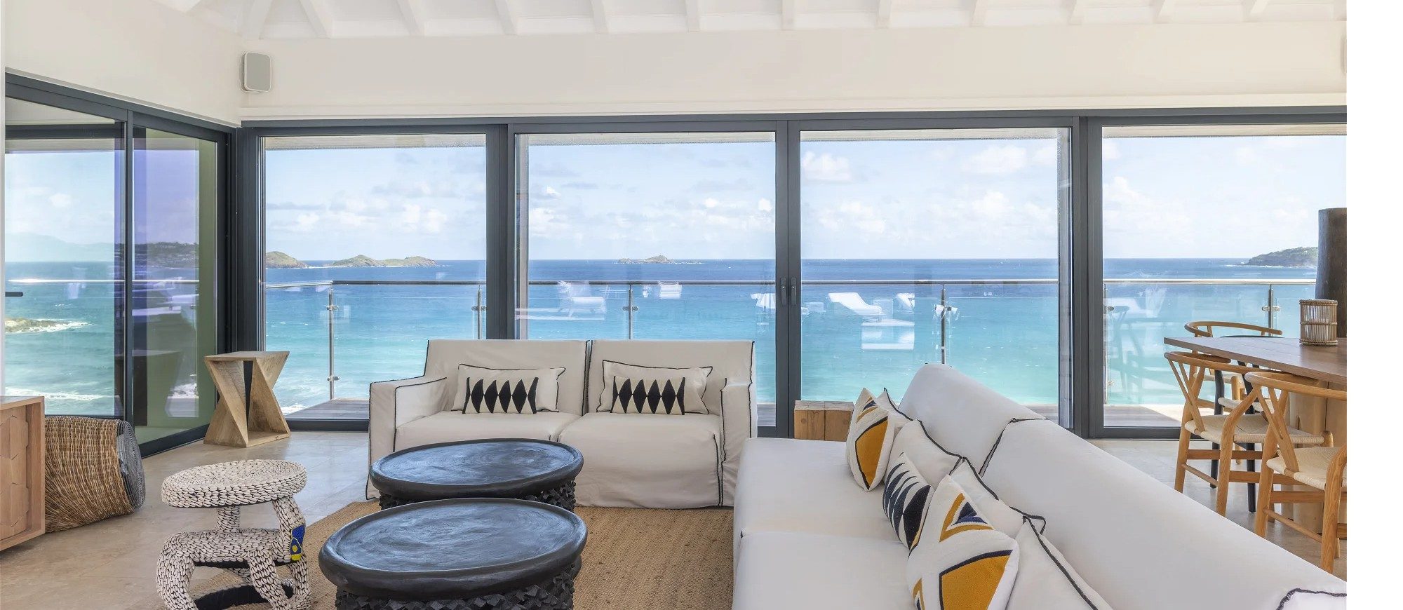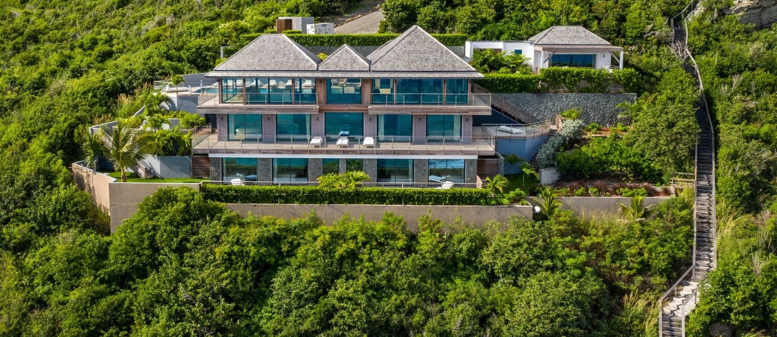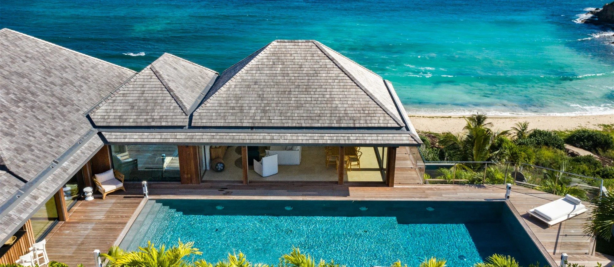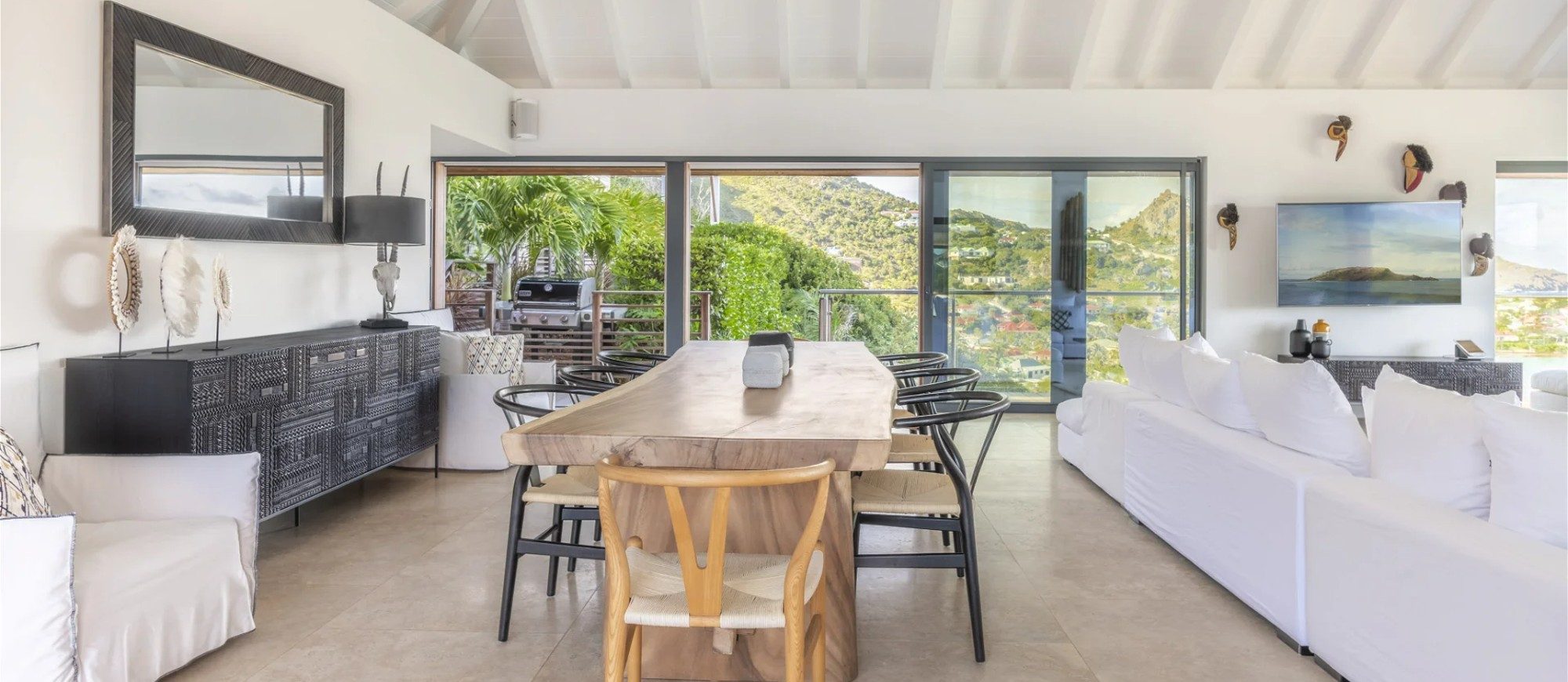 Nestled on a hillside overlooking the bay of Anse des Cayes, this luxurious villa is one of the most outstanding rental properties on the island. Ideally located at the end of a private road, this quiet villa offers a spectacular panoramic view over the bay, the Atlantic Ocean and the beach of Anse des Cayes. Built on three levels, this large seven-bedroom house is the perfect haven of peace for large groups.
