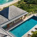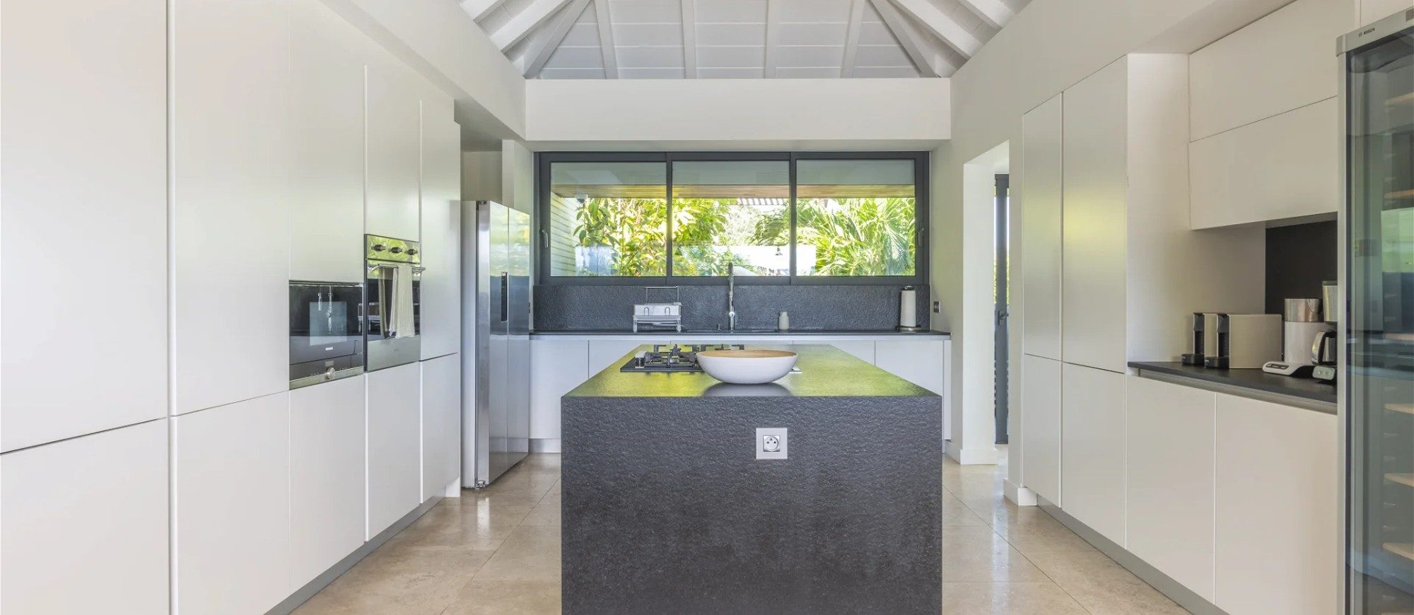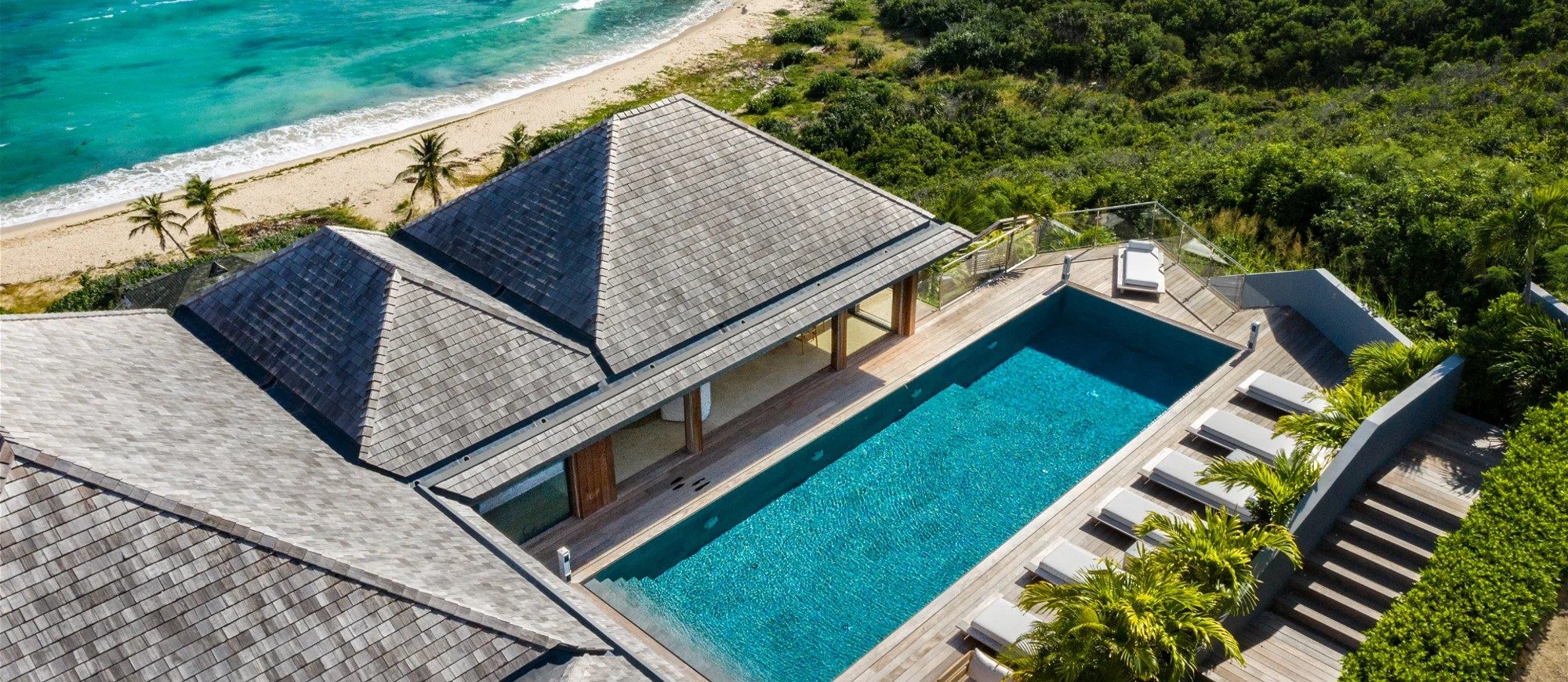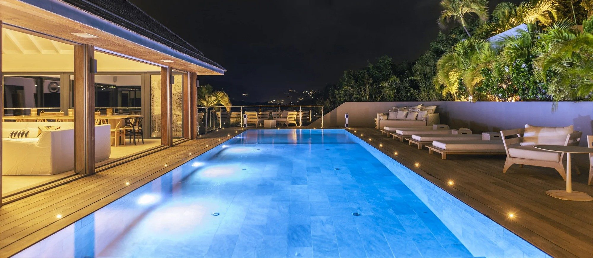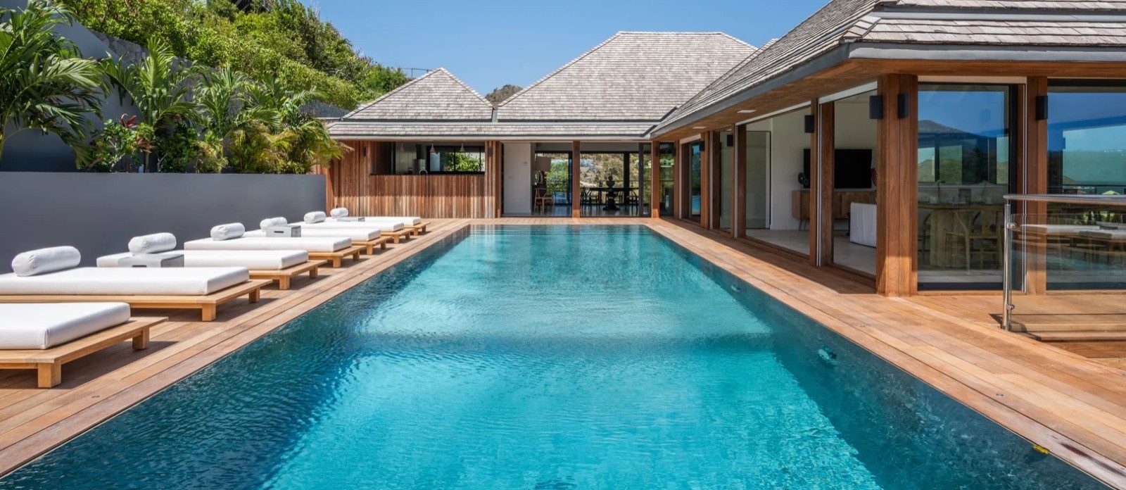 Nestled on a hillside overlooking the bay of Anse des Cayes, this luxurious villa is one of the most outstanding rental properties on the island. Ideally located at the end of a private road, this quiet villa offers a spectacular panoramic view over the bay, the Atlantic Ocean and the beach of Anse des Cayes. Built on three levels, this large seven-bedroom house is the perfect haven of peace for large groups.
