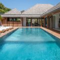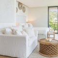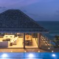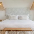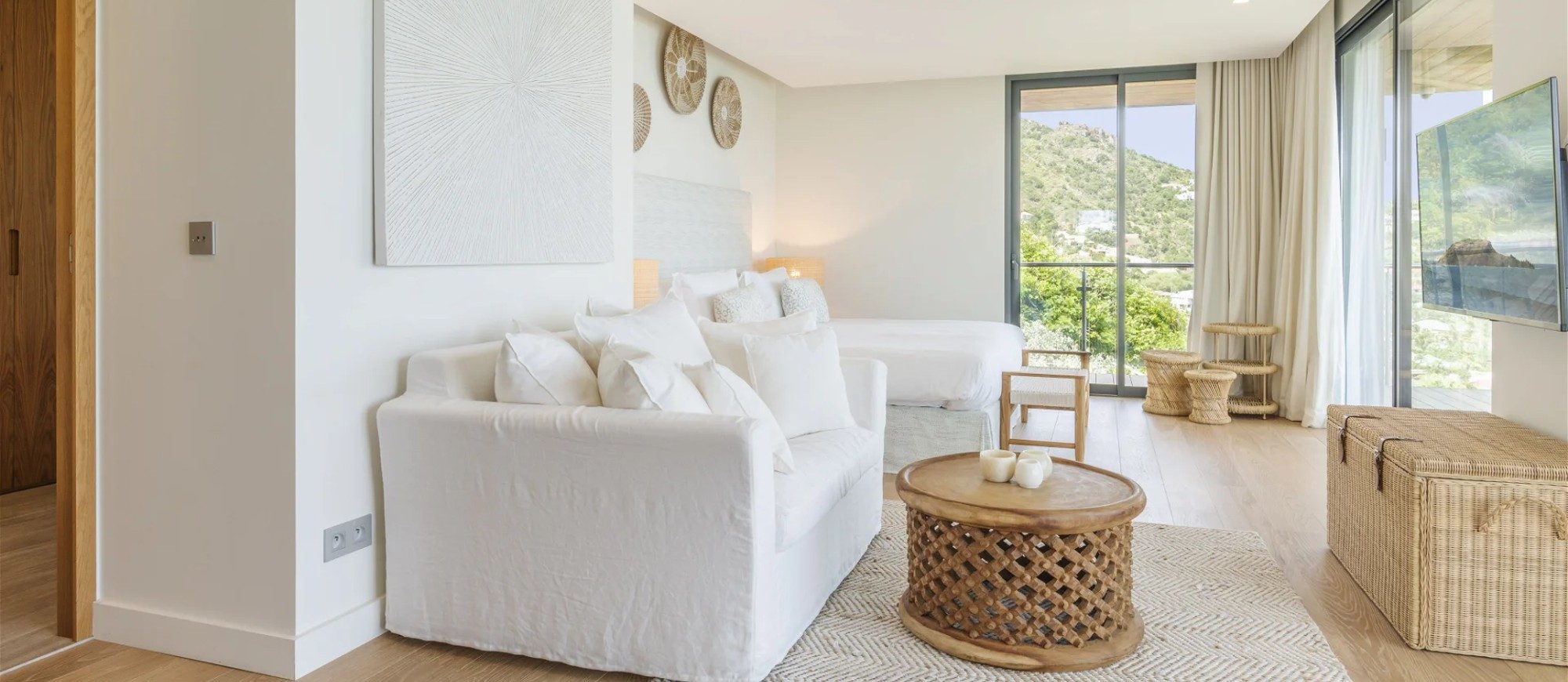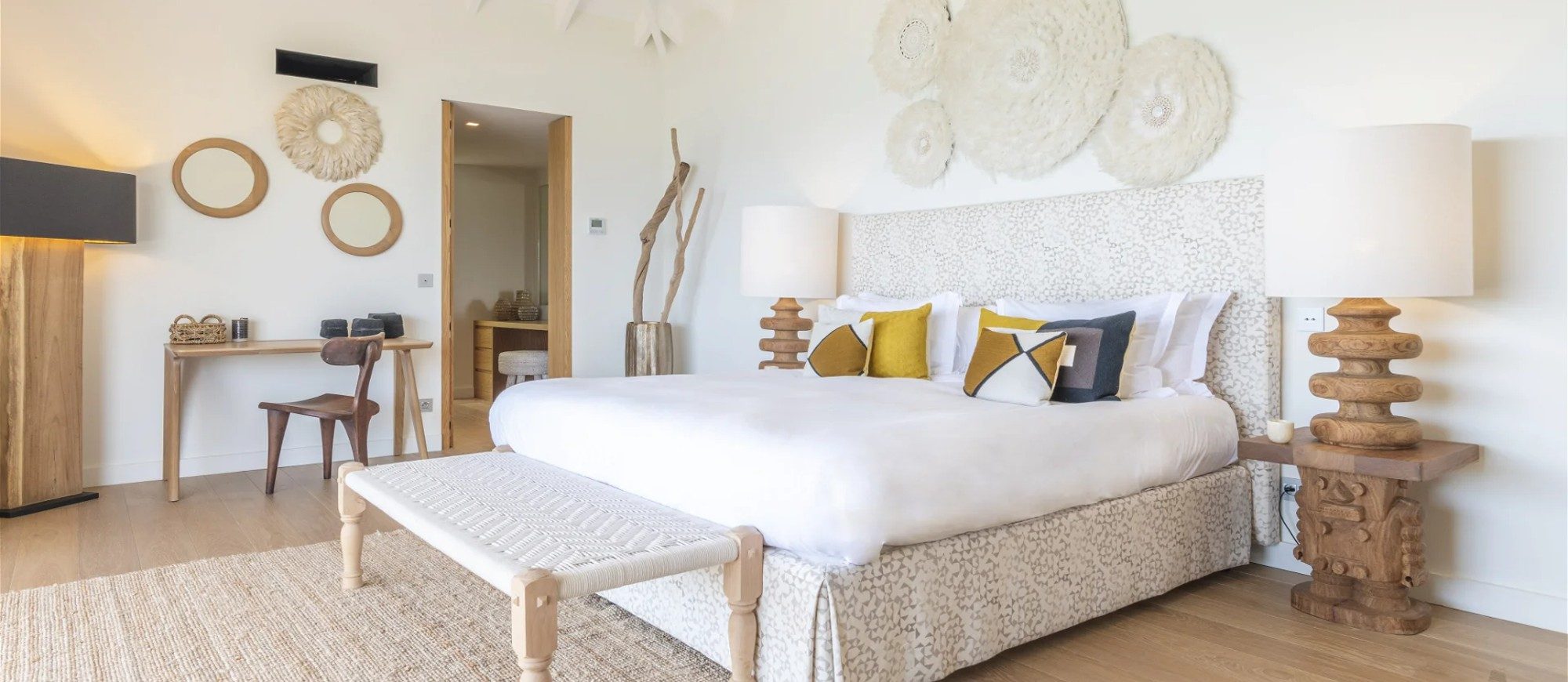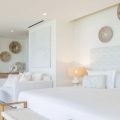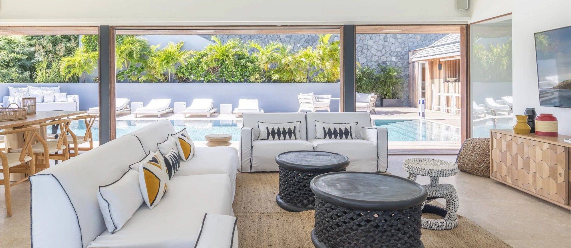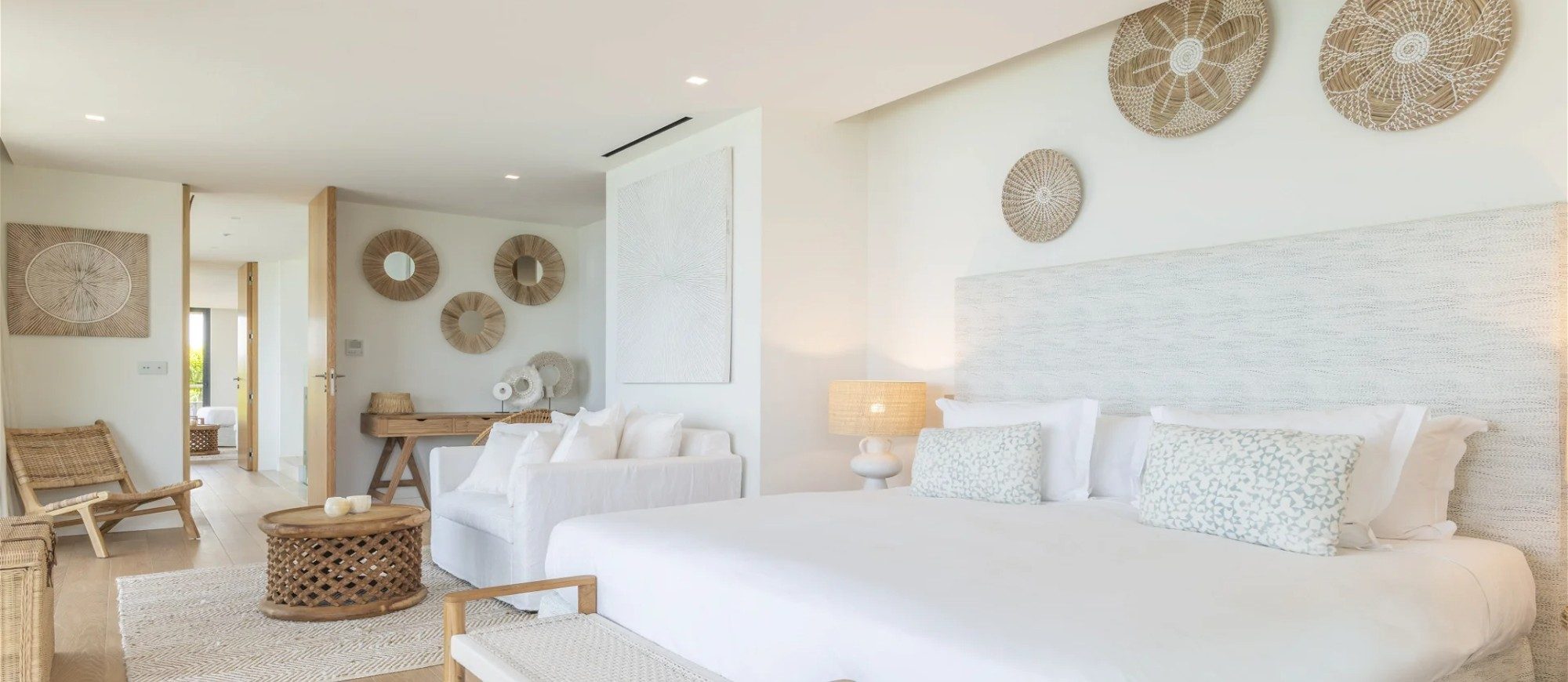 The villa is built with noble materials such as soft fabrics, beautifully weathered wood and high-quality glass. The architecture is spacious, with many living spaces allowing to rest or entertain as you wish. In a refined interior design with a bohemian and chic style, there are two large living rooms on either side of an interior staircase leading to the lower levels. These two bright and airy living spaces feature comfortable sofas and large wooden dining tables. The sober decoration with white tones under the high wooden ceilings creates a fine atmosphere, with a stunning panoramic view through the large windows. These two living rooms open onto the terrace and the swimming pool, where an outdoor bar connects the gourmet kitchen perfect for a private chef.