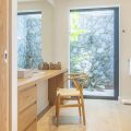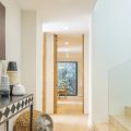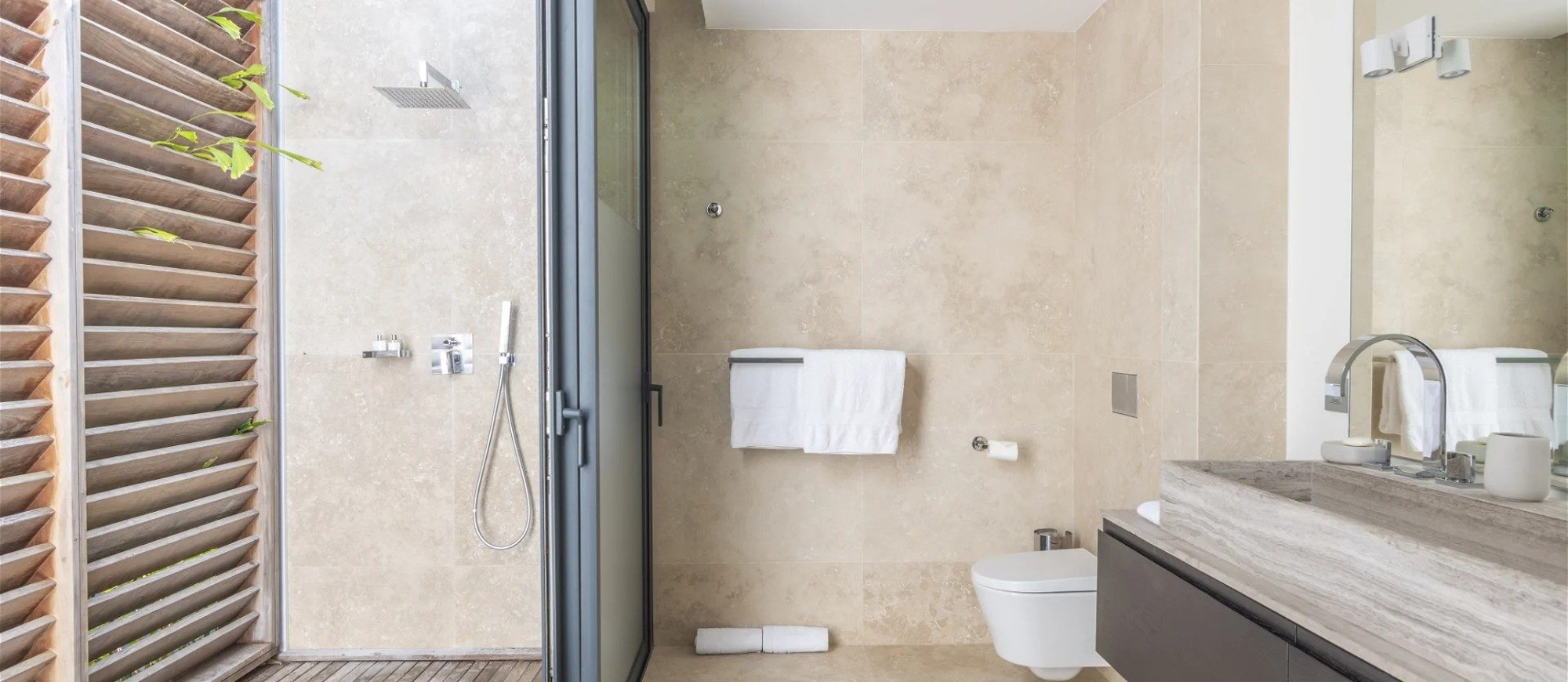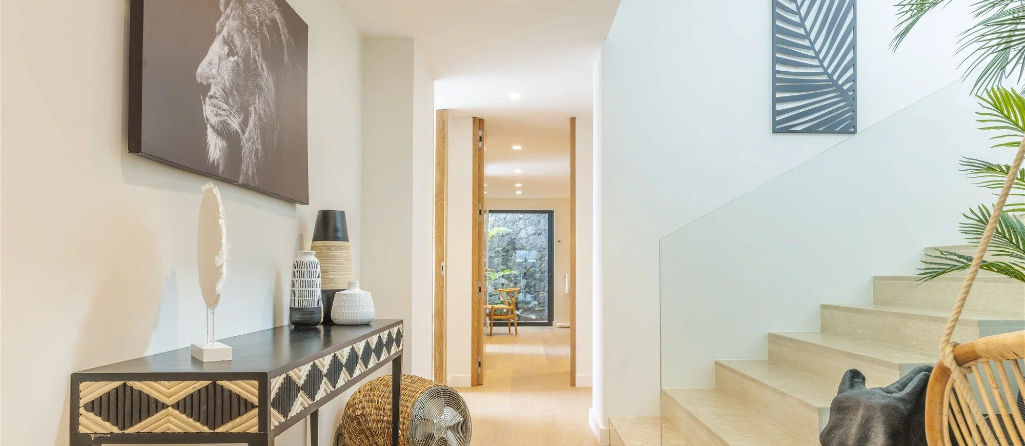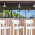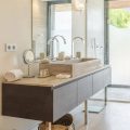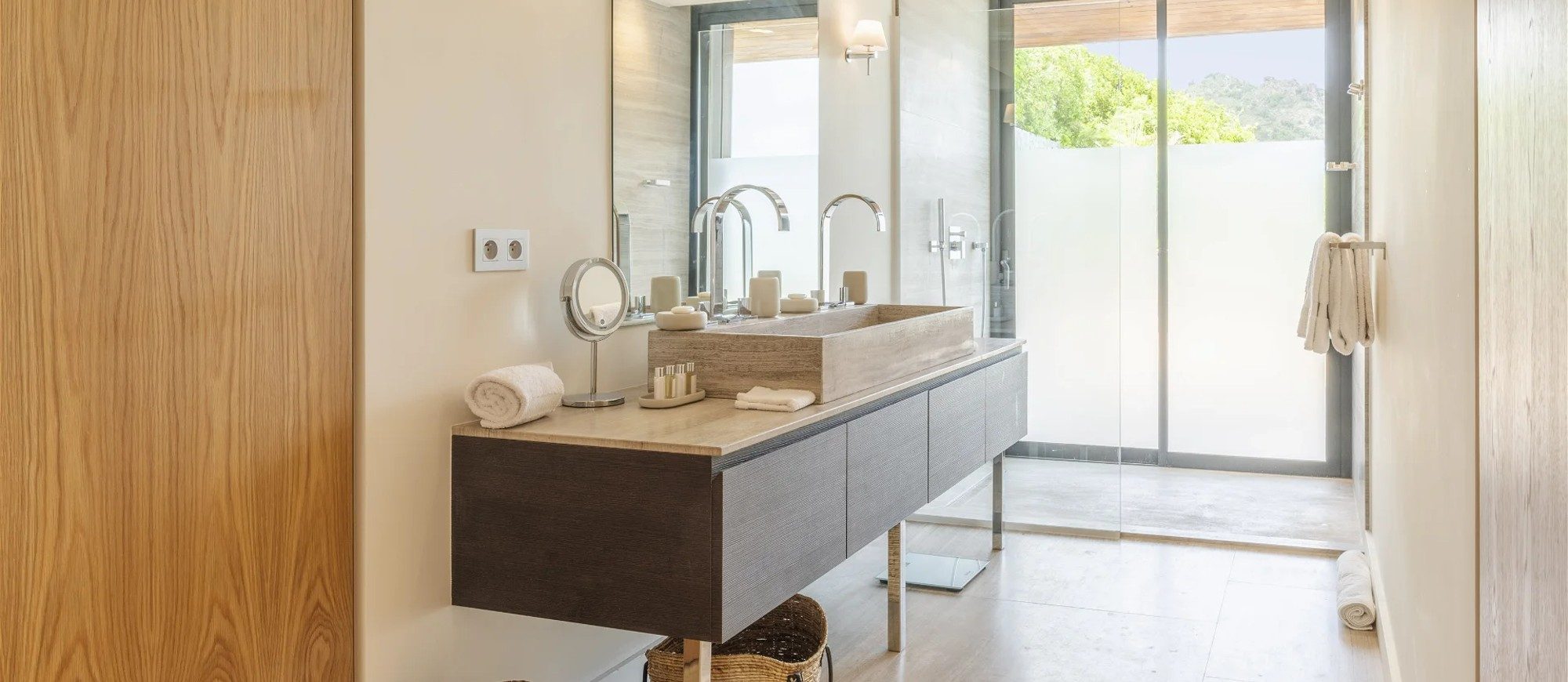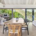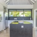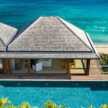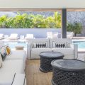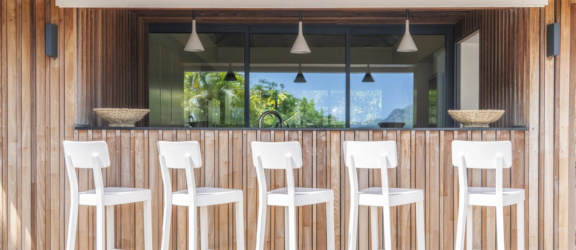The villa is built with noble materials such as soft fabrics, beautifully weathered wood and high-quality glass. The architecture is spacious, with many living spaces allowing to rest or entertain as you wish. In a refined interior design with a bohemian and chic style, there are two large living rooms on either side of an interior staircase leading to the lower levels. These two bright and airy living spaces feature comfortable sofas and large wooden dining tables. The sober decoration with white tones under the high wooden ceilings creates a fine atmosphere, with a stunning panoramic view through the large windows. These two living rooms open onto the terrace and the swimming pool, where an outdoor bar connects the gourmet kitchen perfect for a private chef.
