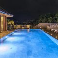 There is a large heated swimming pool with steps. Comfortable loungers are set up for reading or sunbathing sessions in the heart of a lush tropical environment with palm trees and green lawns all around the property. There are several private terraces on different levels.