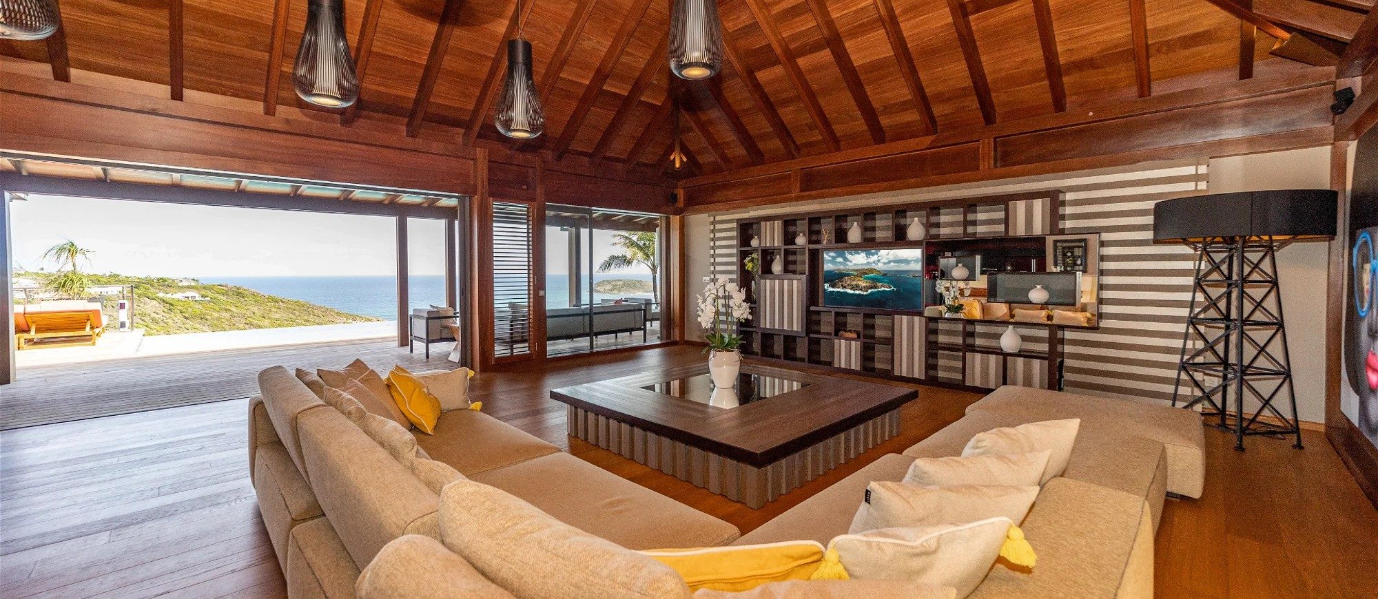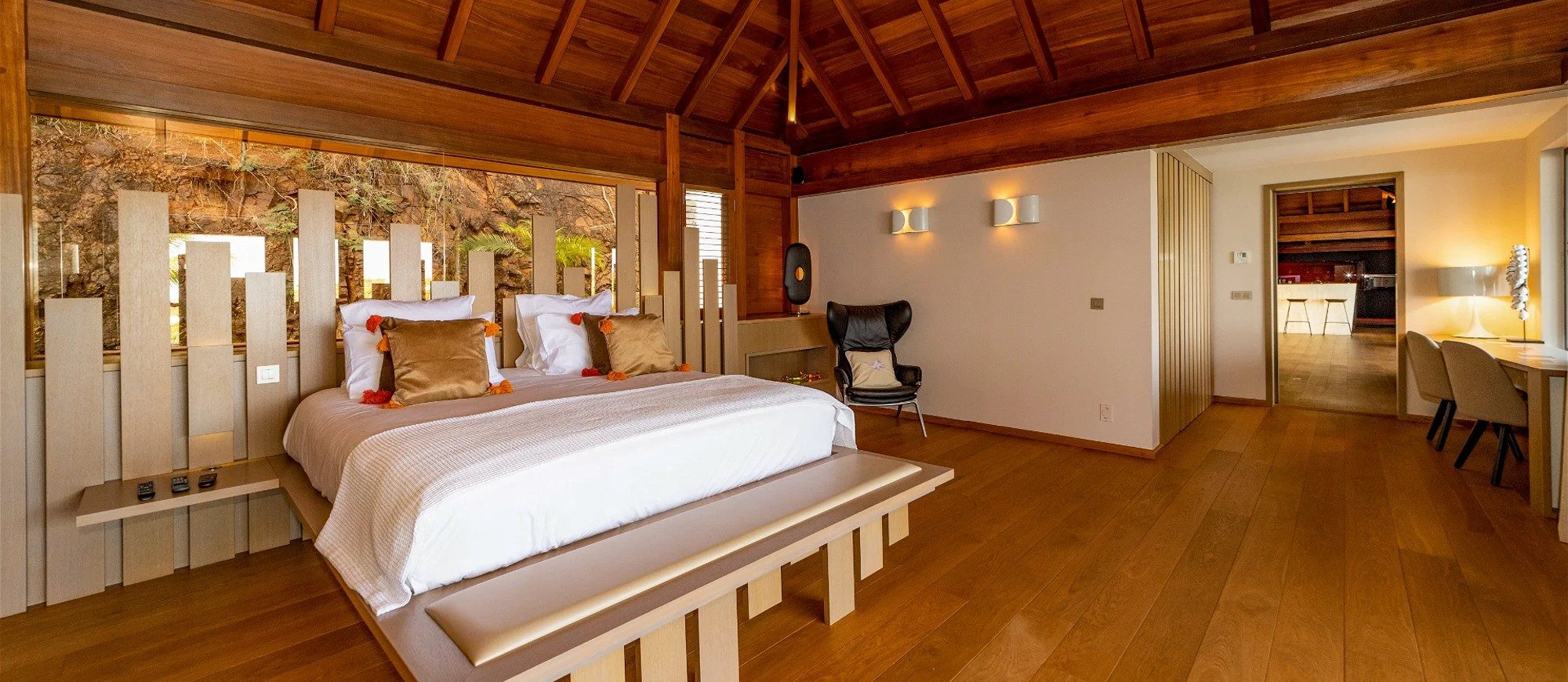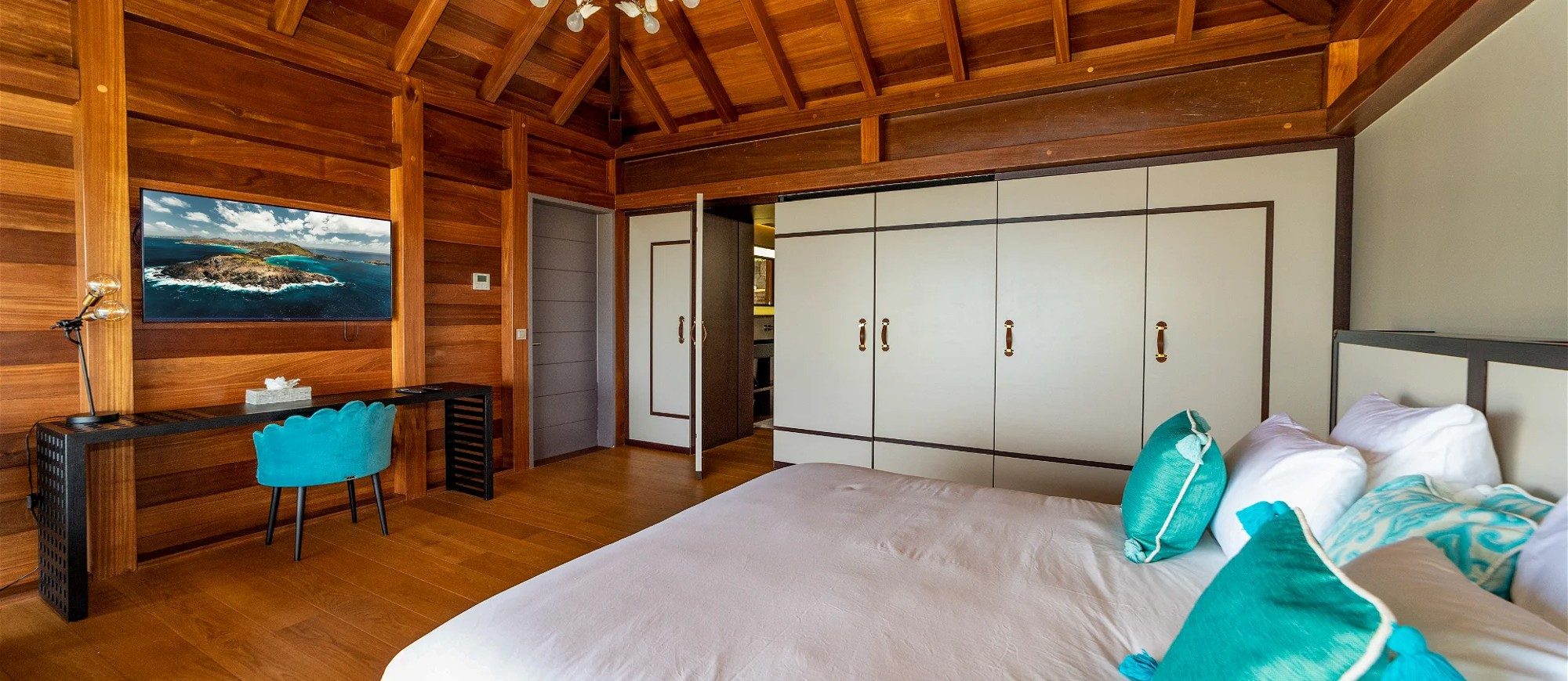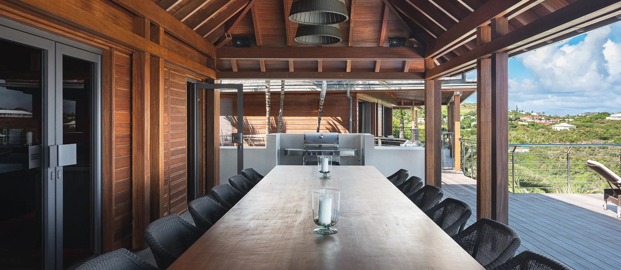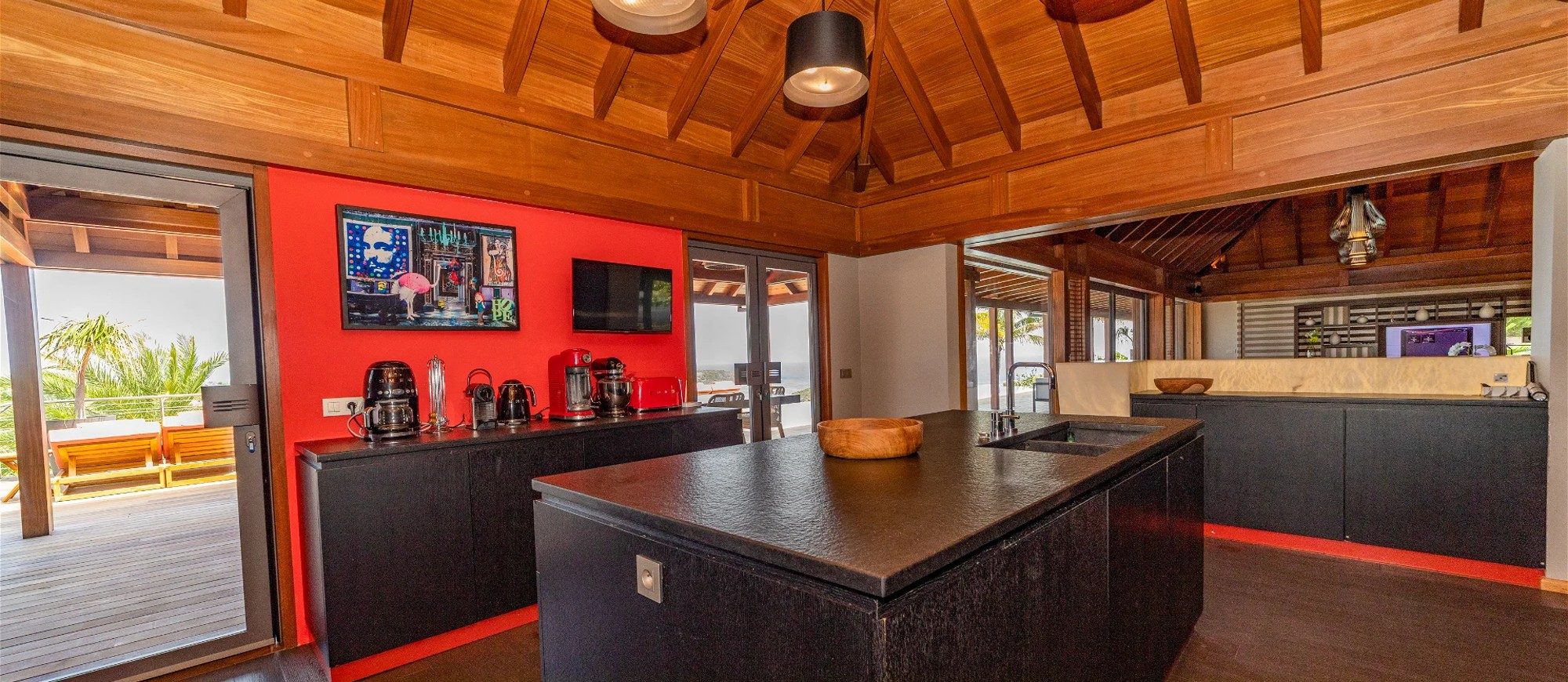 It is a luxurious and refined property with a warm-toned tropical wood decor. The spacious open-plan living room is comfortably furnished with sofas and banquettes under a beautiful honey-coloured mansard ceiling. The professional and spacious kitchen with a black lava stone made centre island is perfect for meals and snacks preparation, including a wine cellar and cold storage. The large living room provides a delightful feeling of well-being and luxury, in a warm atmosphere blown by the trade winds. Under the covered terrace, there is a dining table which can accommodate up to fourteen people, with great views over Marigot bay.