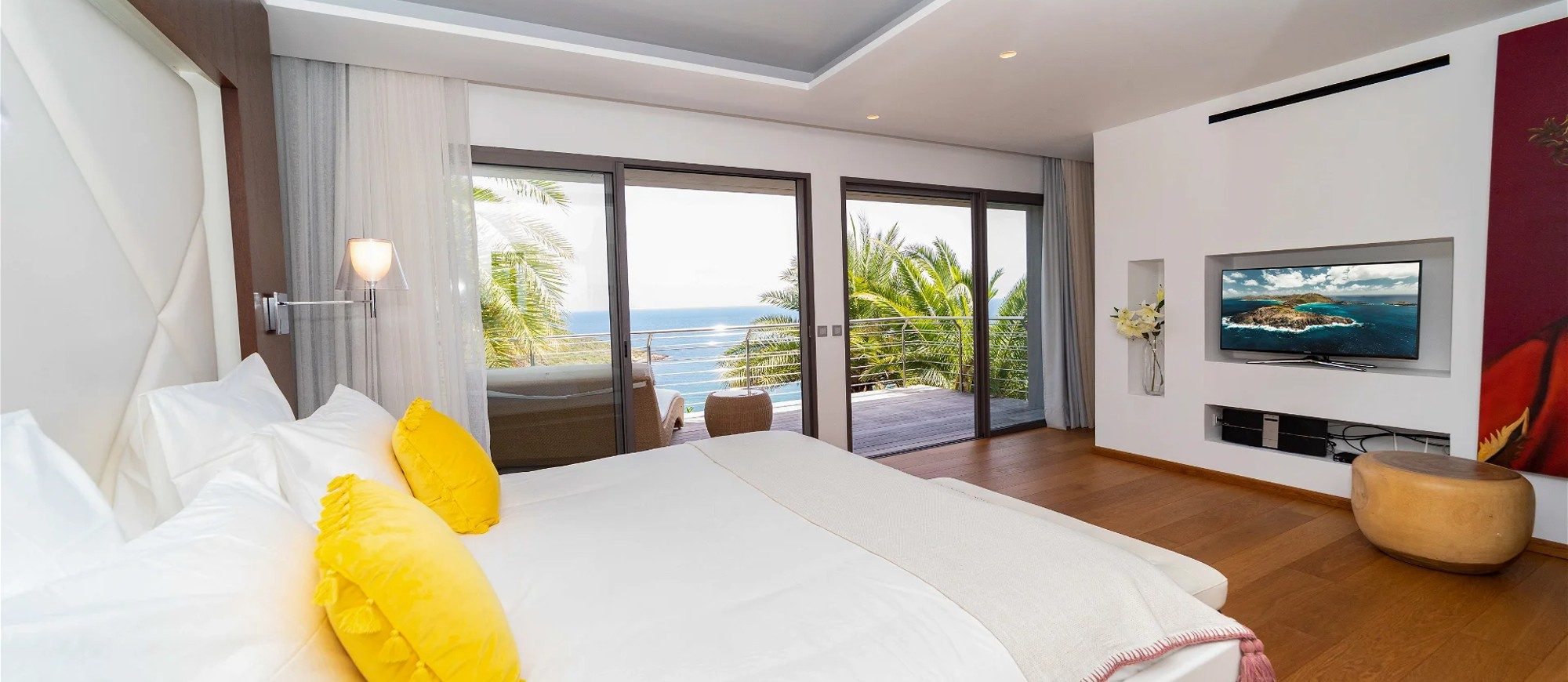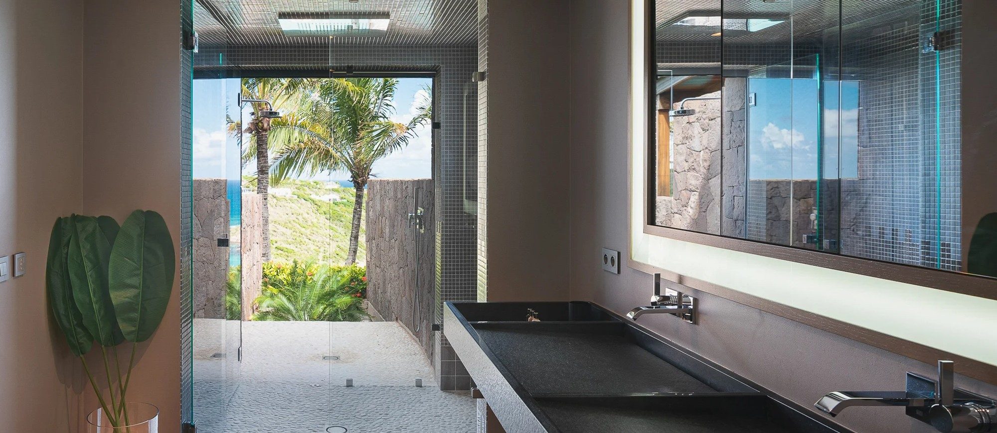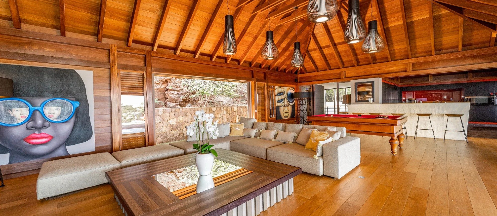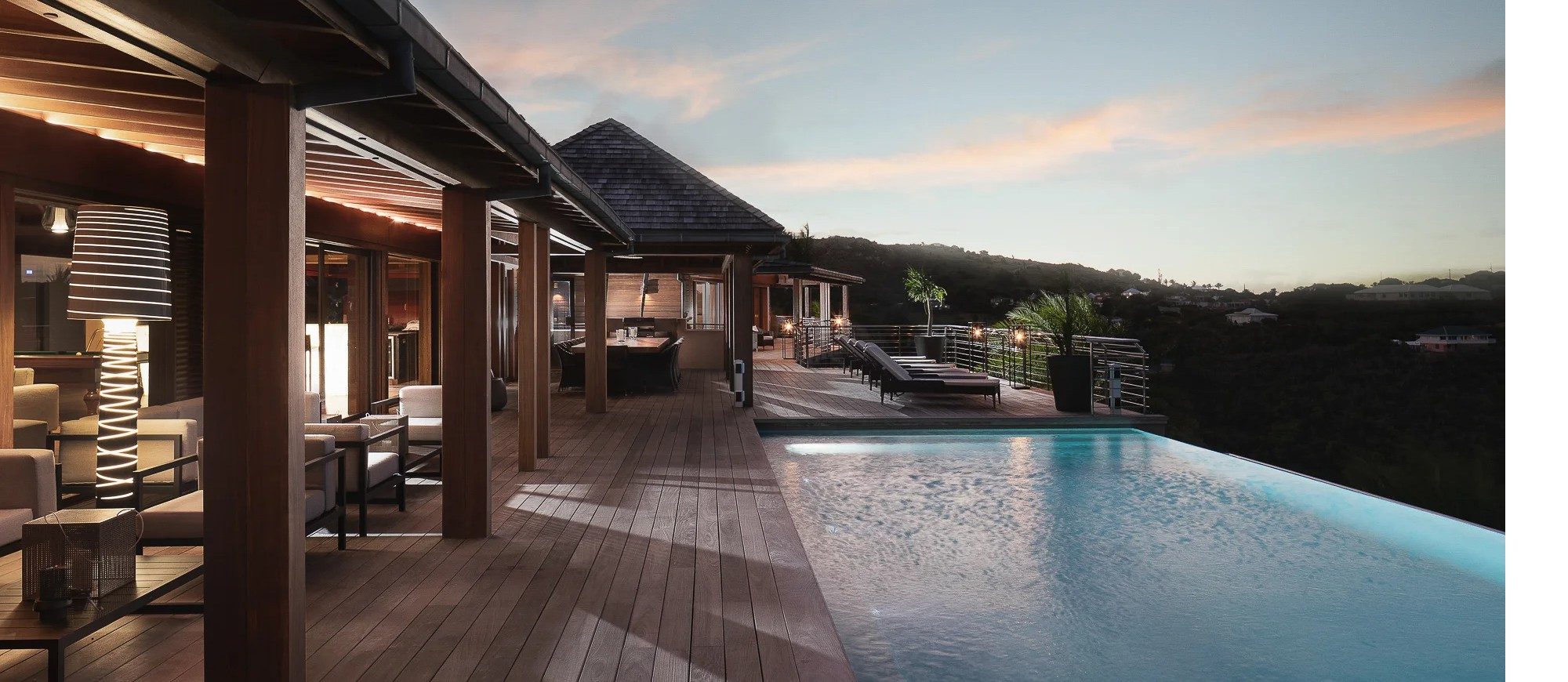 It is a luxurious and refined property with a warm-toned tropical wood decor. The spacious open-plan living room is comfortably furnished with sofas and banquettes under a beautiful honey-coloured mansard ceiling. The professional and spacious kitchen with a black lava stone made centre island is perfect for meals and snacks preparation, including a wine cellar and cold storage. The large living room provides a delightful feeling of well-being and luxury, in a warm atmosphere blown by the trade winds. Under the covered terrace, there is a dining table which can accommodate up to fourteen people, with great views over Marigot bay.