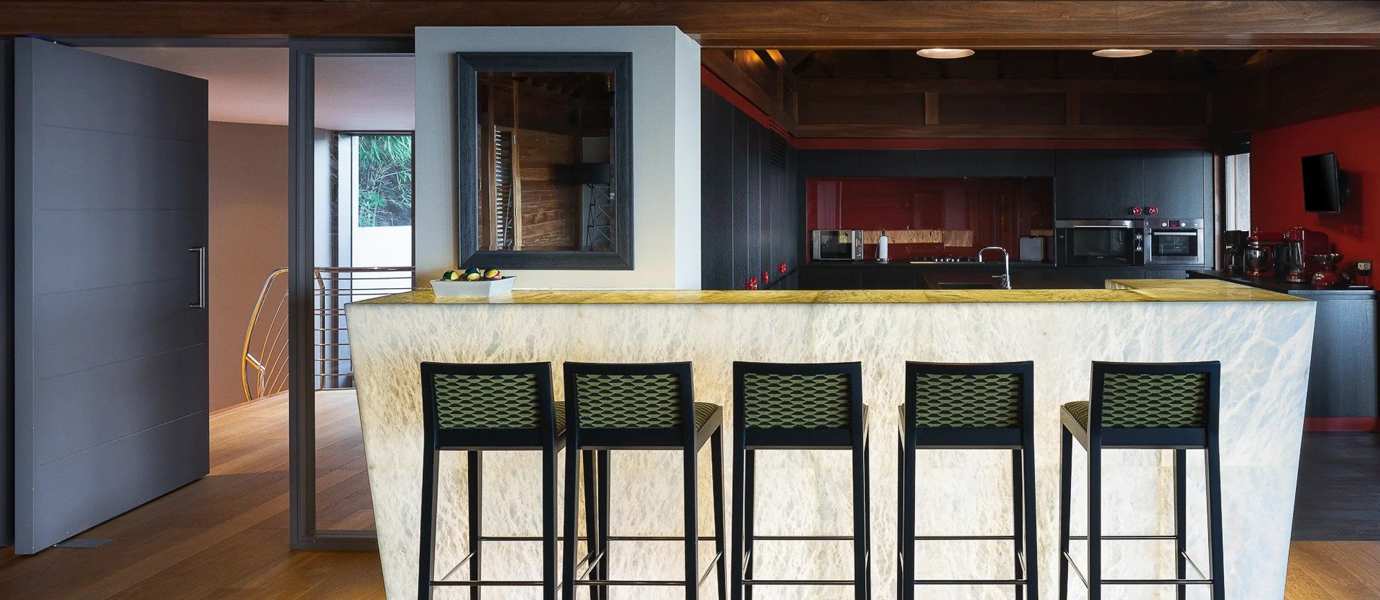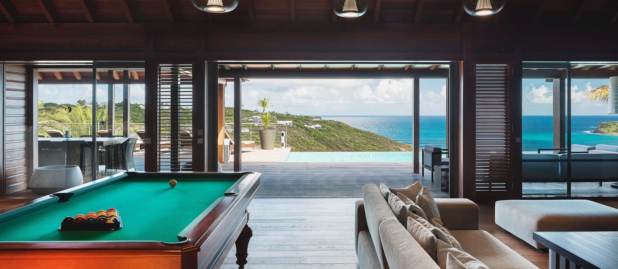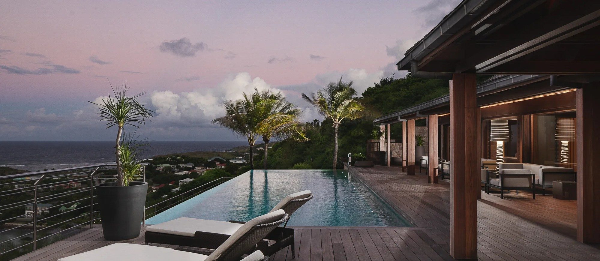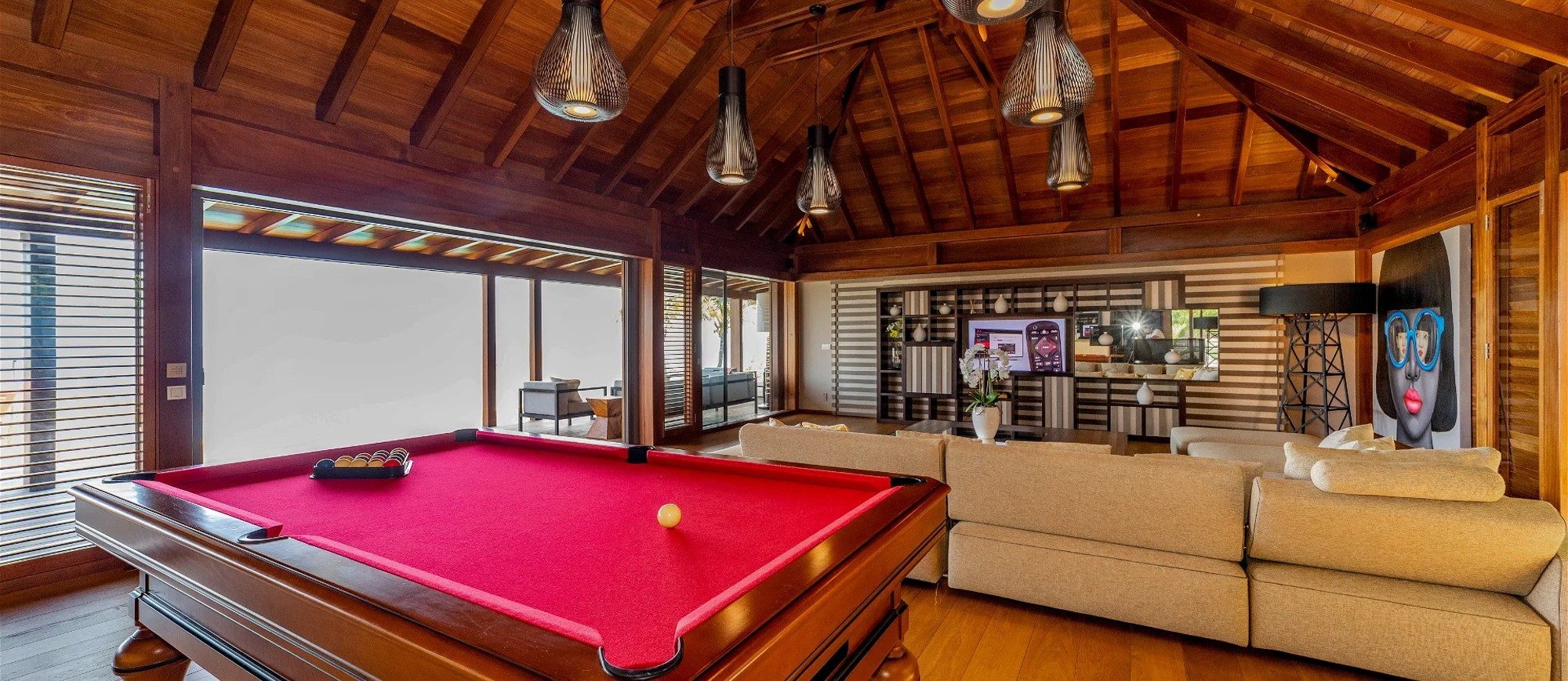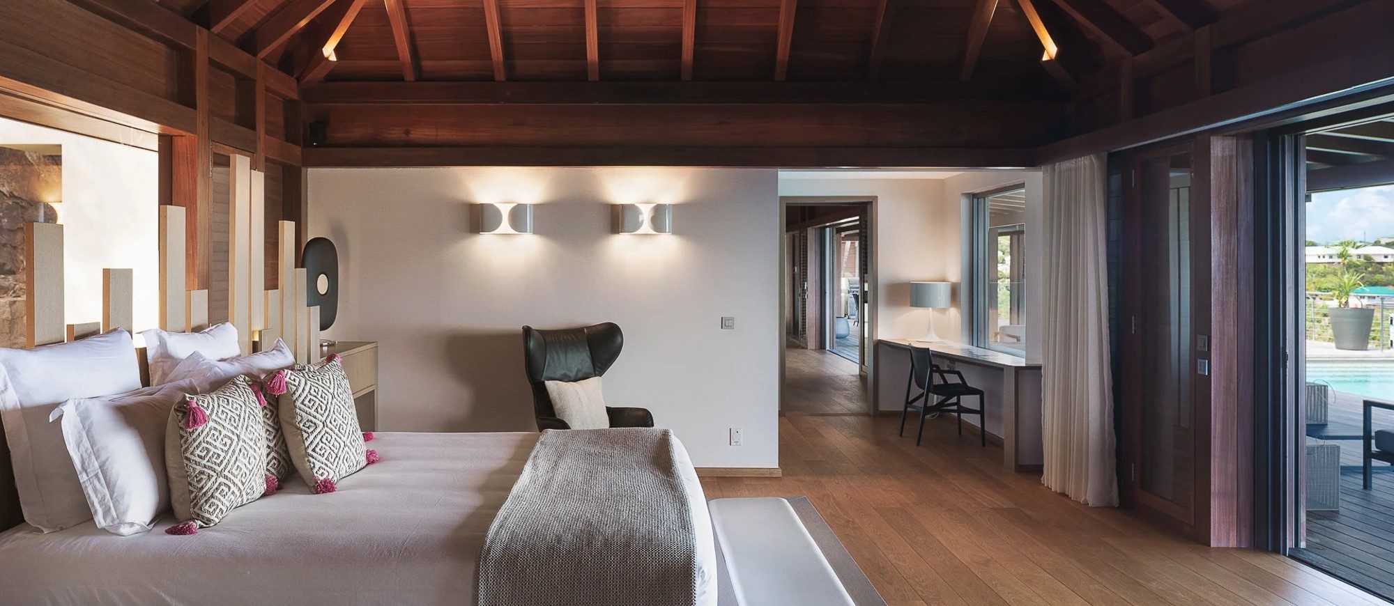 It is a luxurious and refined property with a warm-toned tropical wood decor. The spacious open-plan living room is comfortably furnished with sofas and banquettes under a beautiful honey-coloured mansard ceiling. The professional and spacious kitchen with a black lava stone made centre island is perfect for meals and snacks preparation, including a wine cellar and cold storage. The large living room provides a delightful feeling of well-being and luxury, in a warm atmosphere blown by the trade winds. Under the covered terrace, there is a dining table which can accommodate up to fourteen people, with great views over Marigot bay.
