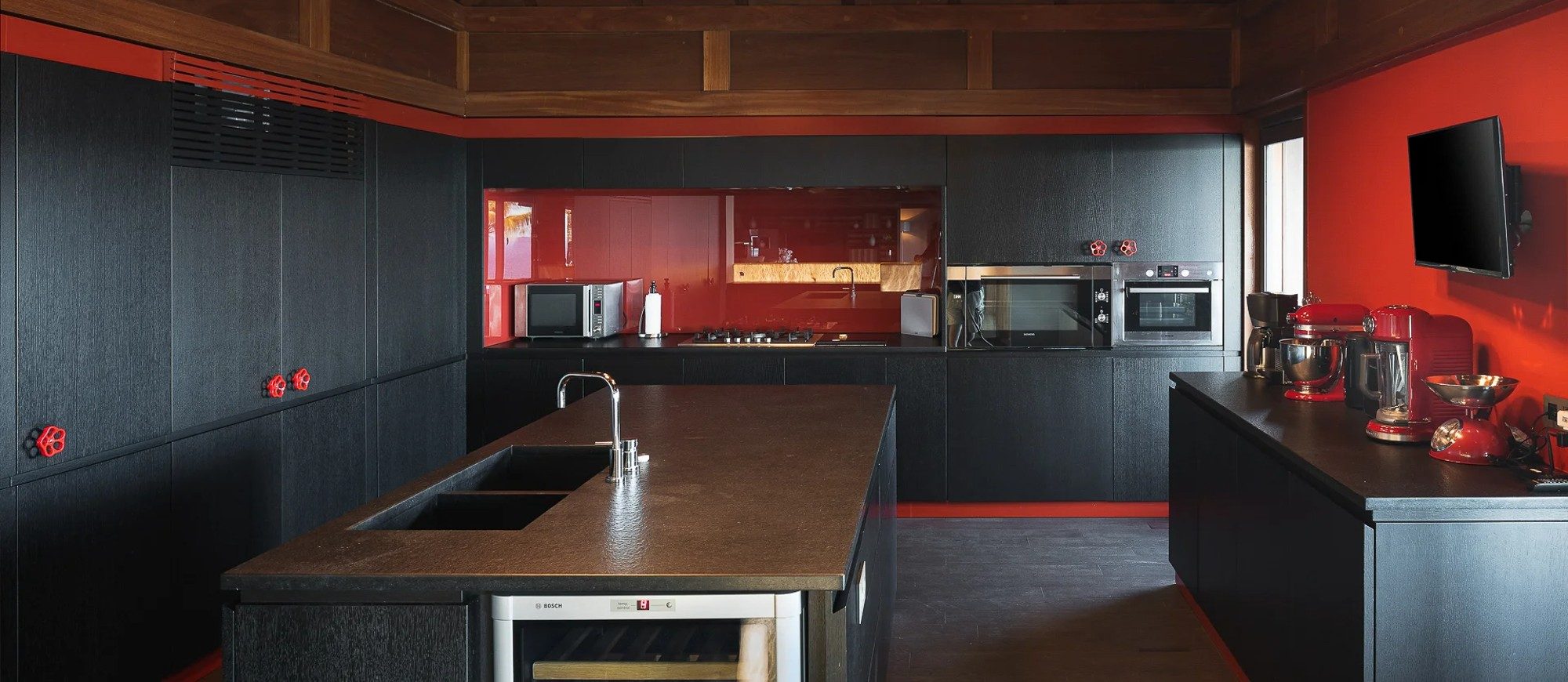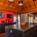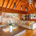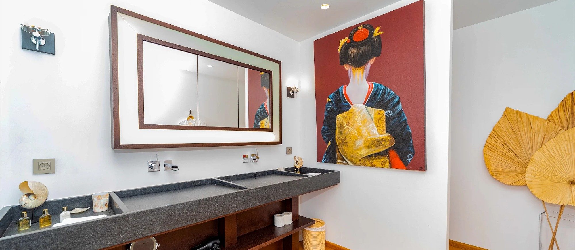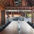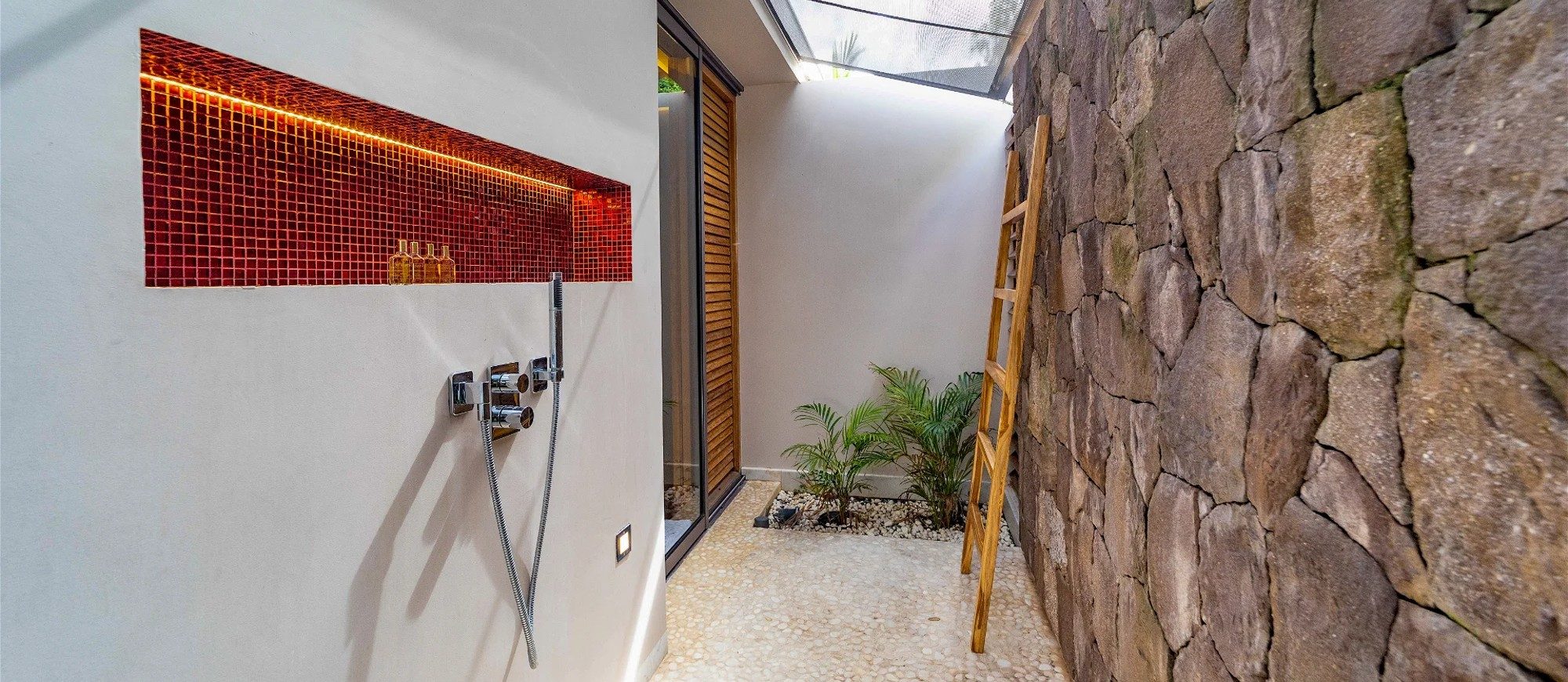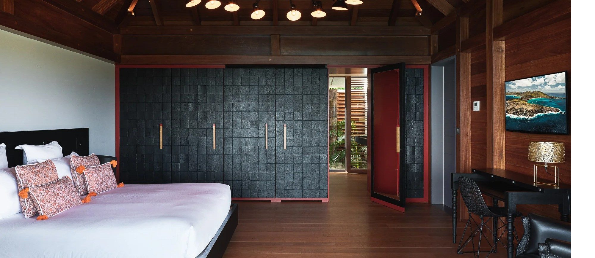 It is a luxurious and refined property with a warm-toned tropical wood decor. The spacious open-plan living room is comfortably furnished with sofas and banquettes under a beautiful honey-coloured mansard ceiling. The professional and spacious kitchen with a black lava stone made centre island is perfect for meals and snacks preparation, including a wine cellar and cold storage. The large living room provides a delightful feeling of well-being and luxury, in a warm atmosphere blown by the trade winds. Under the covered terrace, there is a dining table which can accommodate up to fourteen people, with great views over Marigot bay.