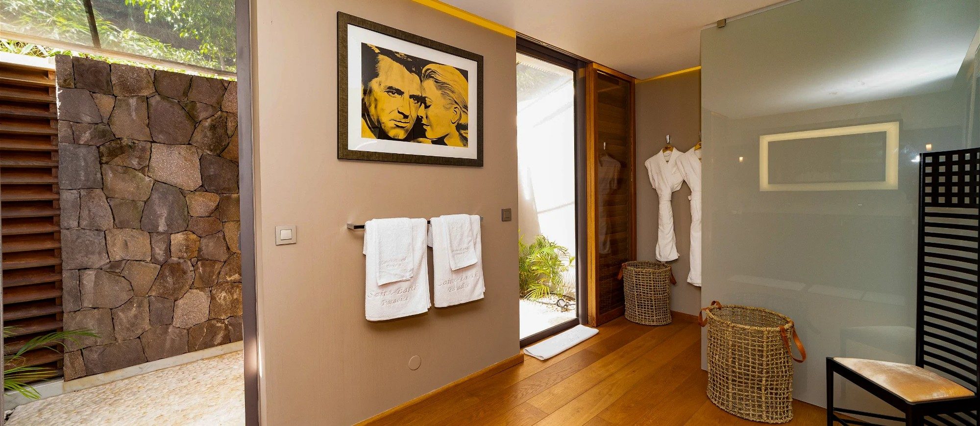 In a separate bungalow. King size bed, air conditioning, ceiling fan, HD-TV, Dish Network, safe, dressing room. Ensuite bathroom with indoor Italian shower, double sink, and WC. The bedroom opens onto the terrace and the view.