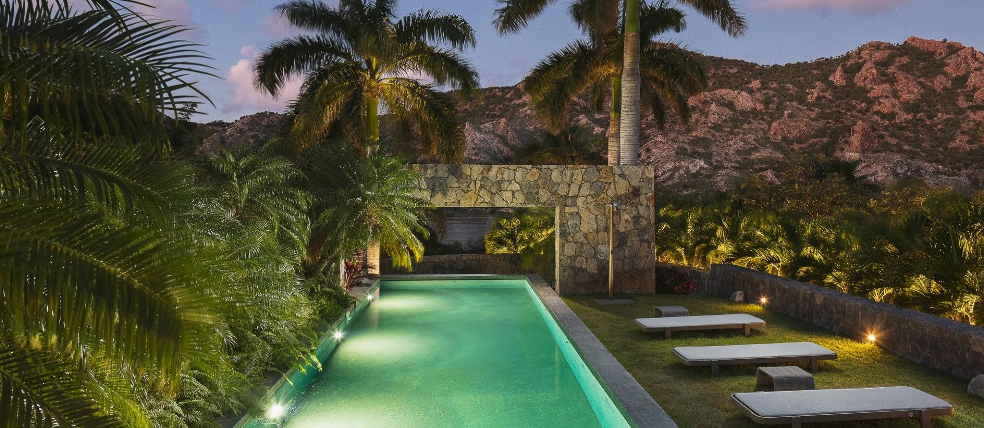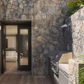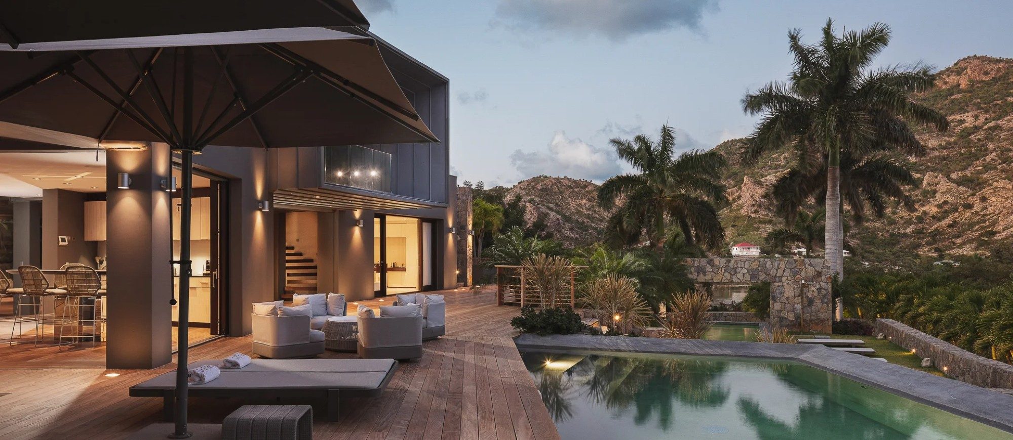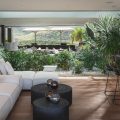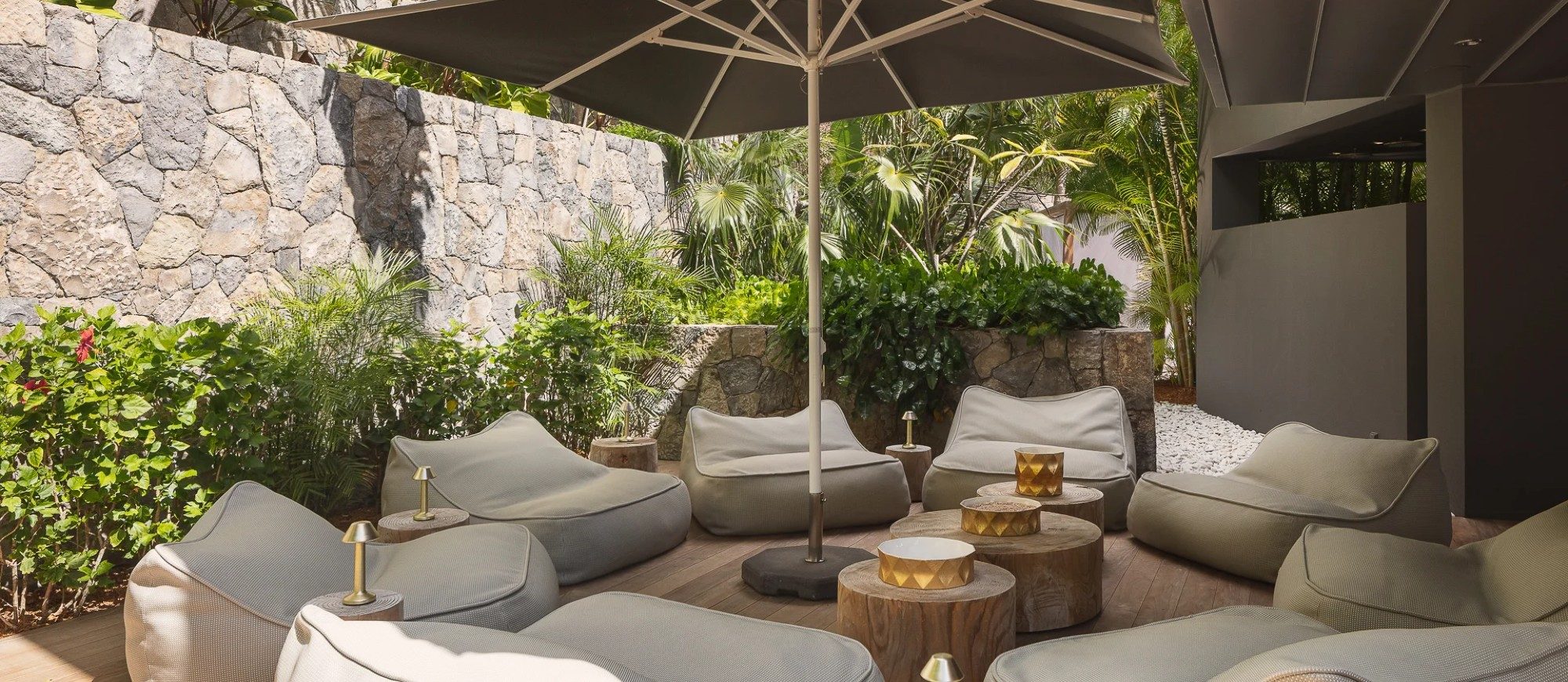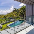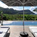 Outside, there is a large  terrace with tropical vegetation and two heated swimming pools. There are sun decks for sunbathing sessions in this idyllic environment with an amazing panorama. There is a massage area located in the tropical garden in the palapa.