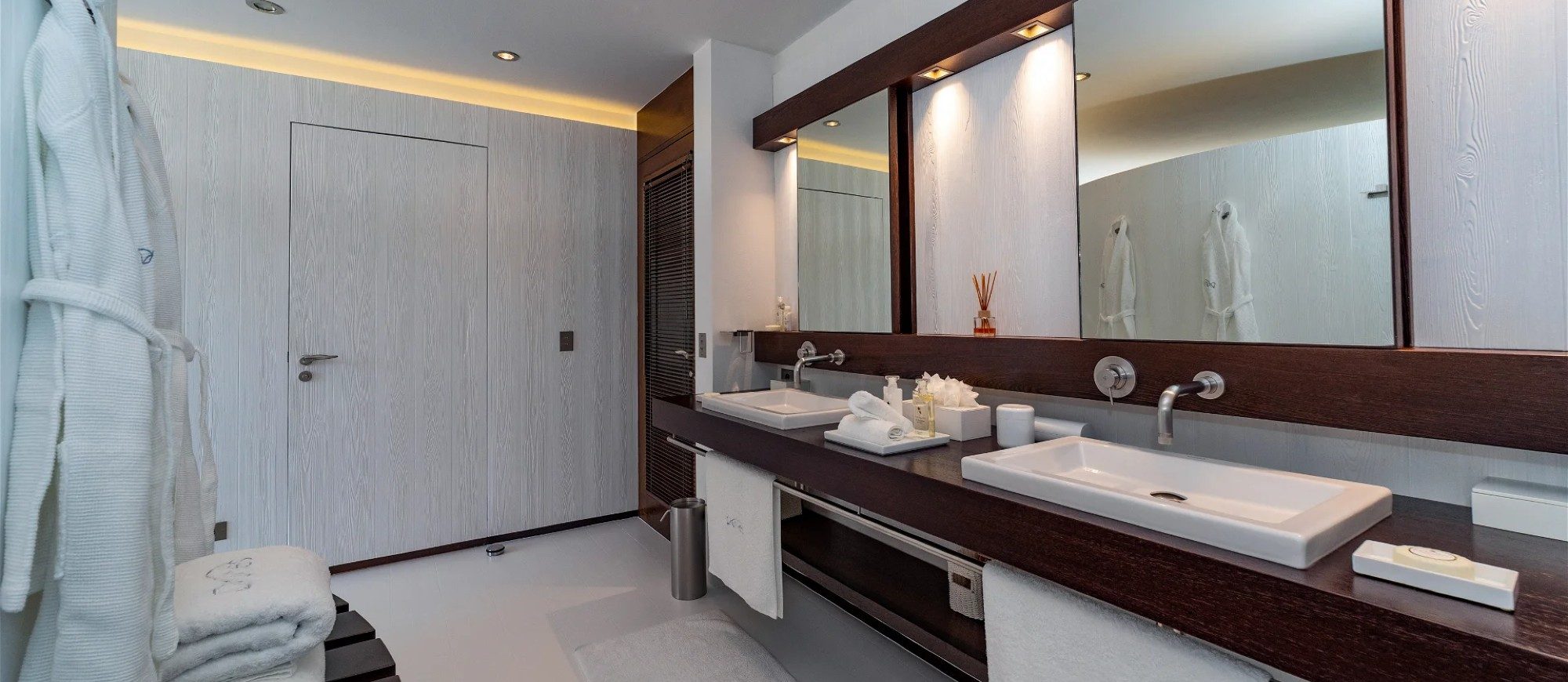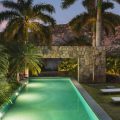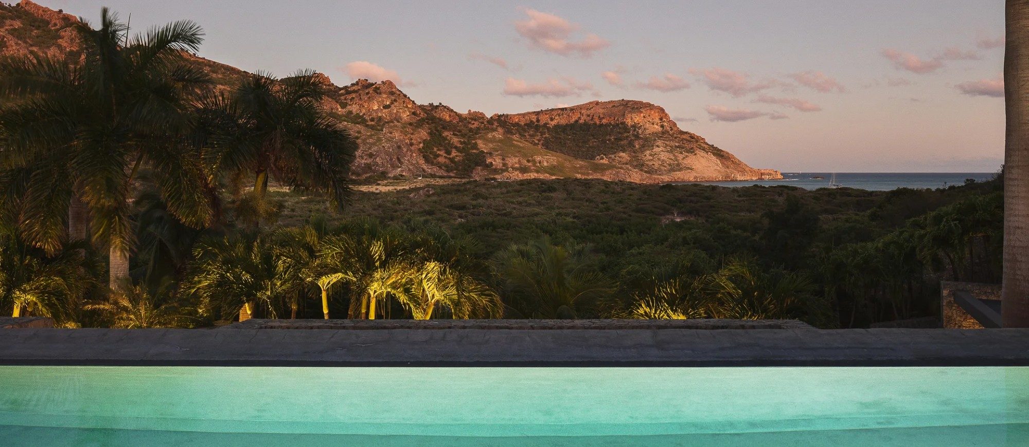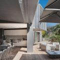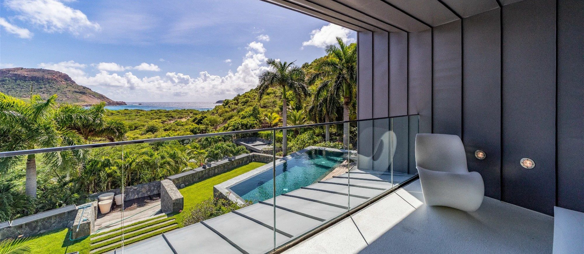 Outside, there is a large  terrace with tropical vegetation and two heated swimming pools. There are sun decks for sunbathing sessions in this idyllic environment with an amazing panorama. There is a massage area located in the tropical garden in the palapa.