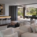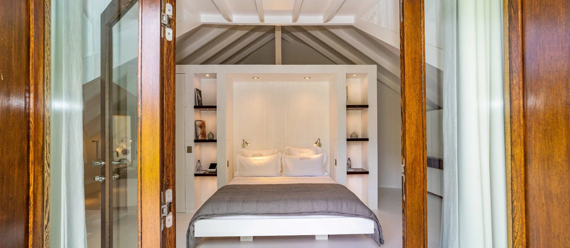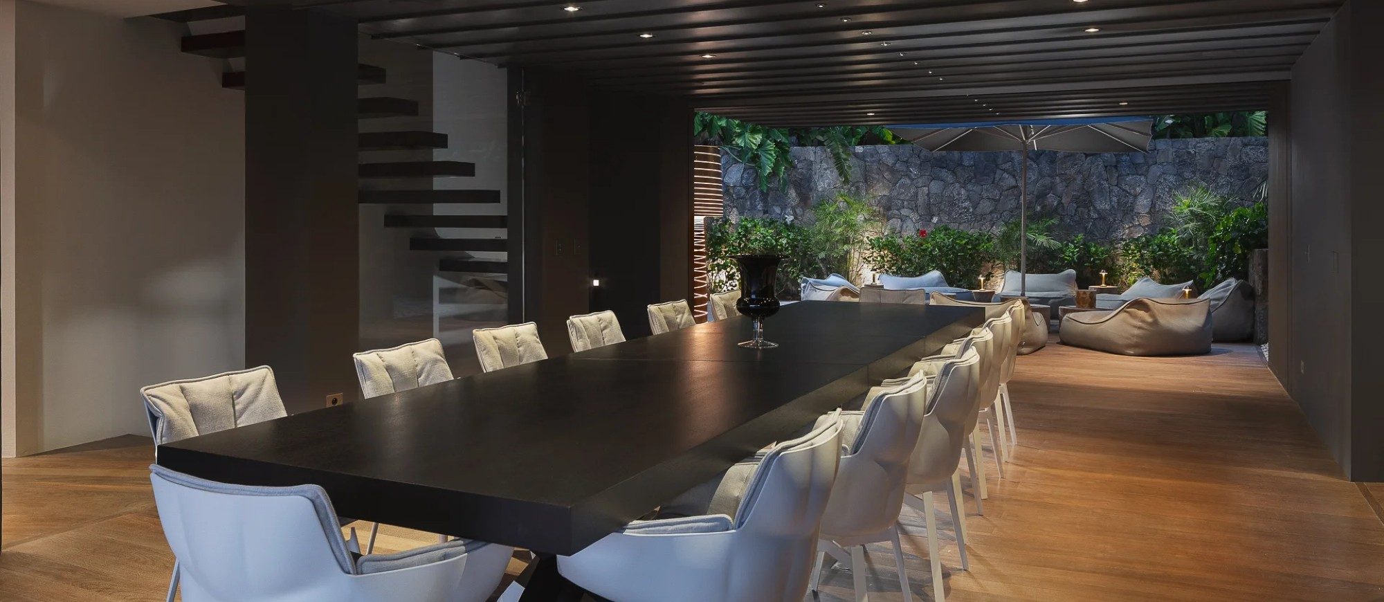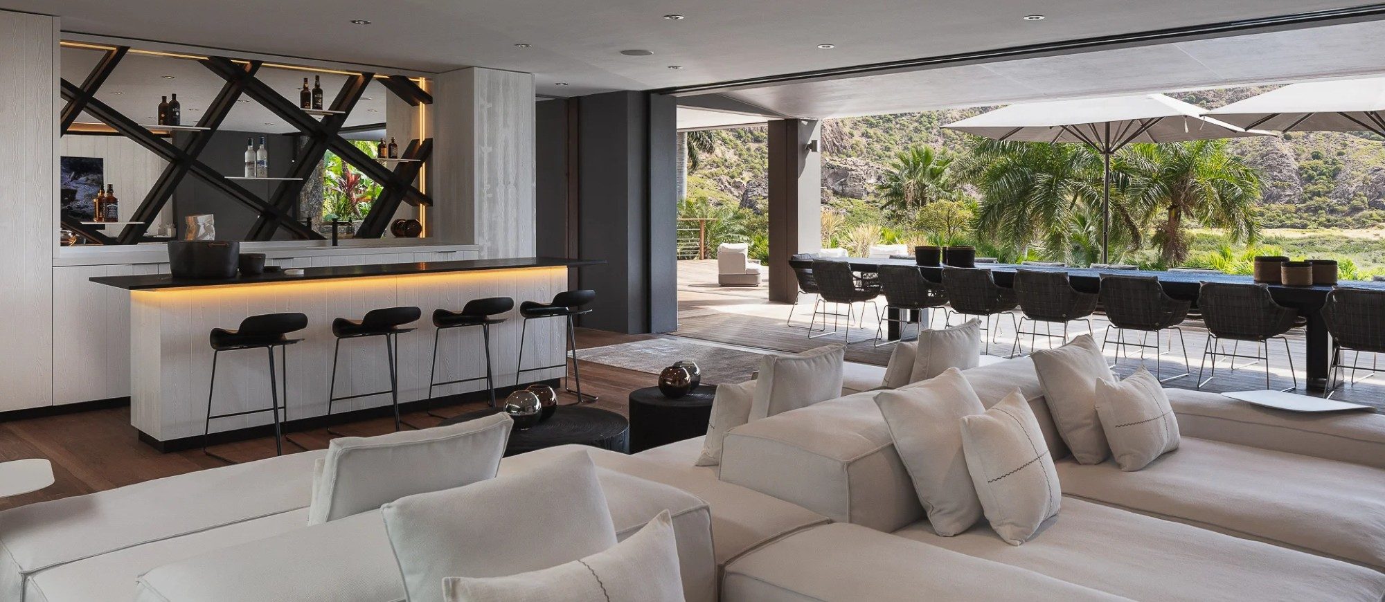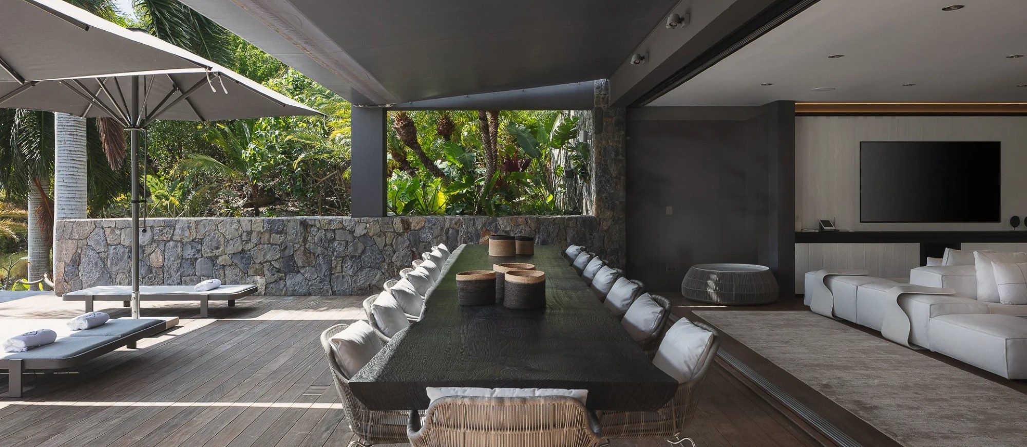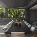 In the main house, a large living room with large white sofas offers a view over the wild nature and the ocean. The decor is contemporary and comfortable, with a beautiful palette of soft natural tones and white. There is a professional kitchen for self-catering or for a private chef . The dining room offers a large table that can accommodate up to twenty guests; there is a second table is under the covered terrace for dining in the gentle island breeze.