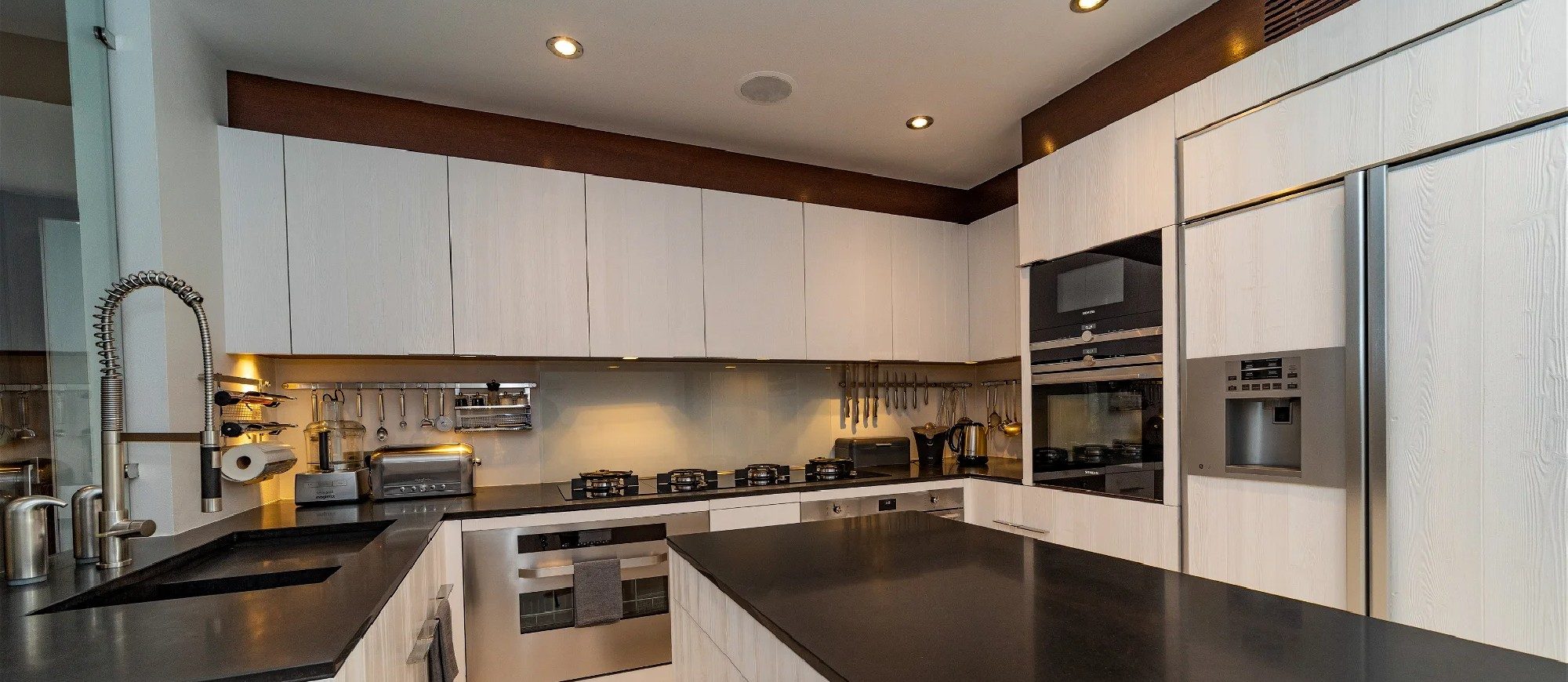 Air-conditioned and fully equipped, steam oven, electric oven, gas stove, microwave, refrigerator and freezer, ice machine, dishwasher, food processor, electric kettle, citrus press, blender. Second kitchen area with bar, refrigerators, ice maker, dishwasher and glass washer, filter coffee maker and Nespresso coffee machine. Gas barbecue area at the back of the living room .
