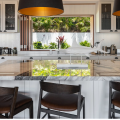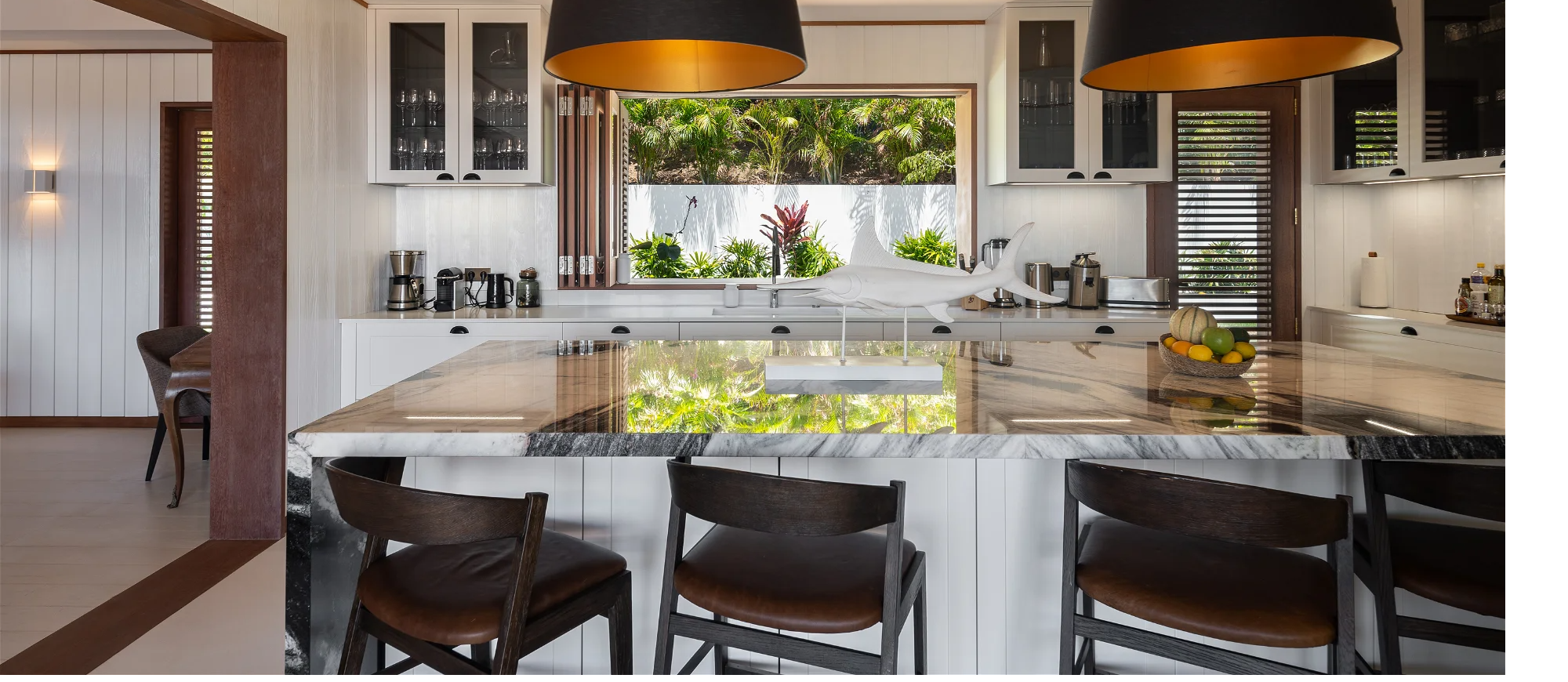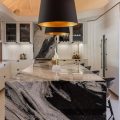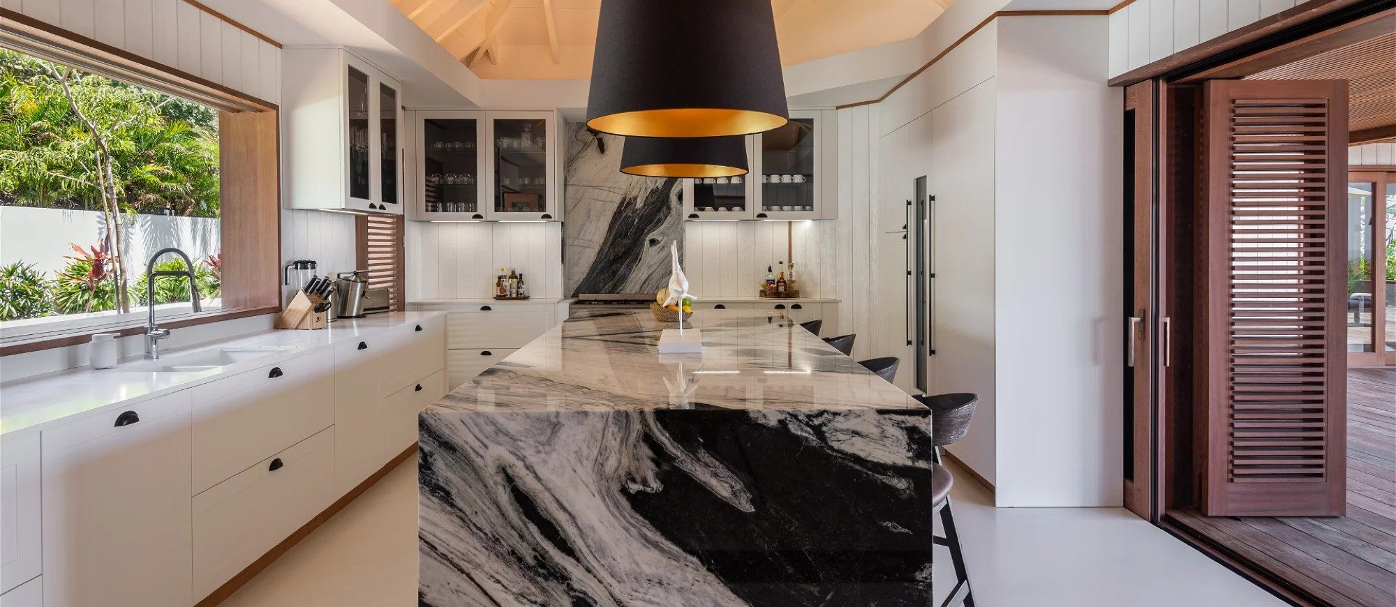 The large living room with its vaulted ceiling, connects to the kitchen which features a breakfast island made of black marble, with its sleek bar stools.