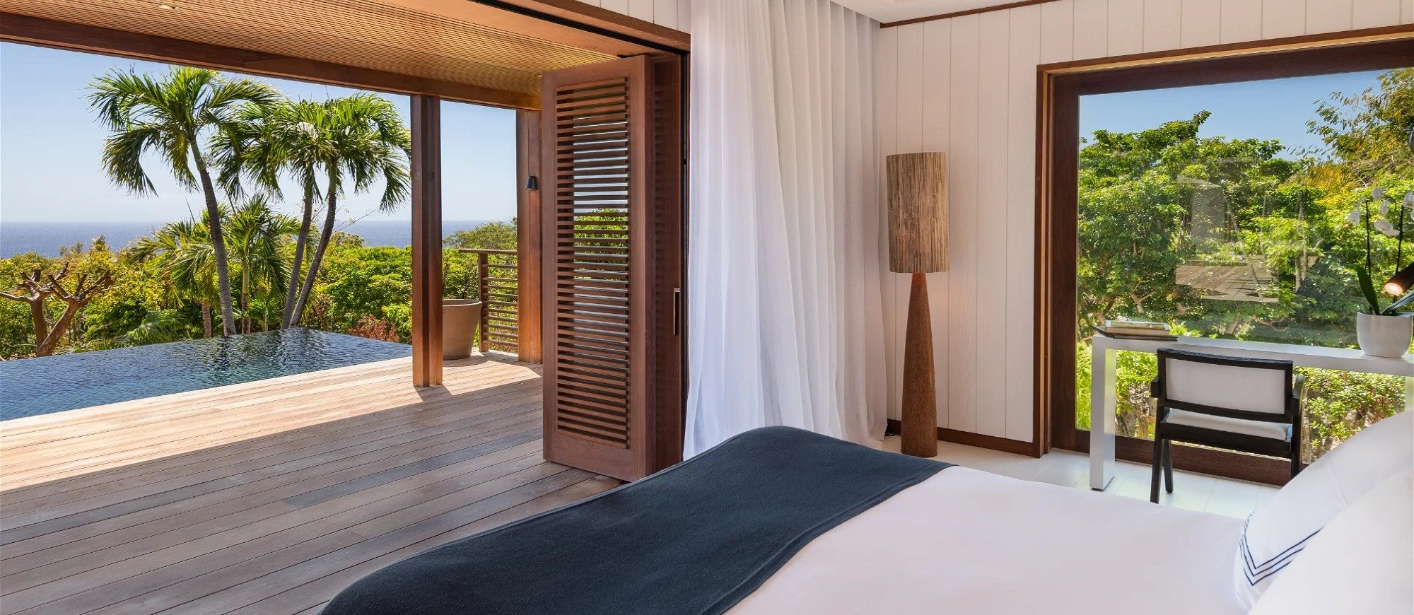 King size bed, air conditioning, ceiling fan, overhead projector, satellite channel, Dish Network, sound system, safe. Ensuite bathroom with rain shower, double sink, hairdryer. Outdoor shower. The bedroom opens onto the terrace and the pool.