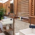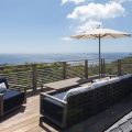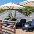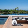 There are spacious terraces, an extra long pool perfect for laps and a large wooden dining table comfortably seating twelve. There is a jacuzzi built into the deck. A wooden staircase leads to the upper level, with its stunning roof terrace, perfect to watch the sunset.
