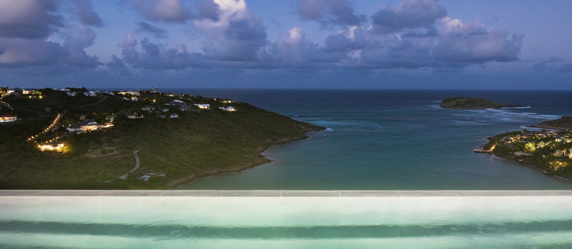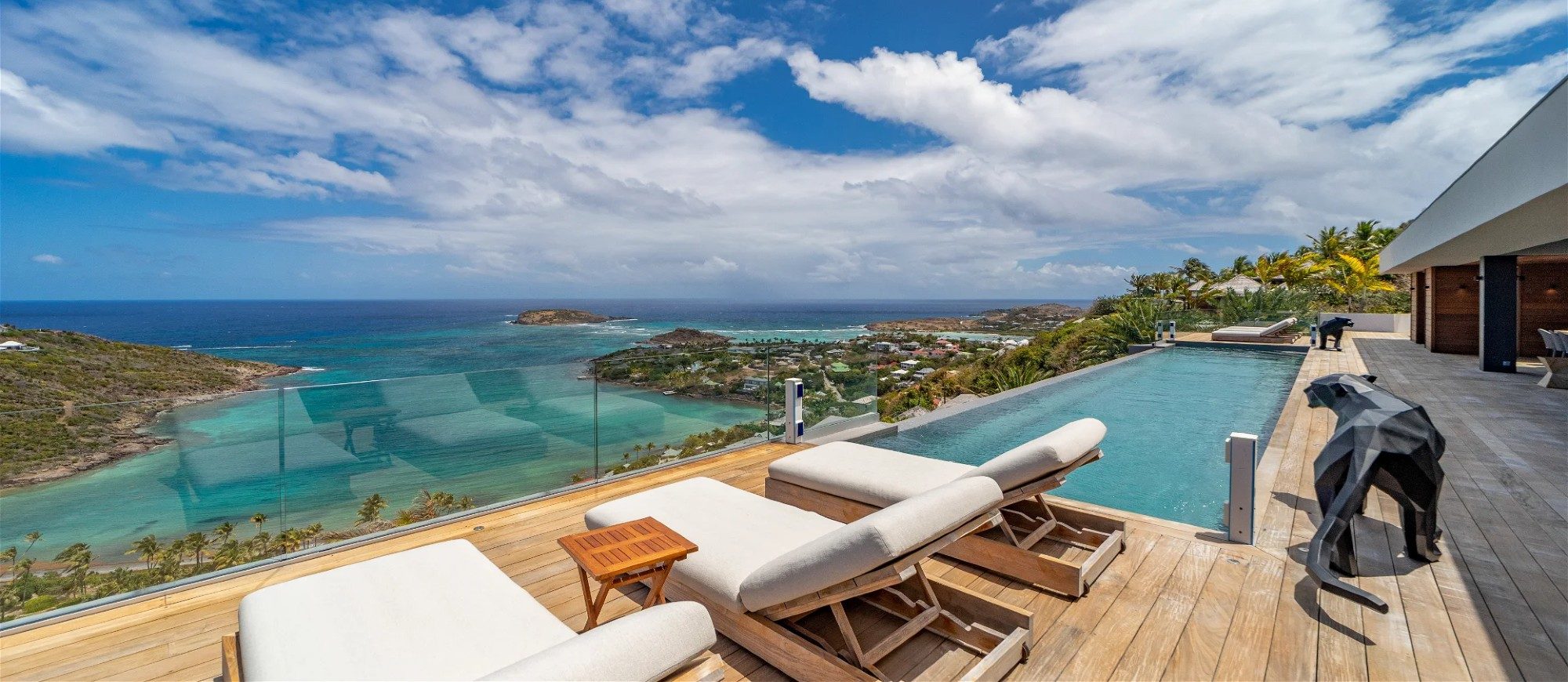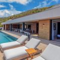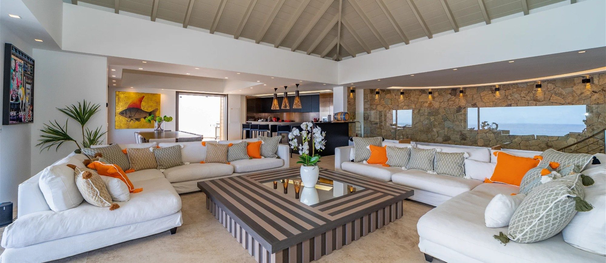 A very spacious seven bedroom villa in Marigot with a great view over Grand-Cul-de-Sac and Turtle Island in the distance. There are large and wide spaces, as well as bay windows that play with transparency, all in a contemporary and inspired architecture. The living room has two oversized sofas around a large square coffee table. The indoor dining room is located in the same open space in front of the stunning ocean view, close to the well-equipped kitchen with a long breakfast bar.