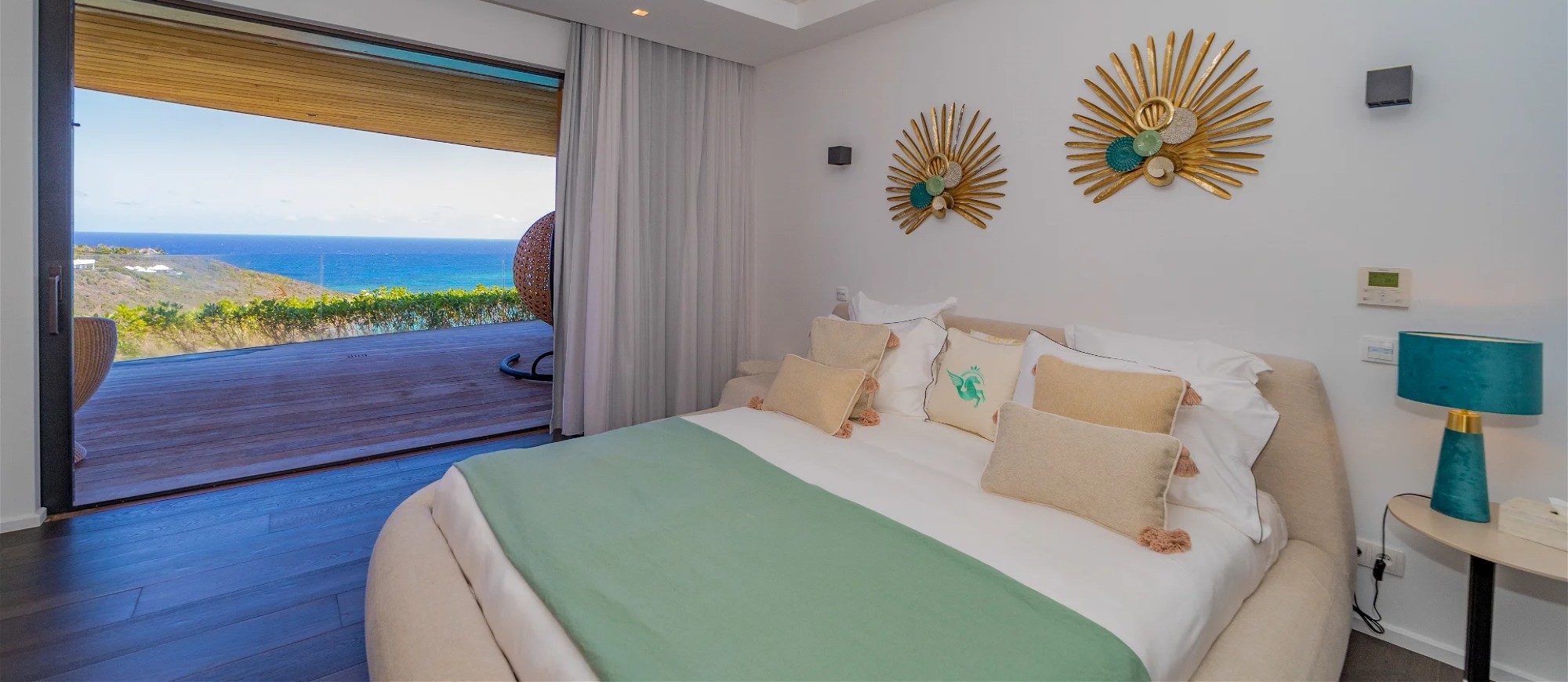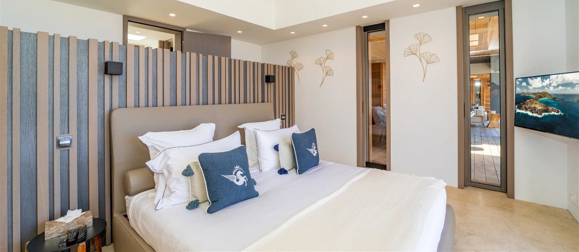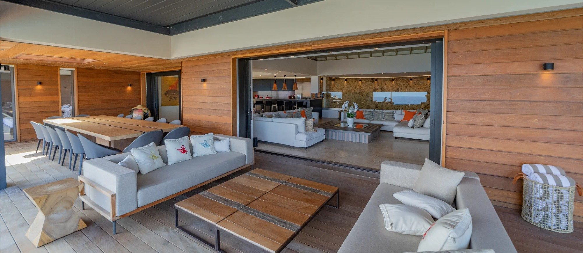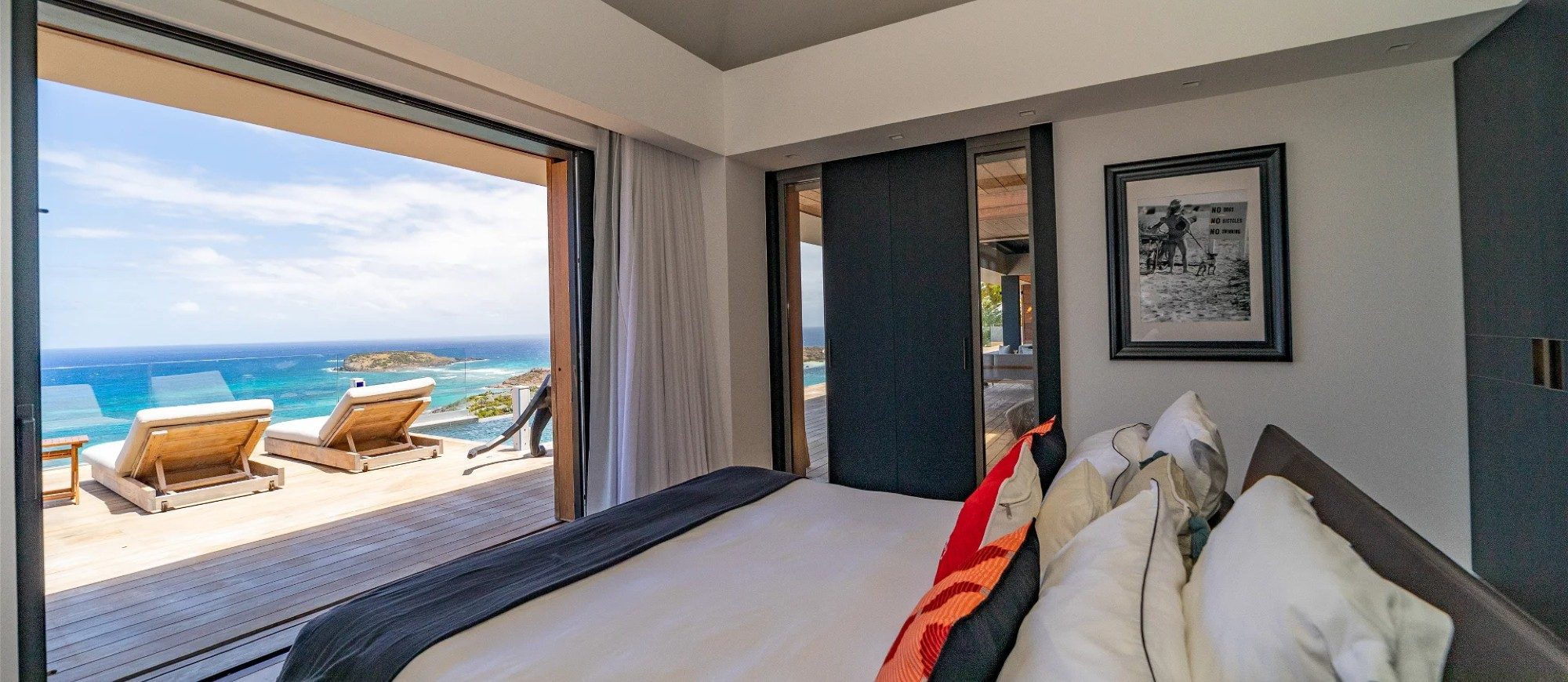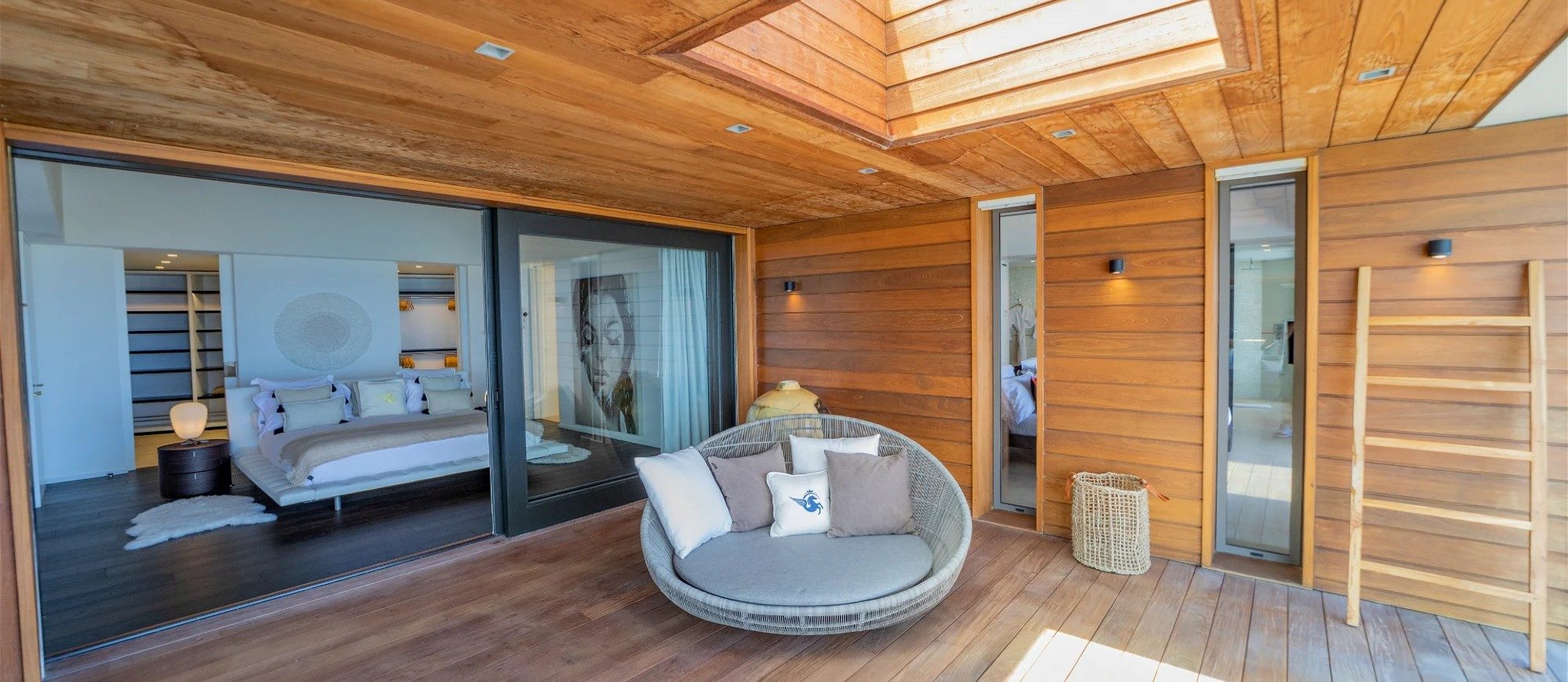 At the front of this outstanding villa, the terrace is designed around a long infinity swimming pool seeming to merge with the deep blue ocean. Sun loungers, an outdoor covered dining room for al fresco dining, and garden living room……. In the gentle breeze of the trade winds, time seems suspended, allowing guests to fully enjoy cocktails and the beauty of the idyllic scenery.