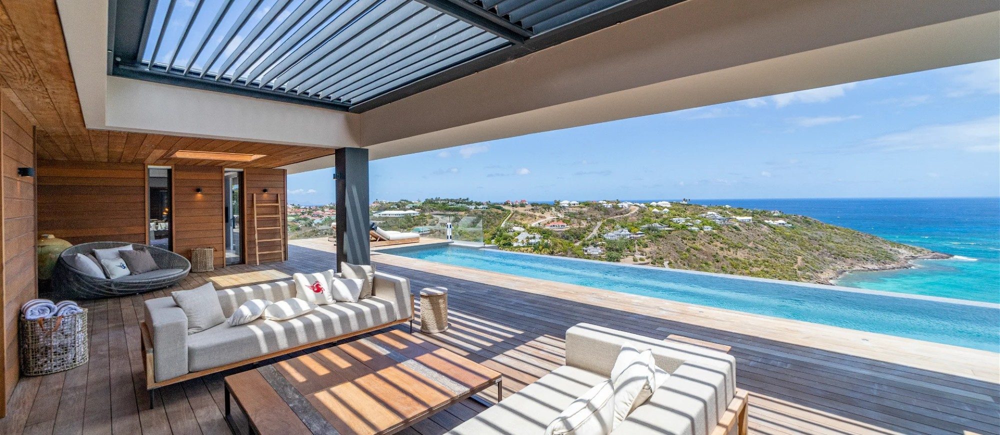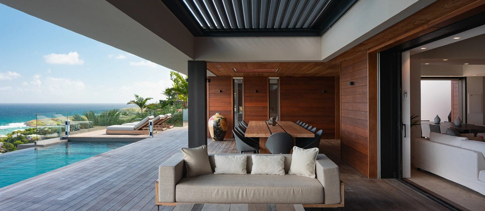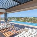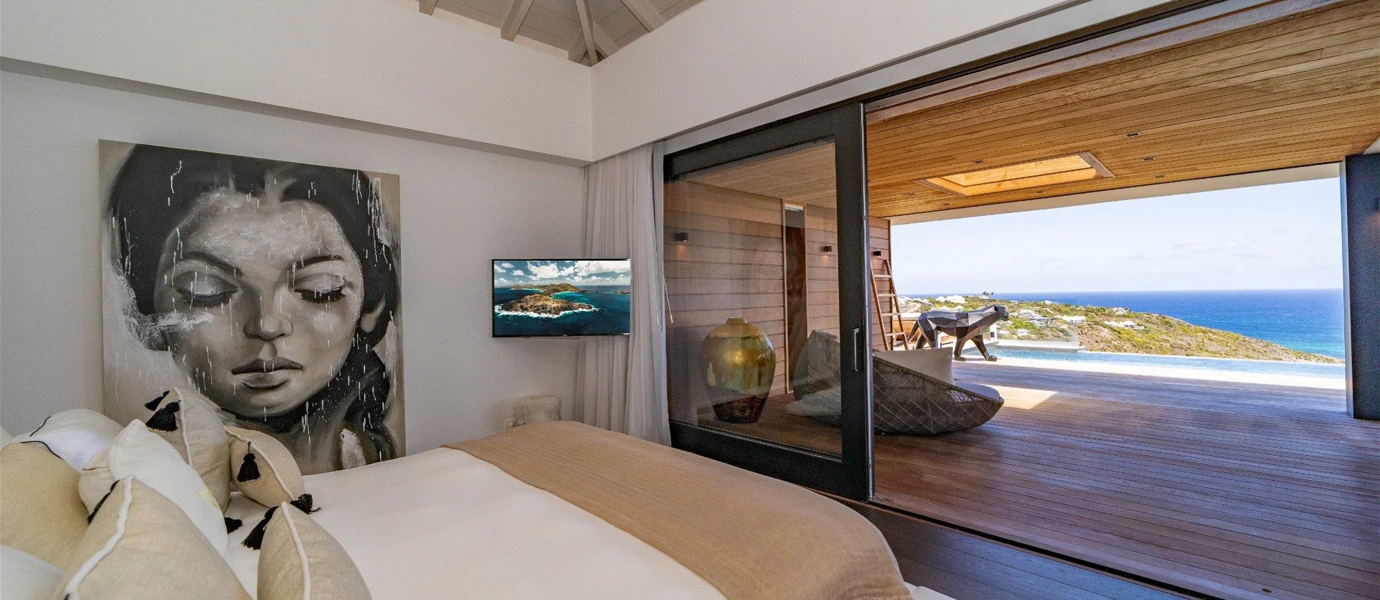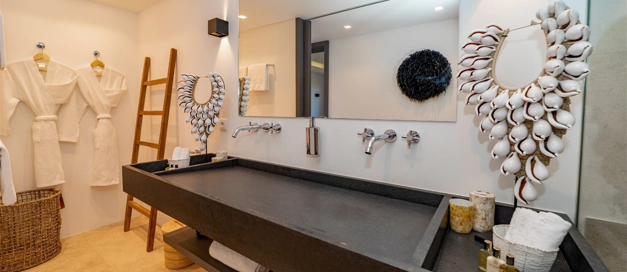 At the front of this outstanding villa, the terrace is designed around a long infinity swimming pool seeming to merge with the deep blue ocean. Sun loungers, an outdoor covered dining room for al fresco dining, and garden living room……. In the gentle breeze of the trade winds, time seems suspended, allowing guests to fully enjoy cocktails and the beauty of the idyllic scenery.