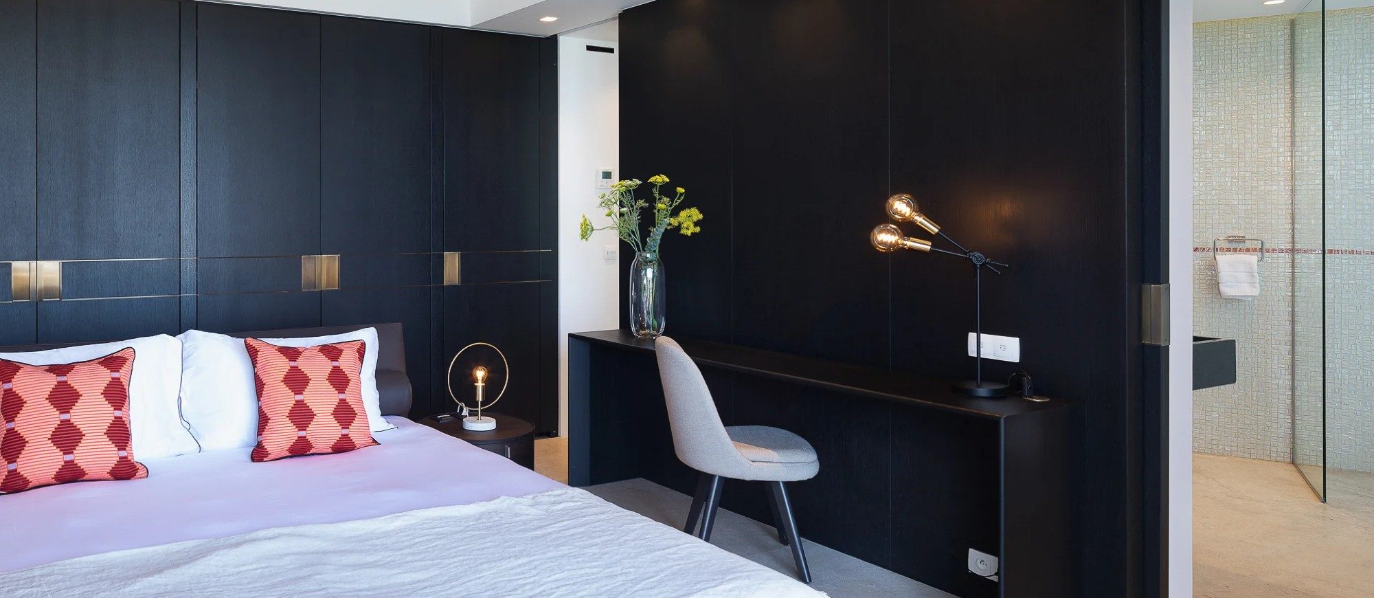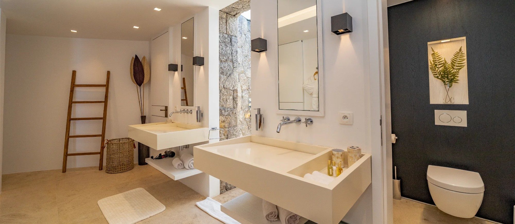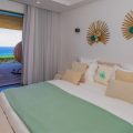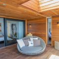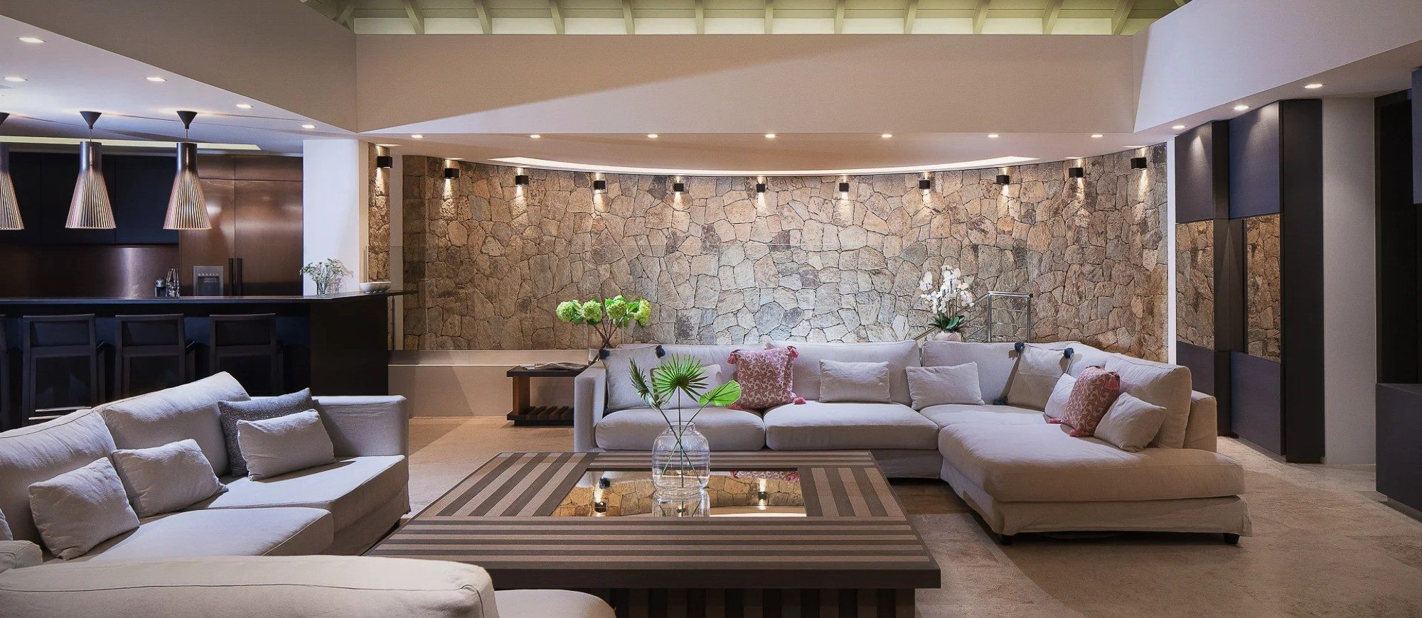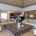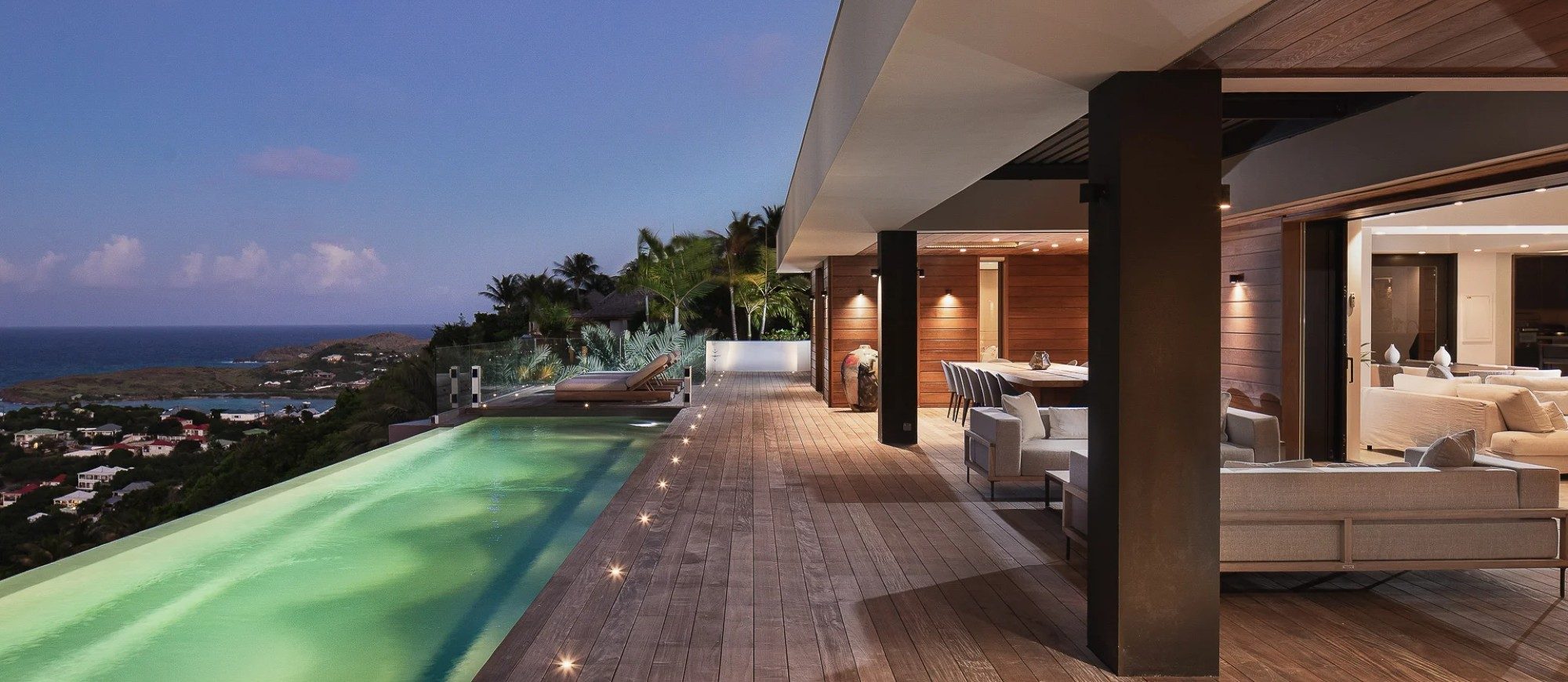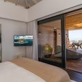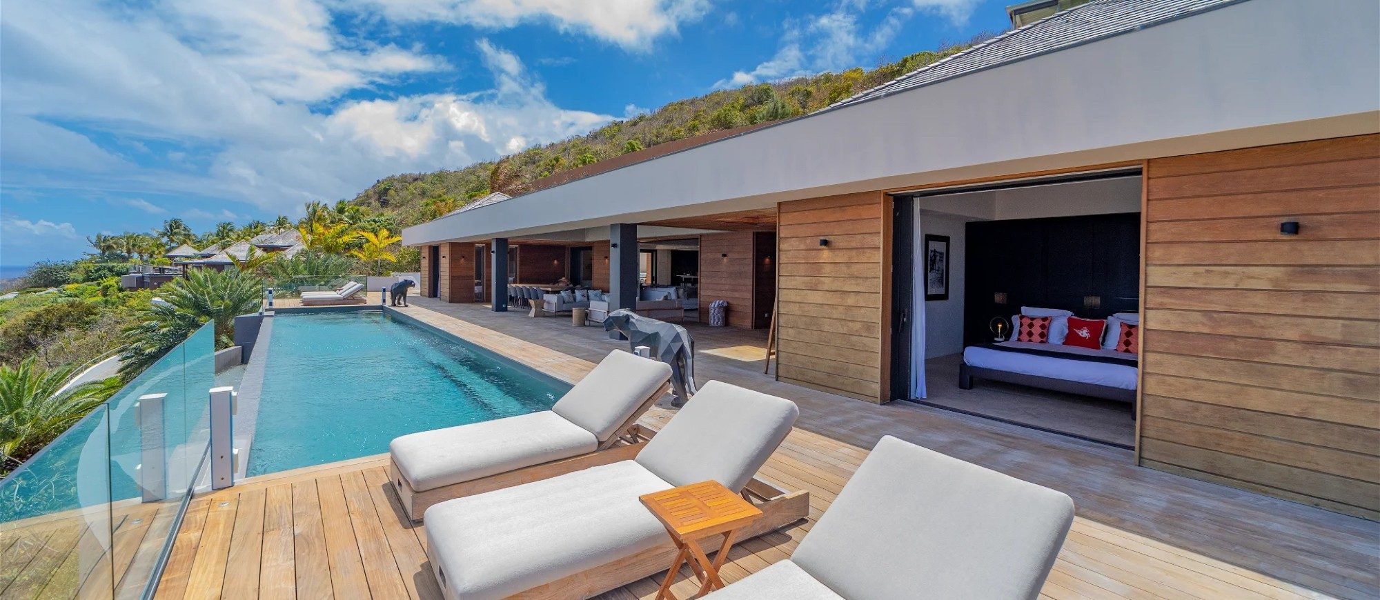 At the front of this outstanding villa, the terrace is designed around a long infinity swimming pool seeming to merge with the deep blue ocean. Sun loungers, an outdoor covered dining room for al fresco dining, and garden living room……. In the gentle breeze of the trade winds, time seems suspended, allowing guests to fully enjoy cocktails and the beauty of the idyllic scenery.