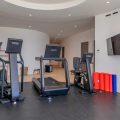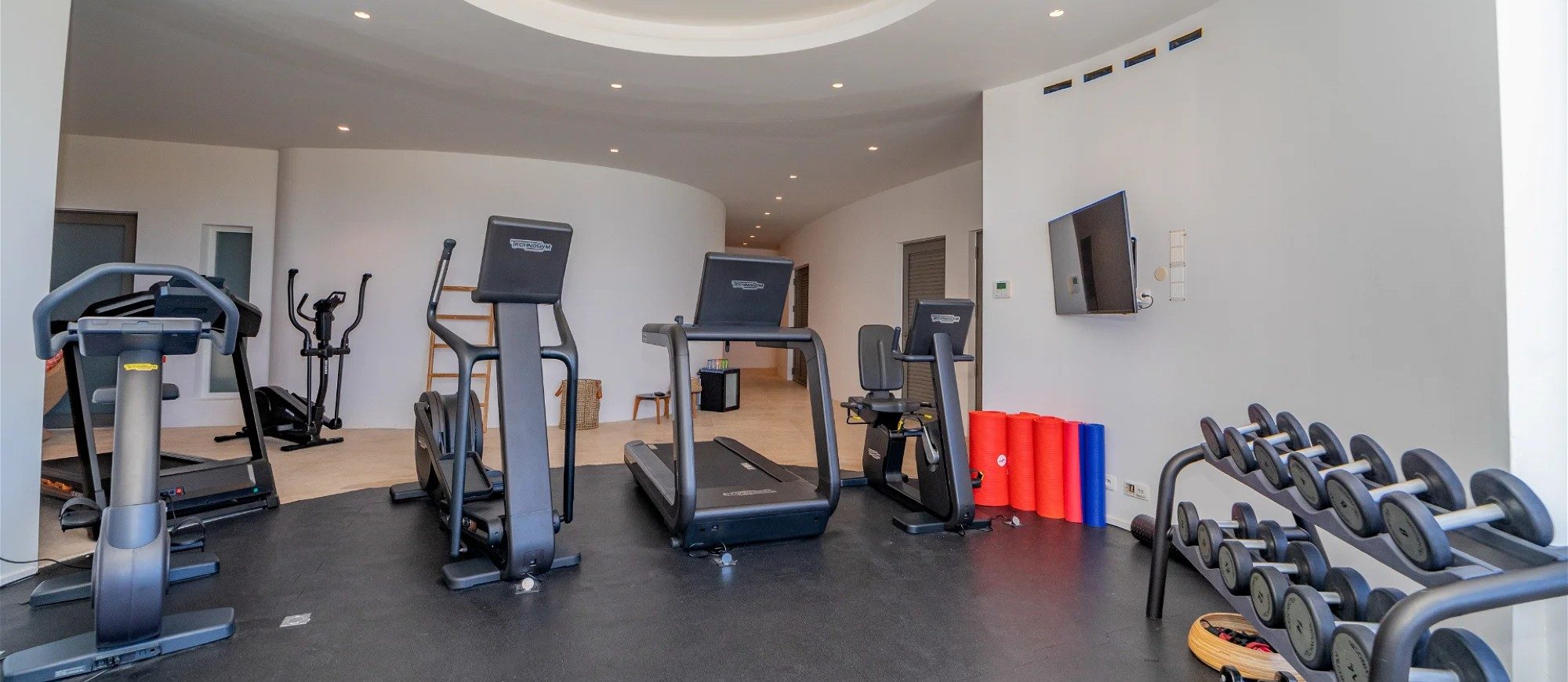 On the lower level. Air conditioned fitness room equipped with treadmill, bicycle.