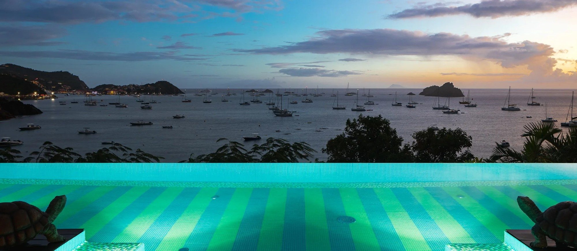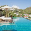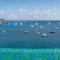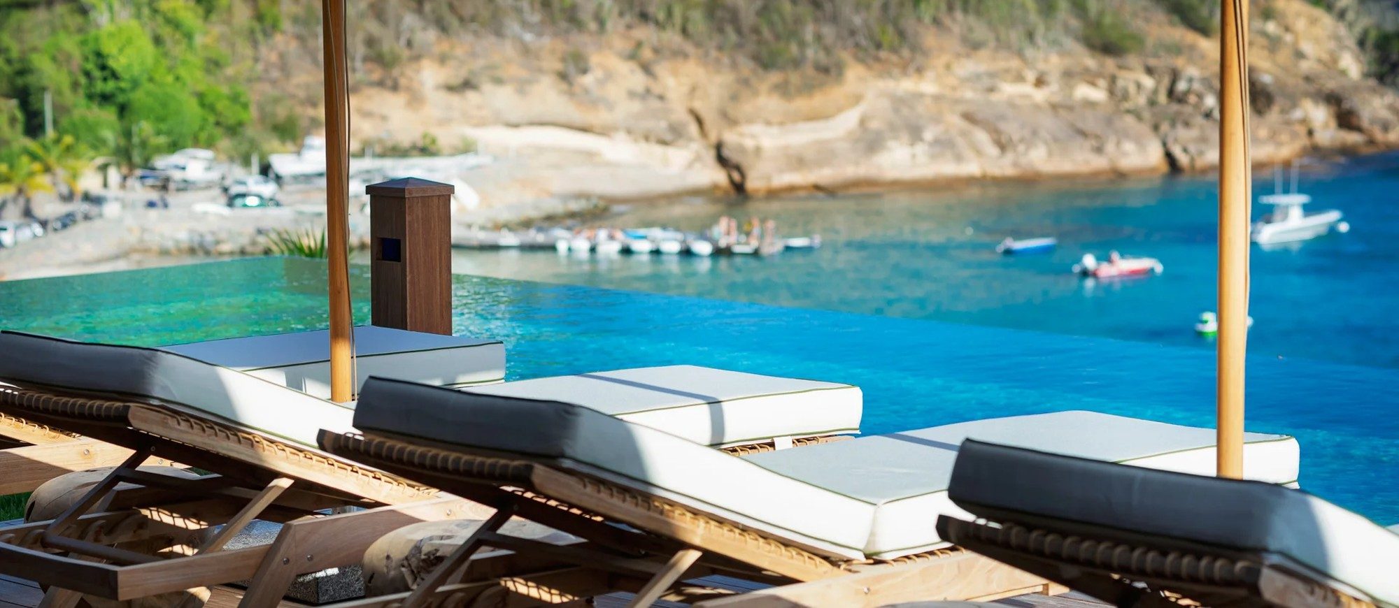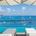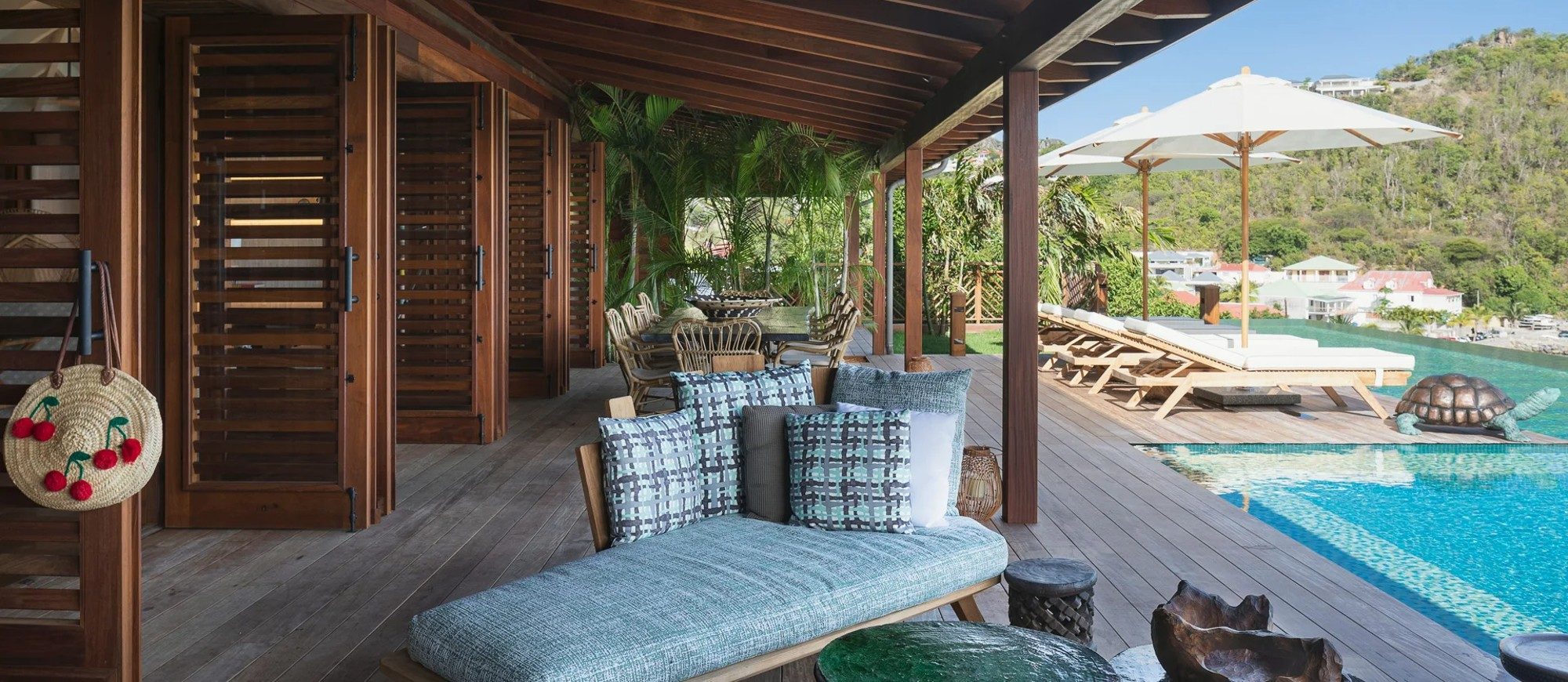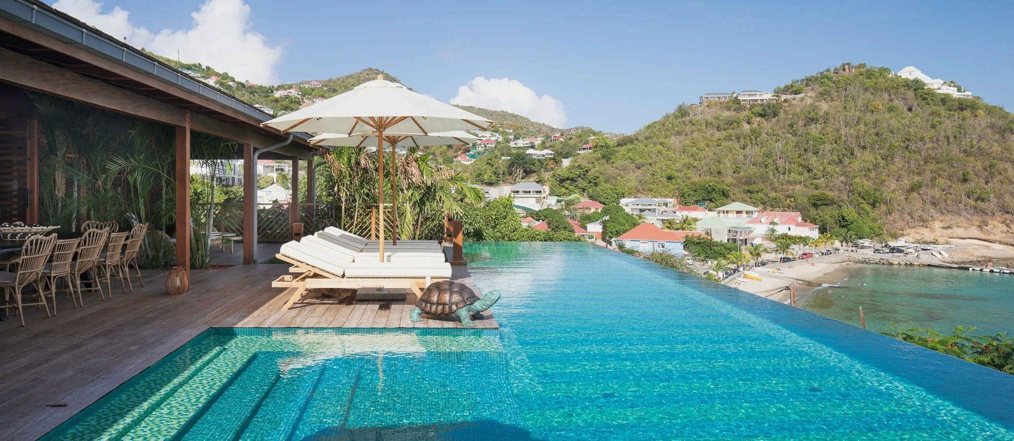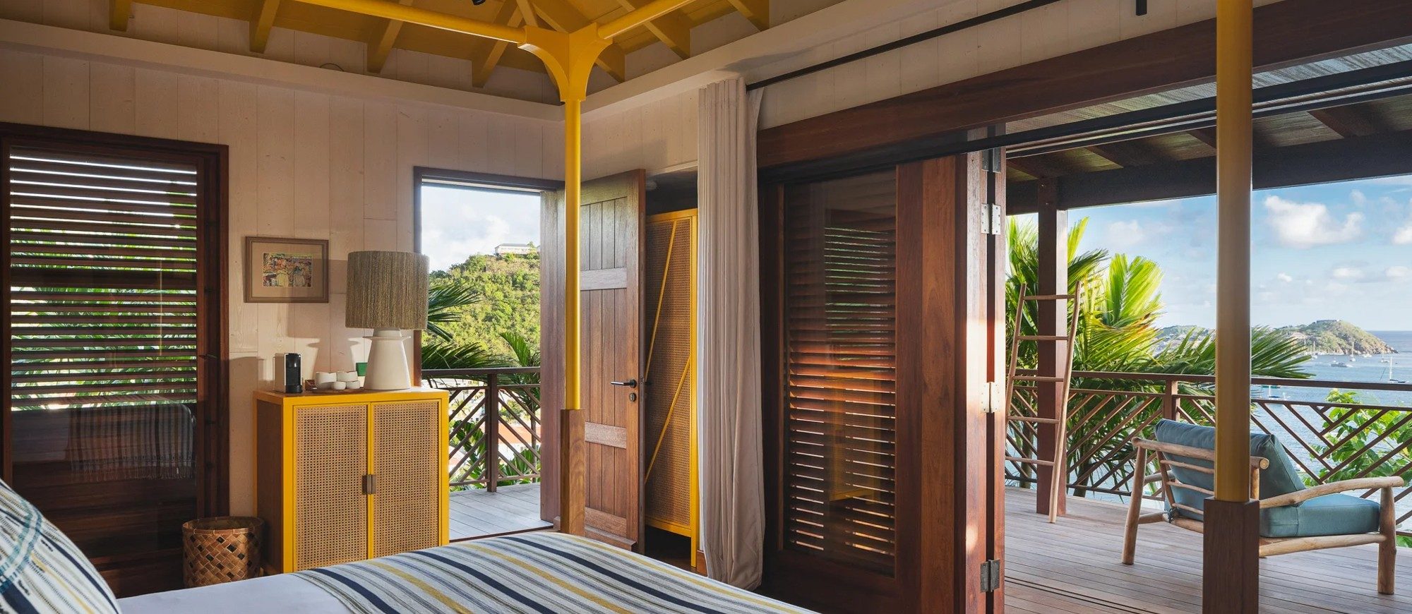 The accommodation is in several bungalows connected by outdoor staircases. The trade winds gently blow through the indoor spaces which features vaulted ceilings, louvered windows and beautiful wooden floors. At the front of the main building, the long terrace facing the sparkling waters of Corossol and the yachts sailing on the ocean. The heated swimming pool sparkles under the St-Barth’s sun.