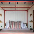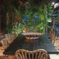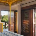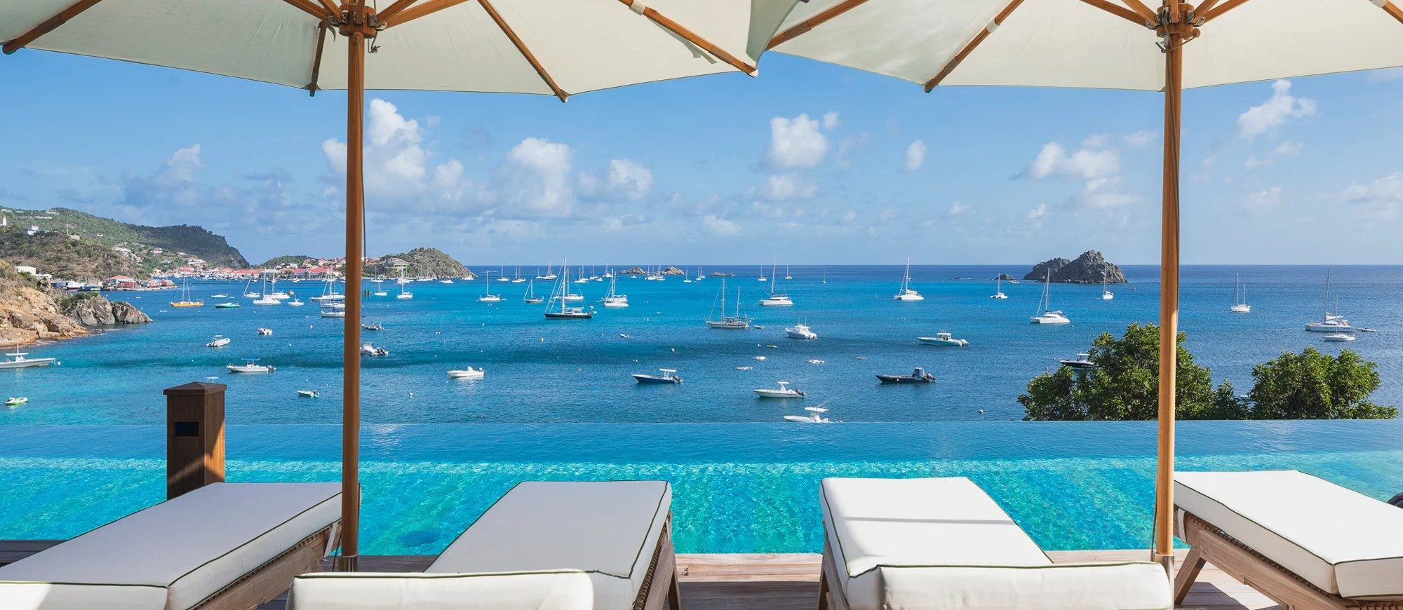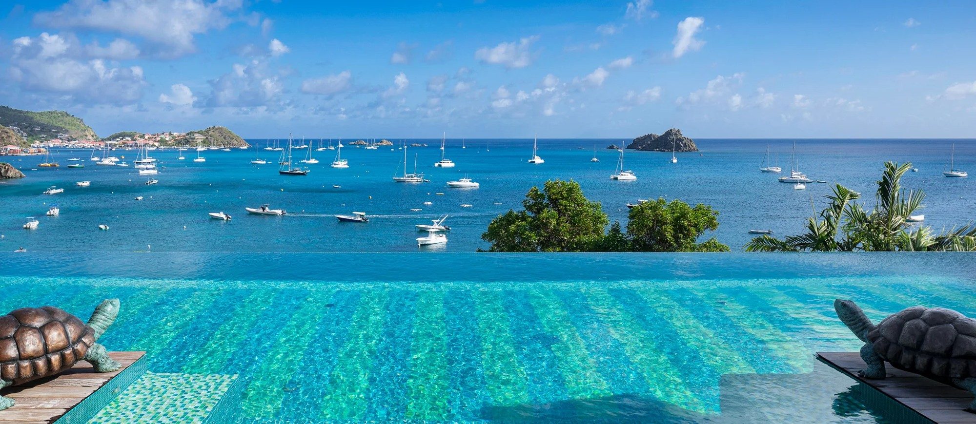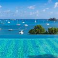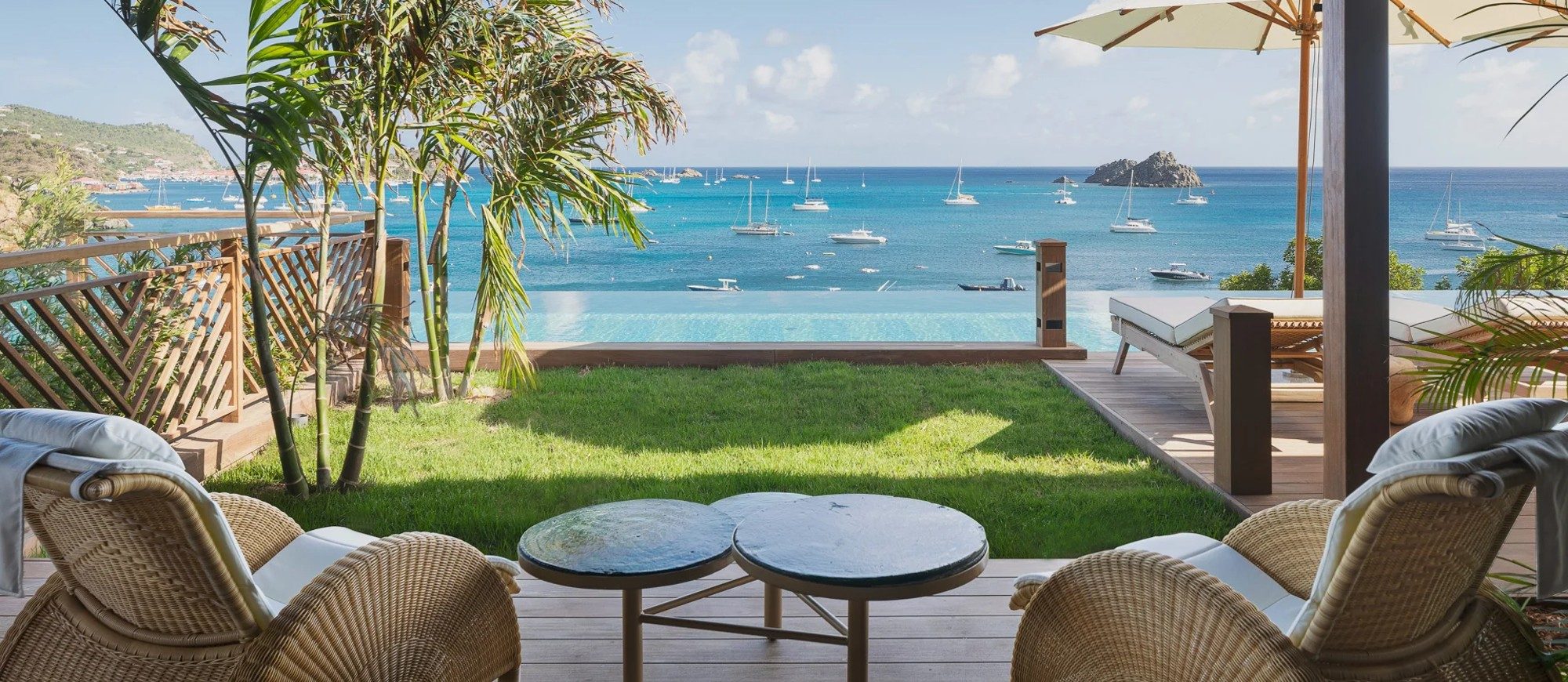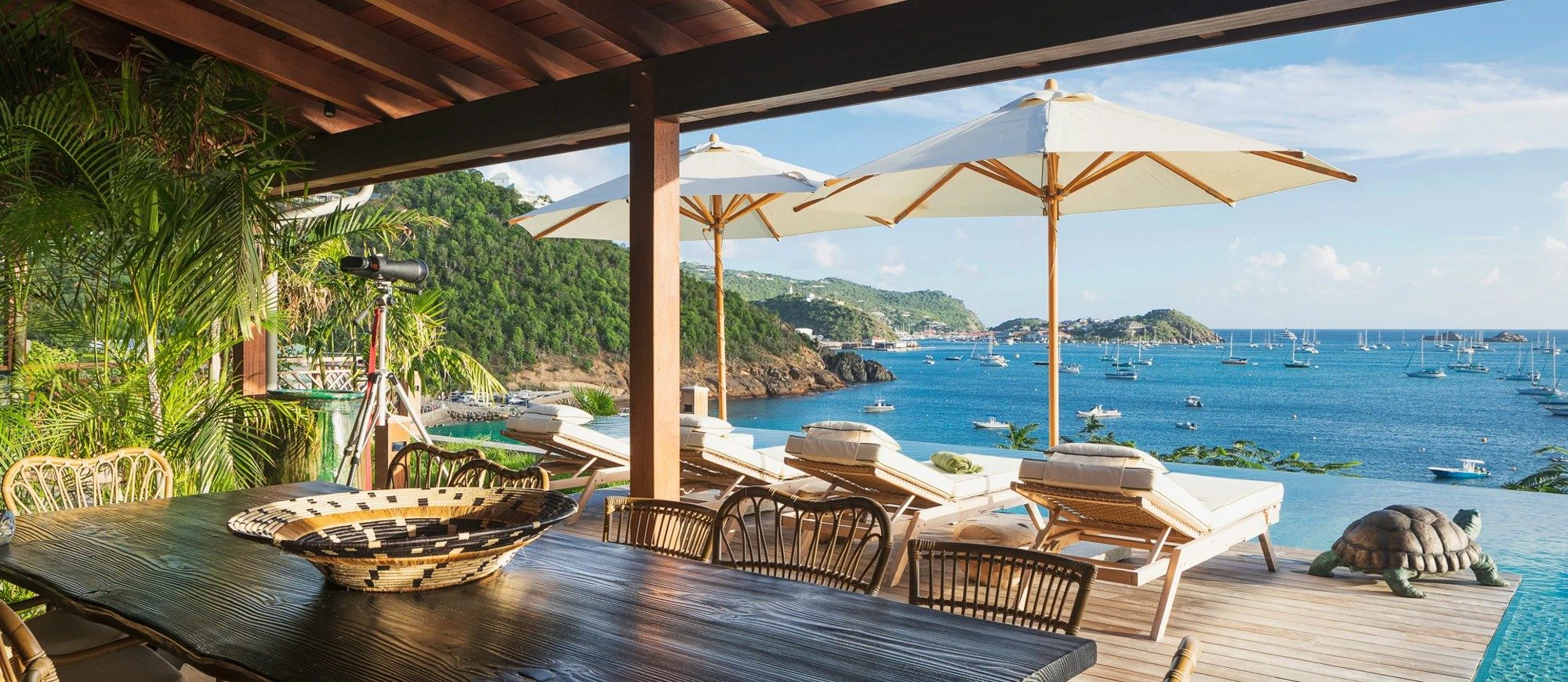 The accommodation is in several bungalows connected by outdoor staircases. The trade winds gently blow through the indoor spaces which features vaulted ceilings, louvered windows and beautiful wooden floors. At the front of the main building, the long terrace facing the sparkling waters of Corossol and the yachts sailing on the ocean. The heated swimming pool sparkles under the St-Barth’s sun.