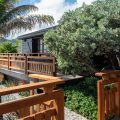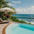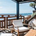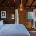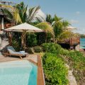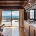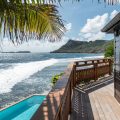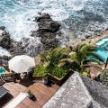 There are four air-conditioned bedrooms with king size beds and en-suite bathrooms. Three of them are in the main building, two are on either side of the living room, and the third one on the lower level, as an independent suite with a kitchenette and a living room. The fourth bedroom is in a separate bungalow and features an outdoor shower. The views over the ocean and the large trees of the property’s garden create a unique ambiance.