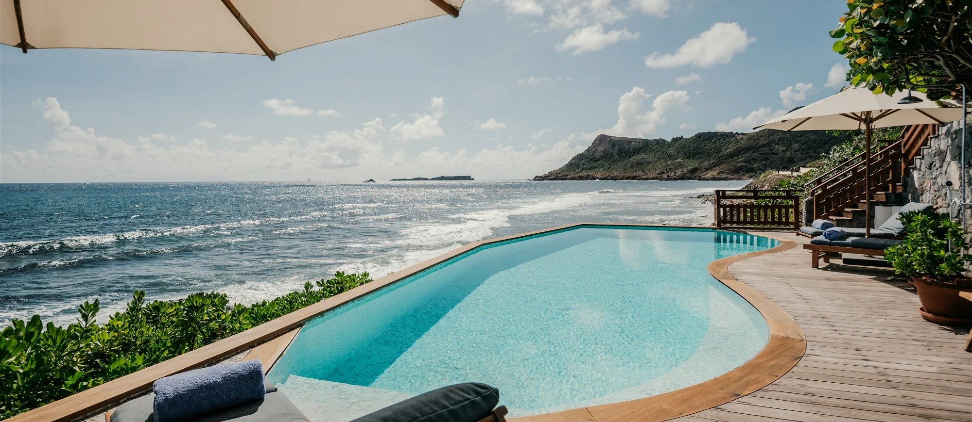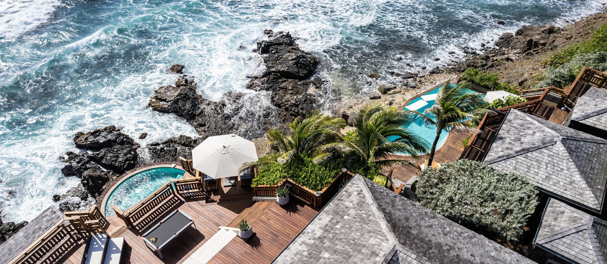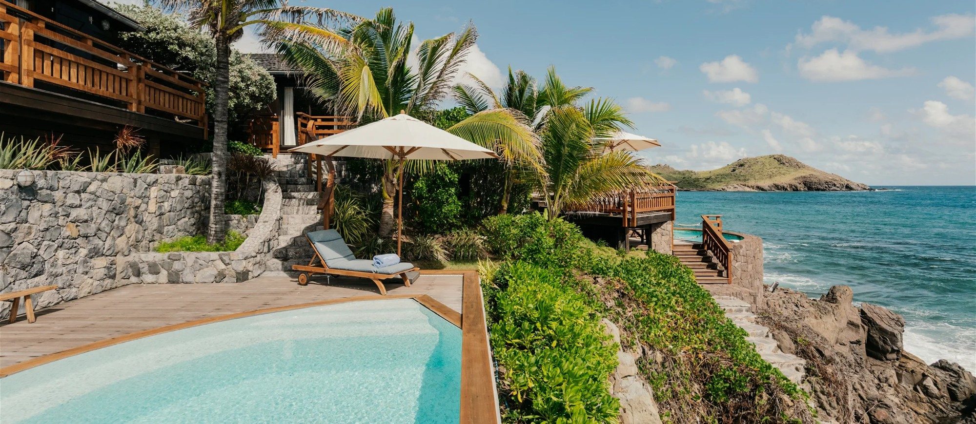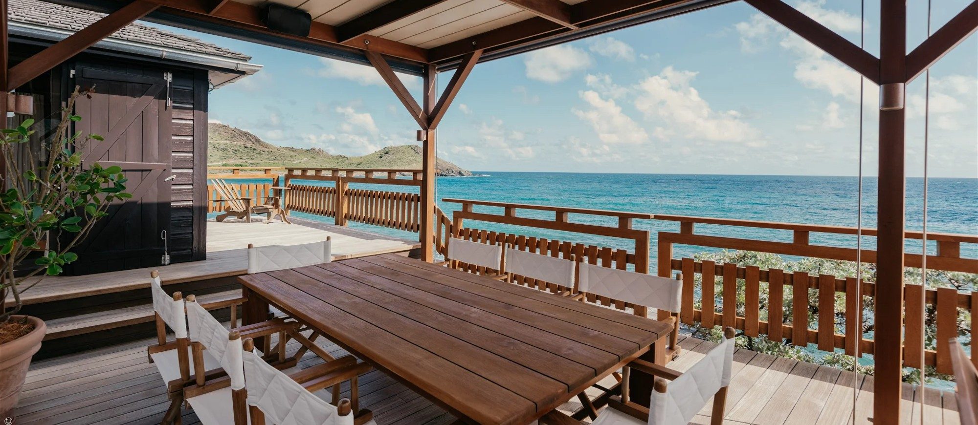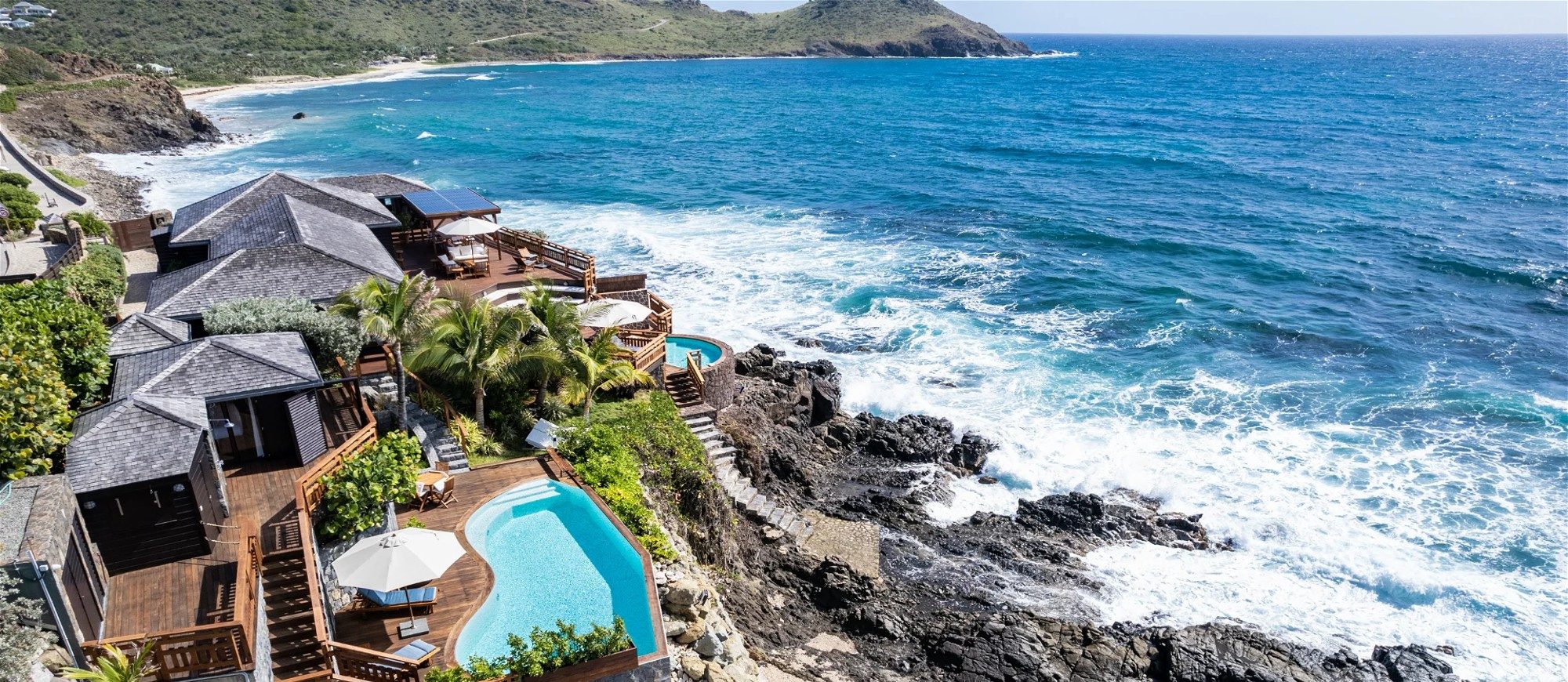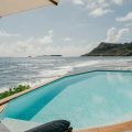 At the front of the villa, in front of a breathtakingly beautiful view, the terrace is furnished with a comfy lounge sheltered by a pergola and an al fresco dining room. On the wooden floor, there are tables, chairs, umbrellas, and even a pool table with benches. A jacuzzi and a heated swimming pool are located on the two terraces a few steps below, with loungers and private areas to enjoy the mild St. Barths air. A hammam and a massage room are also available to guests.