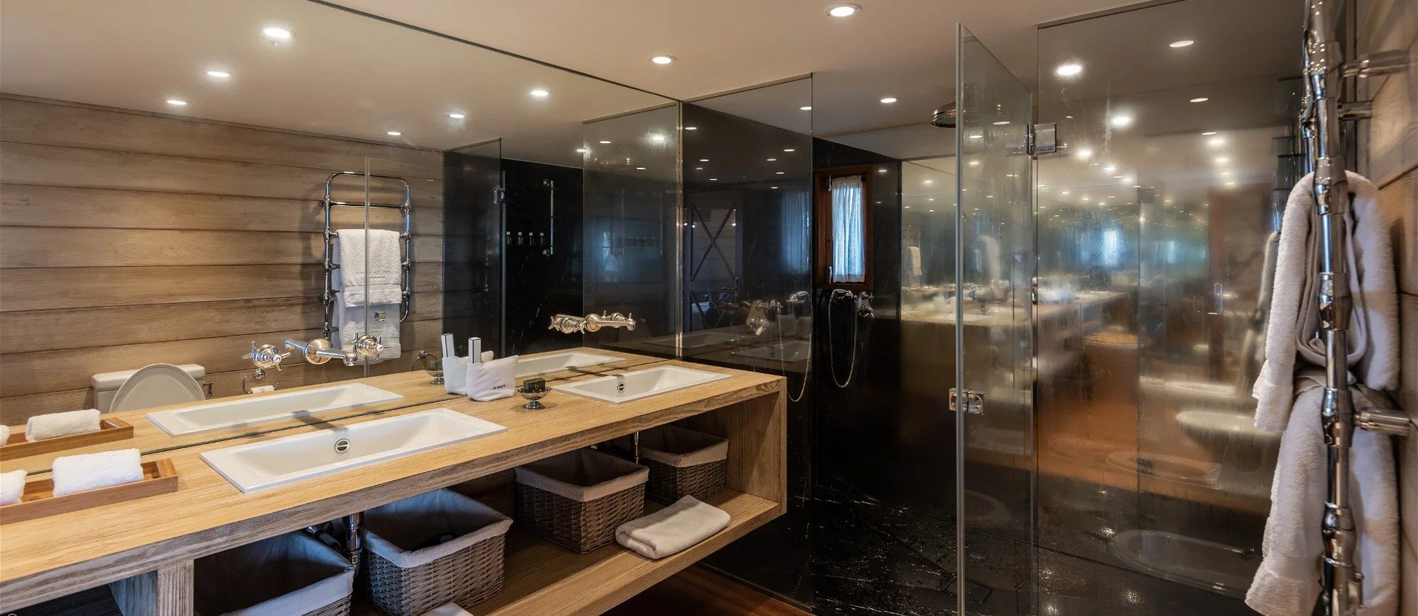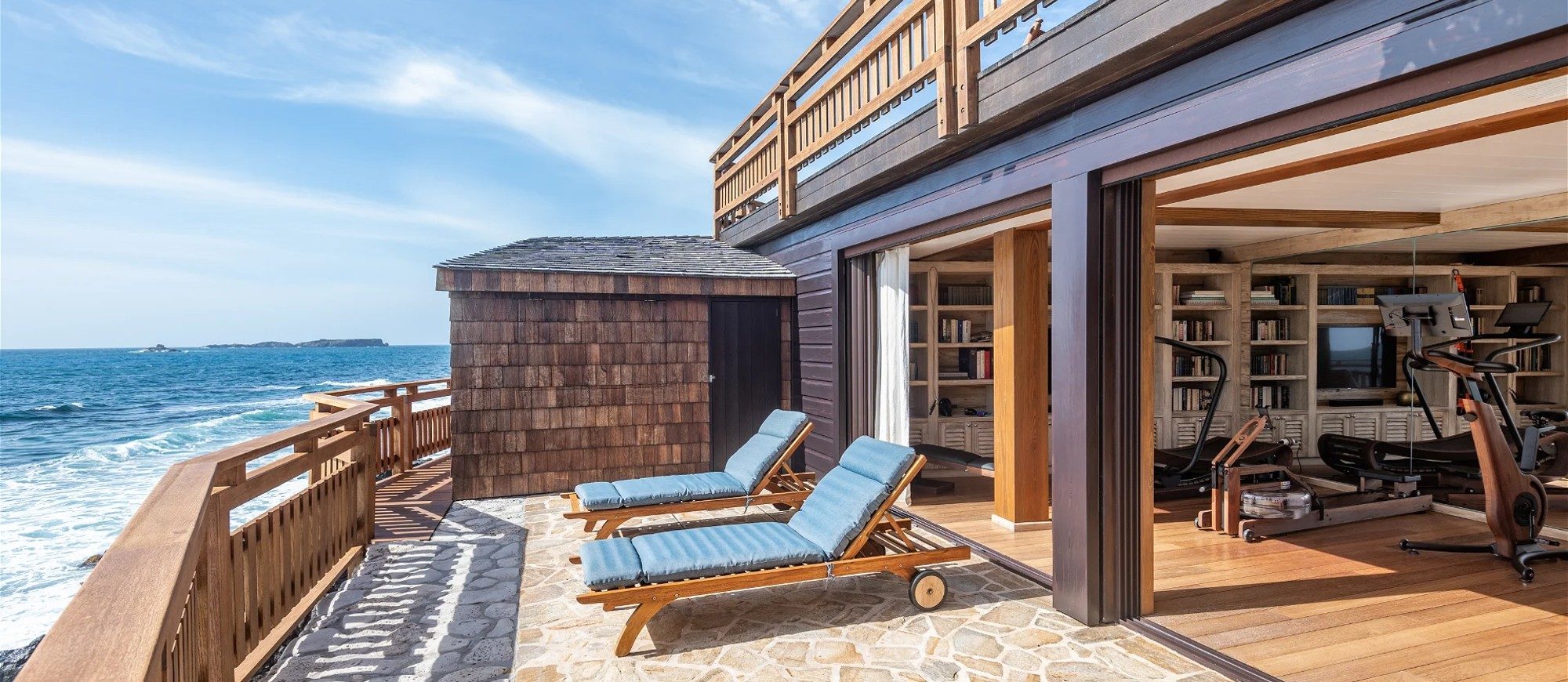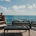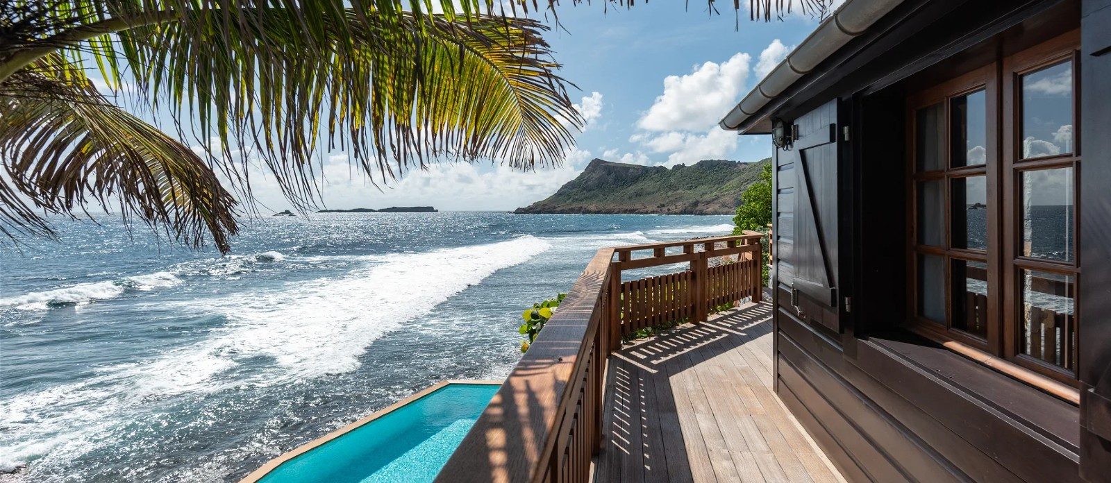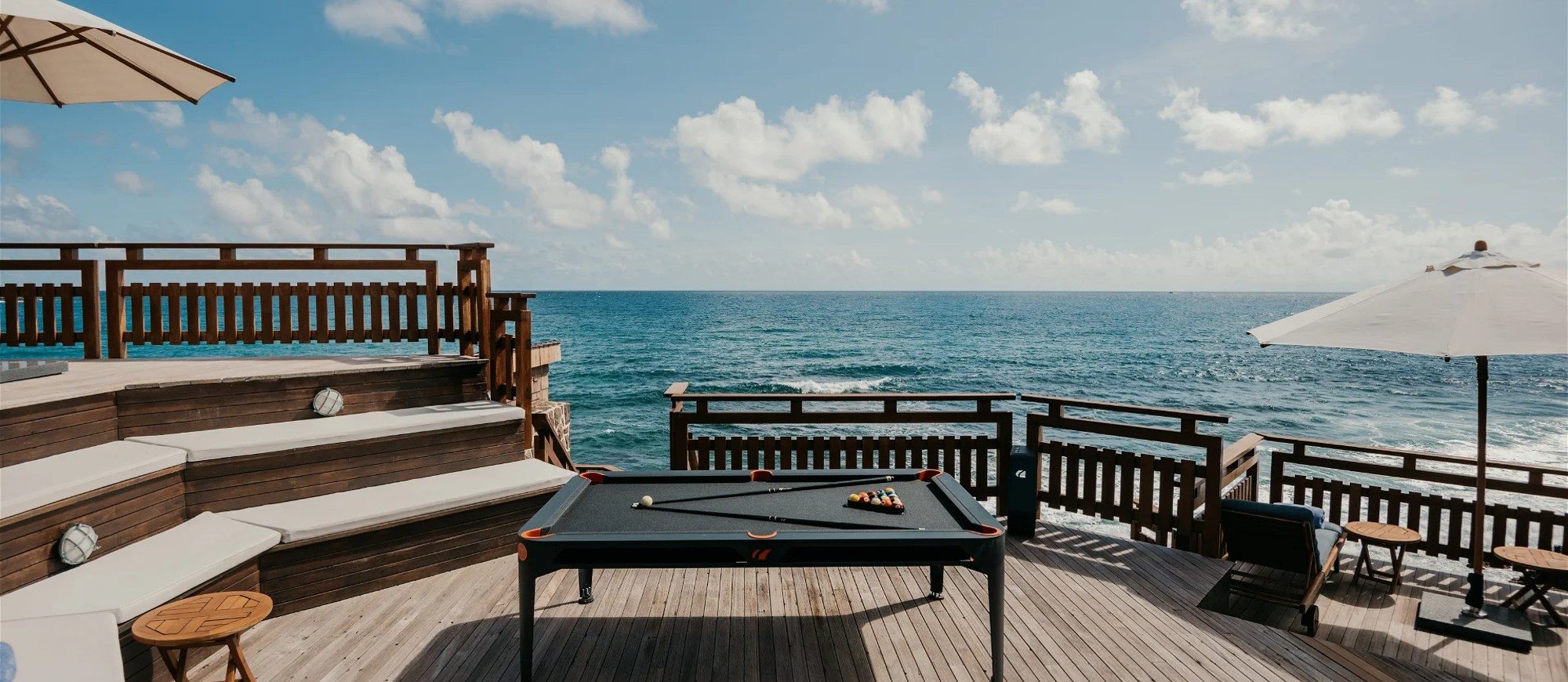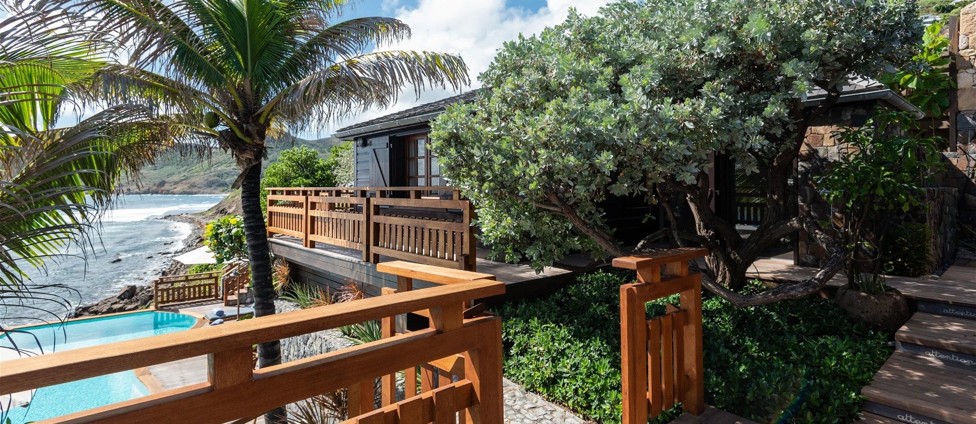At the front of the villa, in front of a breathtakingly beautiful view, the terrace is furnished with a comfy lounge sheltered by a pergola and an al fresco dining room. On the wooden floor, there are tables, chairs, umbrellas, and even a pool table with benches. A jacuzzi and a heated swimming pool are located on the two terraces a few steps below, with loungers and private areas to enjoy the mild St. Barths air. A hammam and a massage room are also available to guests.