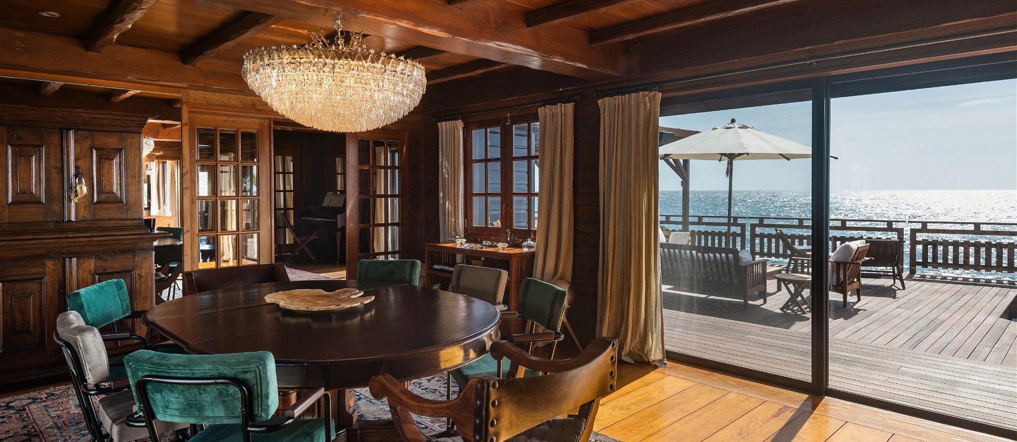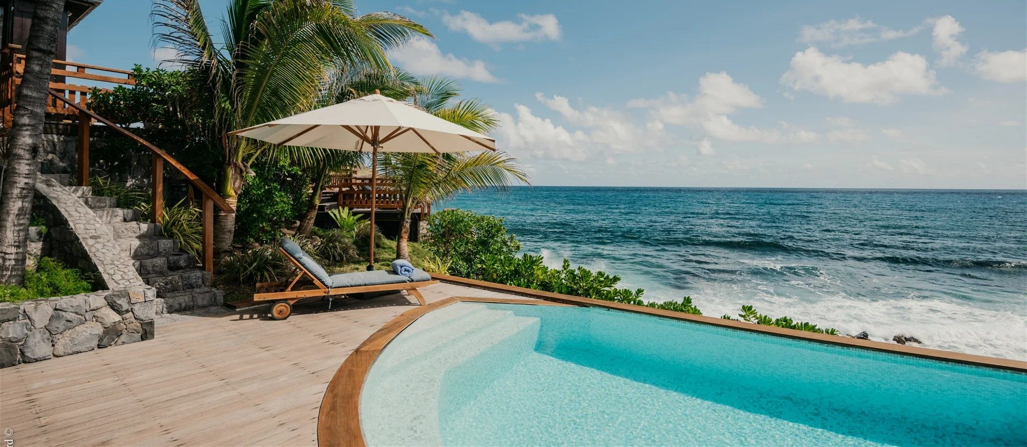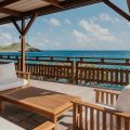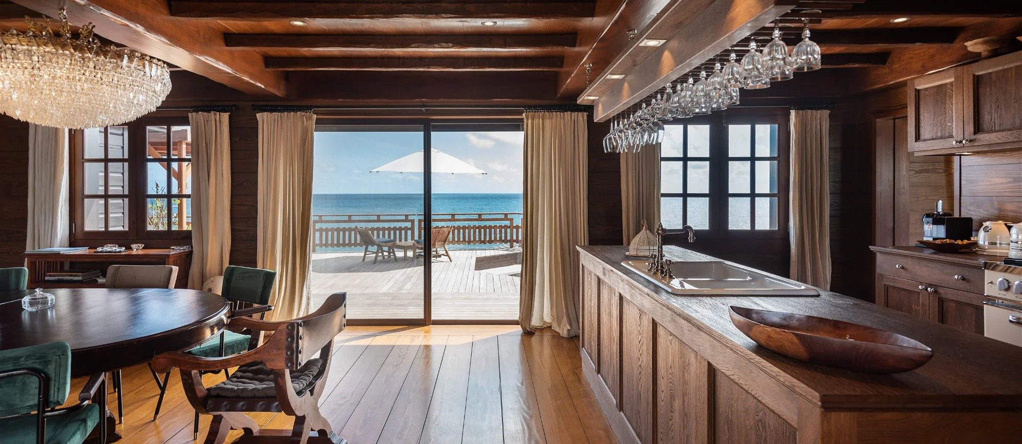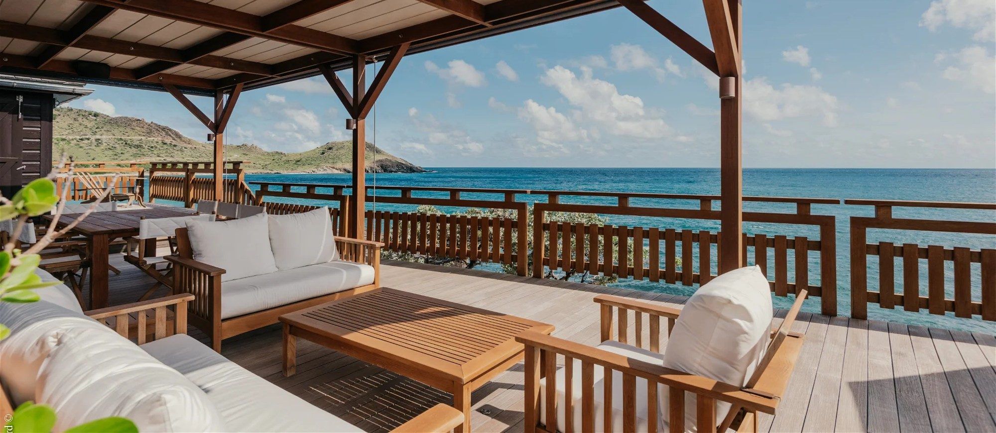 Built over two levels facing a 180° view, this is a very private villa offering a unique location close to the deep blue ocean. On the upper level, the living room is furnished with sofas, armchairs and coffee tables in a decor of polished wood, weathered beams and shiny parquet. Among the furnishings of this luxurious villa, guests will find the chiseled sideboard, the upright piano and the glittering chandelier. The dining room, also made of wood, welcomes guests close to the fully equipped kitchen with bar opening onto the spacious terrace.