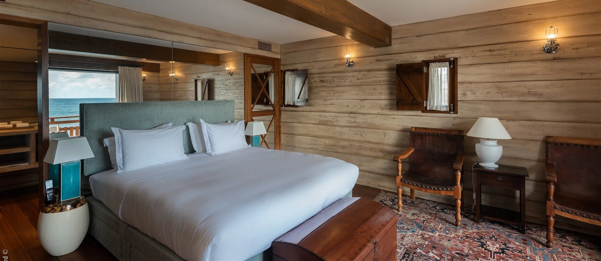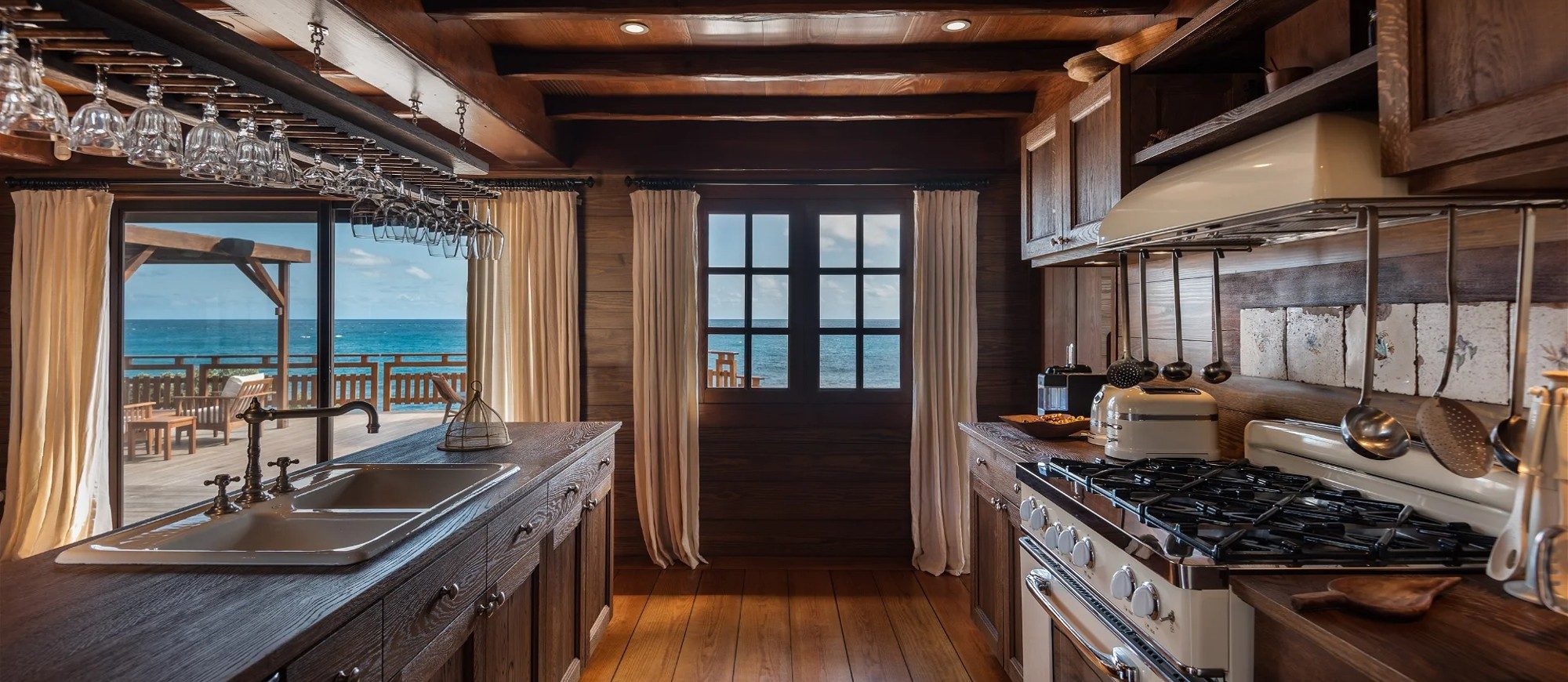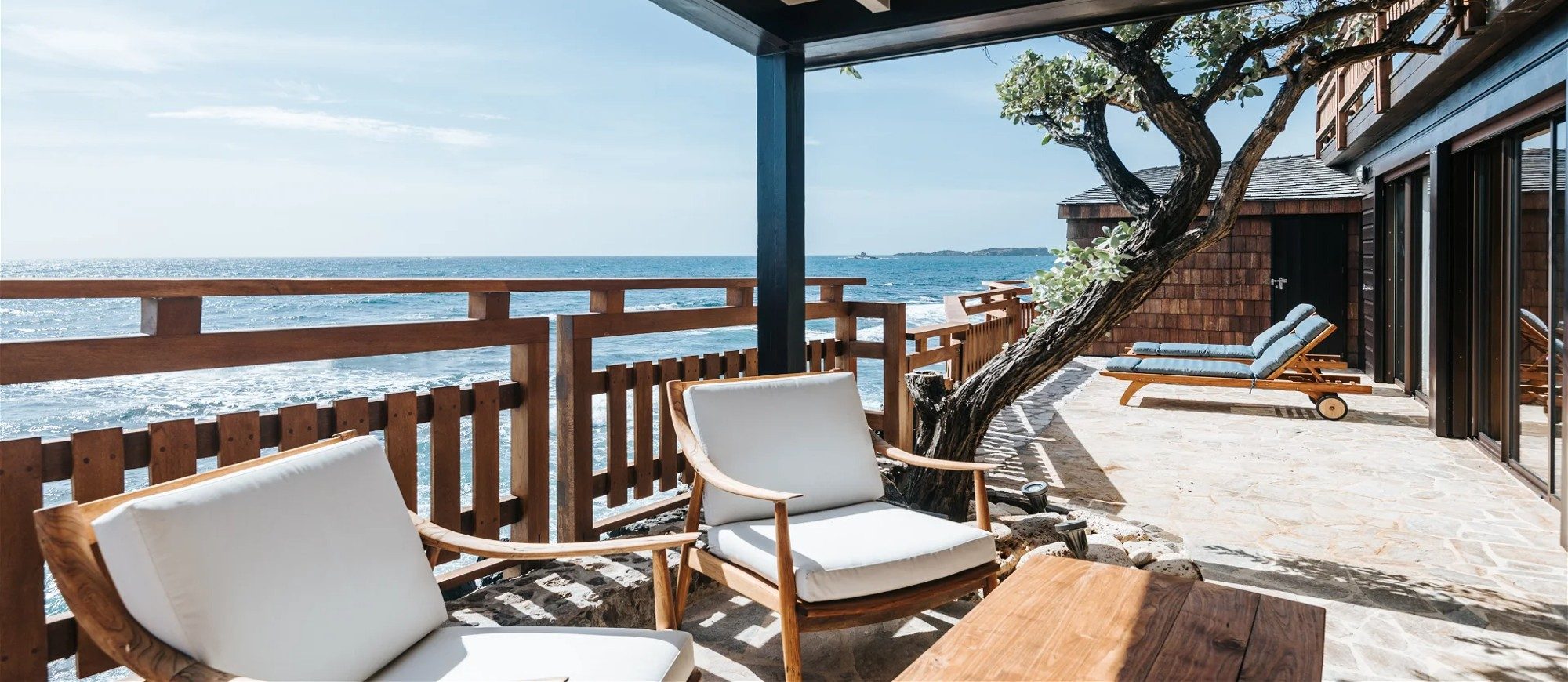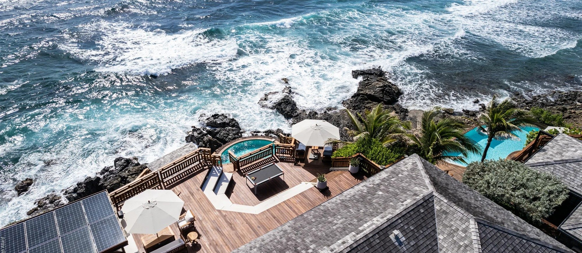 Built over two levels facing a 180° view, this is a very private villa offering a unique location close to the deep blue ocean. On the upper level, the living room is furnished with sofas, armchairs and coffee tables in a decor of polished wood, weathered beams and shiny parquet. Among the furnishings of this luxurious villa, guests will find the chiseled sideboard, the upright piano and the glittering chandelier. The dining room, also made of wood, welcomes guests close to the fully equipped kitchen with bar opening onto the spacious terrace.