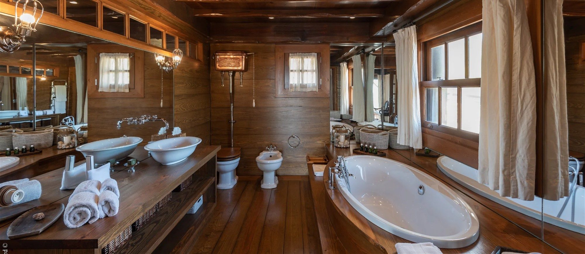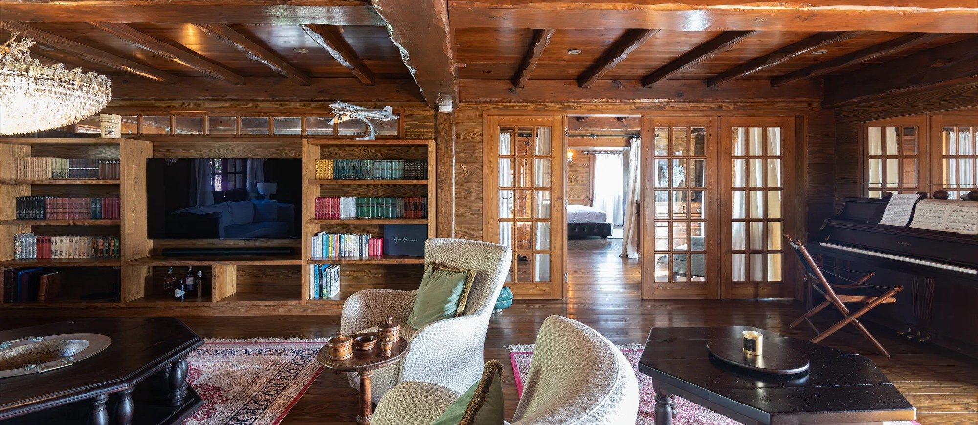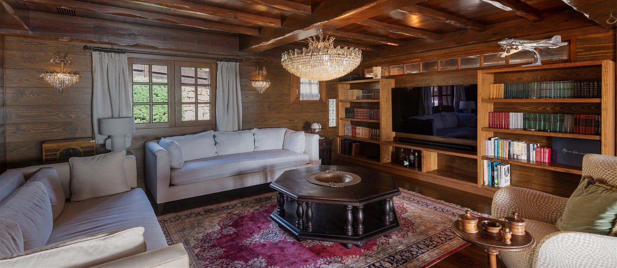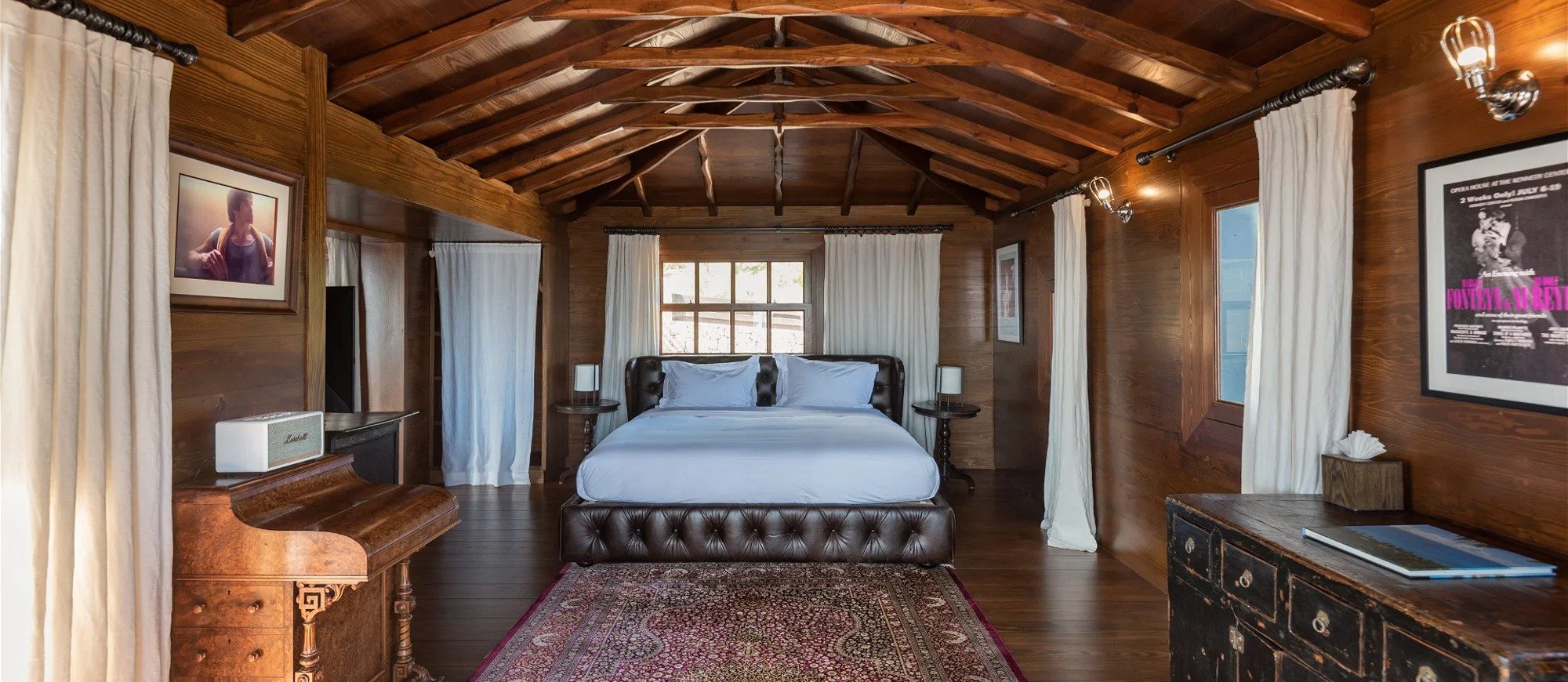 Built over two levels facing a 180° view, this is a very private villa offering a unique location close to the deep blue ocean. On the upper level, the living room is furnished with sofas, armchairs and coffee tables in a decor of polished wood, weathered beams and shiny parquet. Among the furnishings of this luxurious villa, guests will find the chiseled sideboard, the upright piano and the glittering chandelier. The dining room, also made of wood, welcomes guests close to the fully equipped kitchen with bar opening onto the spacious terrace.