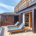 On the main level. Sun loungers, parasols, living area on the covereted terrace.