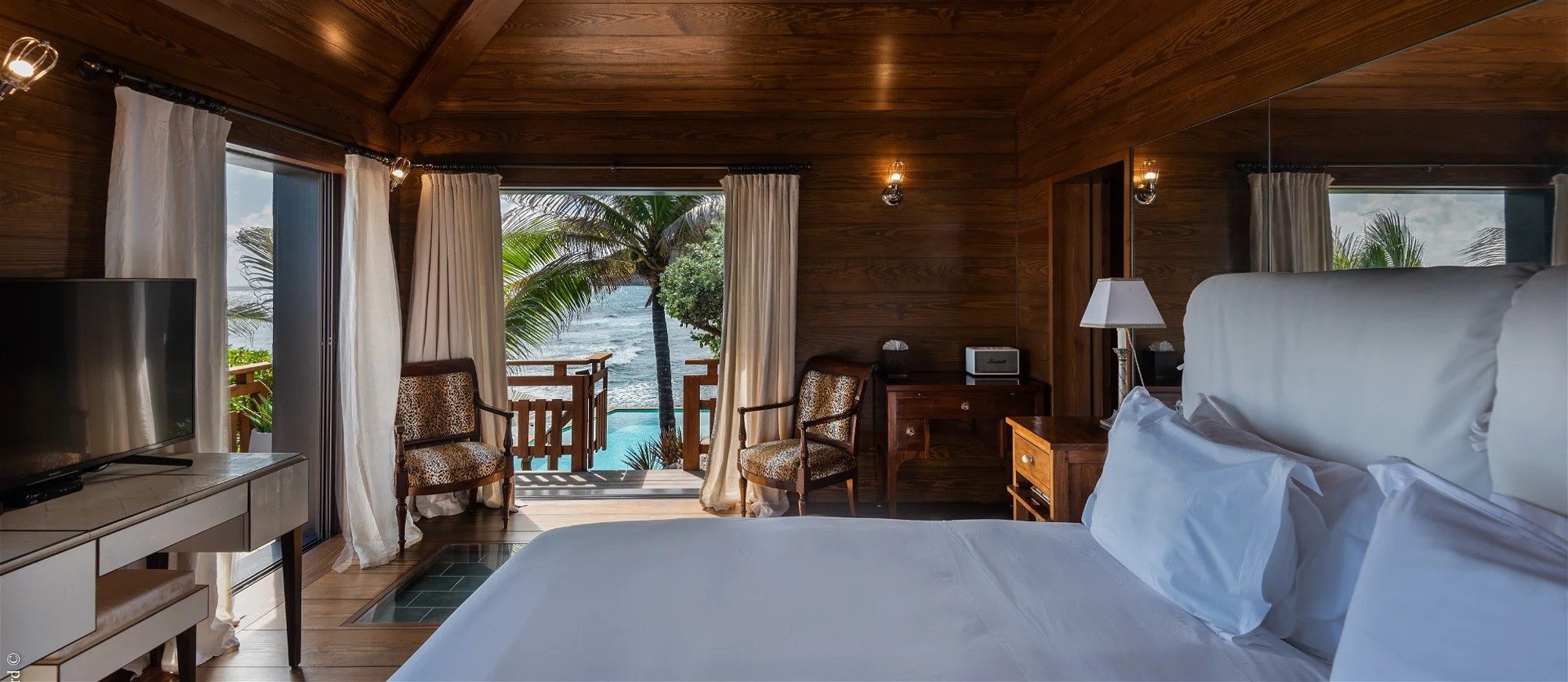 In the main building. King size bed, air conditioning, safe, HD-TV, dish network, Apple TV, WIFI. Ensuite bathroom with rain shower, hairdryer, bathrobes, towels and beach towels. Ocean view.